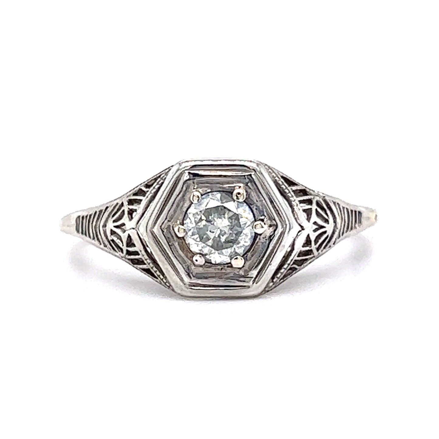 .45 Geometric Art Deco Engagement Ring in 18K White Gold. This gorgeous Art Deco engagement ring features a .45 carat natural diamond in 18k white gold. The center stone has a slightly warm hue and is set in six prongs and is mounted in a hexagon setting. The gallery and shoulders are decorated with Art Deco filigree that accentuate the 18k white gold band. This vintage engagement ring showcases beauty in all of its details that can be admired for years to come.