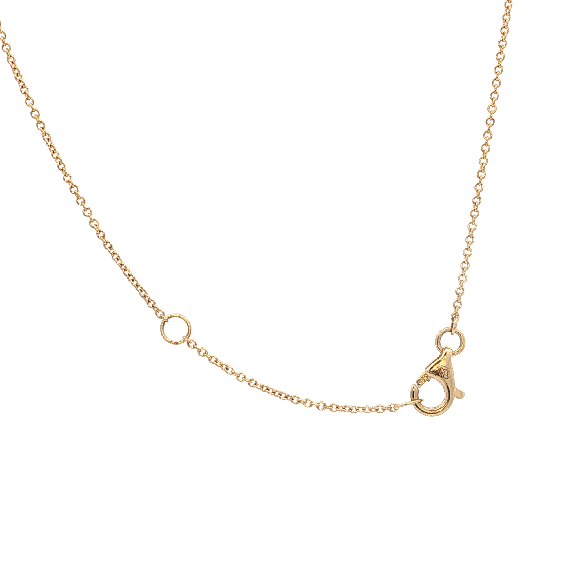 This diamond dangle necklace features 9 bezel-set round brilliant cut diamonds totaling .46 carats along a 16-17 inch chain of 14 karat yellow gold. Each diamond measures 2.5mm and weighs .05 carats, with VS2-SI1 clarity and G-H color. The diamonds are spaced individually along the chain, each sitting in its own bezel setting that wraps a rim of gold around the stone. The stations create movement and light reflection as the necklace is worn.
