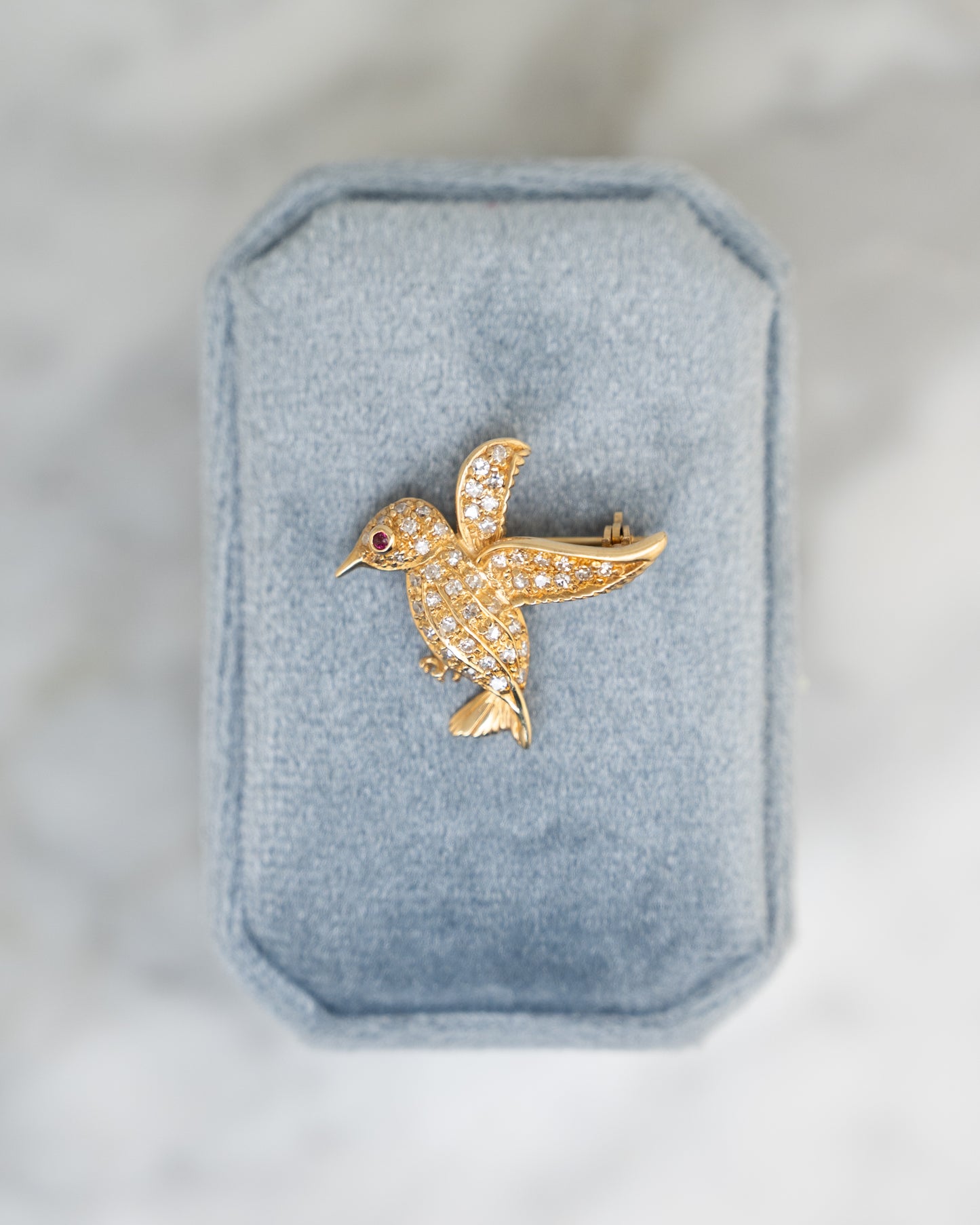 This 14 karat yellow gold hummingbird brooch features .46 carats of round brilliant cut diamonds (VS2-SI1 clarity, G-H color) in a pave setting with a .01 carat ruby eye. The diamonds catch light with every movement, similar to a hummingbird's flight, while the ruby eye adds a bold splash of color to the design. The bird's body glitters, showing off the diamonds' brightness.