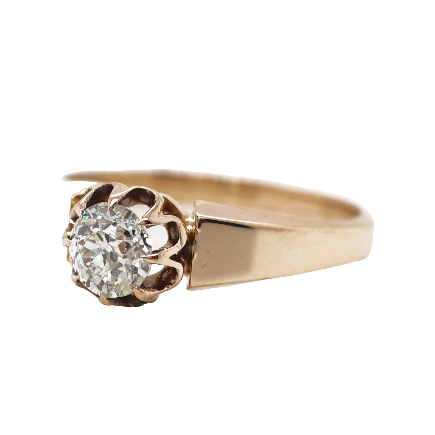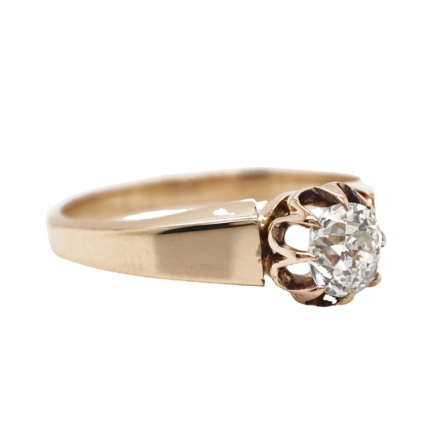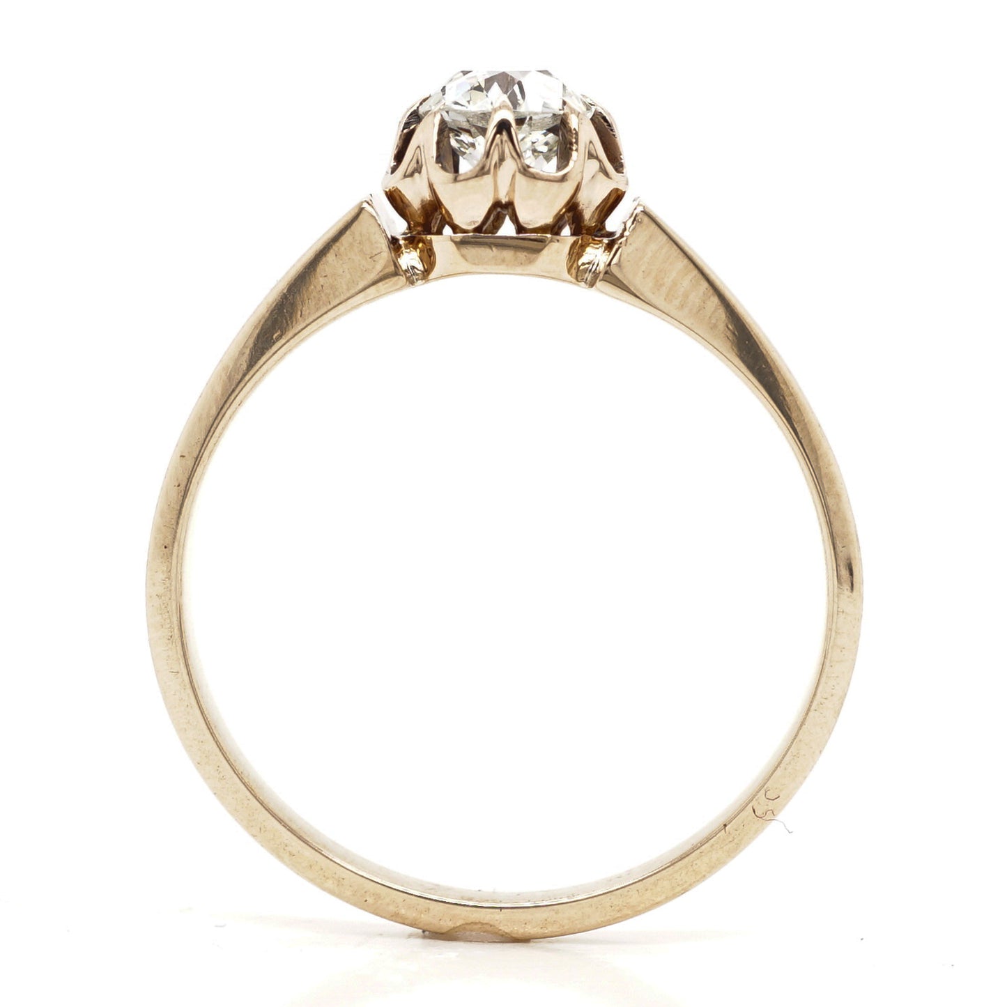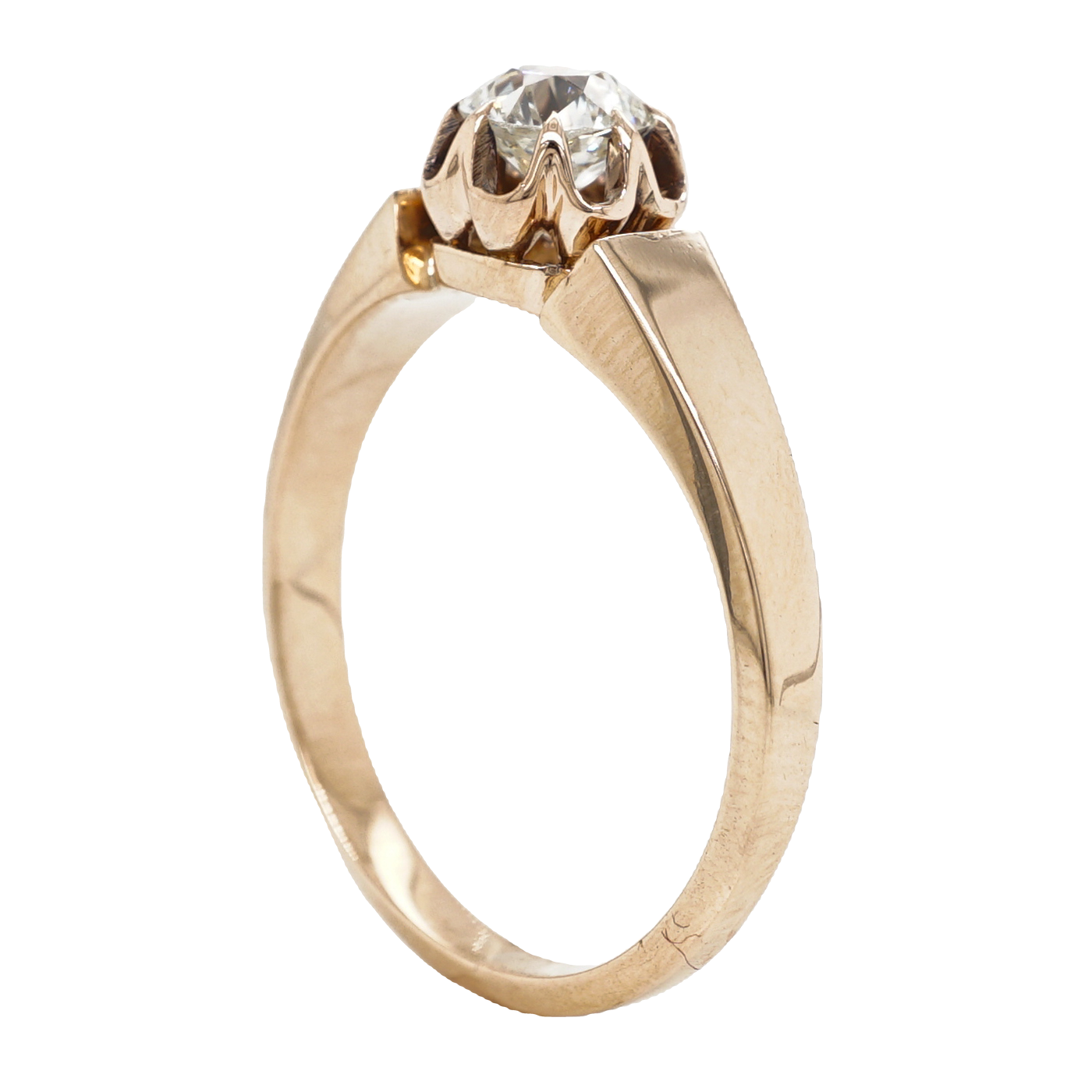 .47 Victorian Diamond Engagement Ring in 14K Rose Gold. This Victorian engagement ring features a .47 carat diamond on a tapered 14k rose gold band. The glittering Old European Cut diamond is near colorless and mounted on a vintage crown basket. The shank is flat and tapered, finished in a high polish 14 karat rose gold. This vintage Victorian ring will flatter any bride to be!