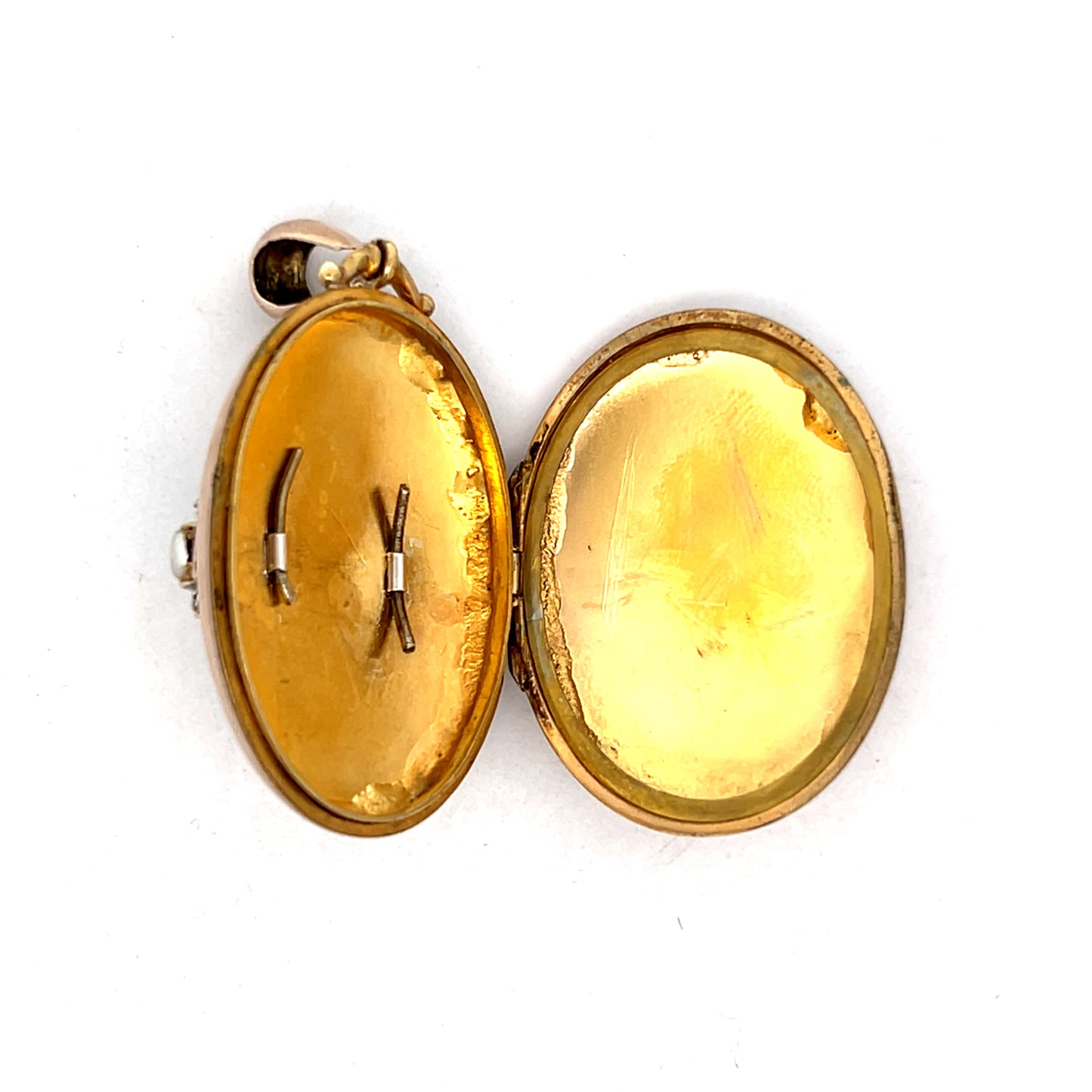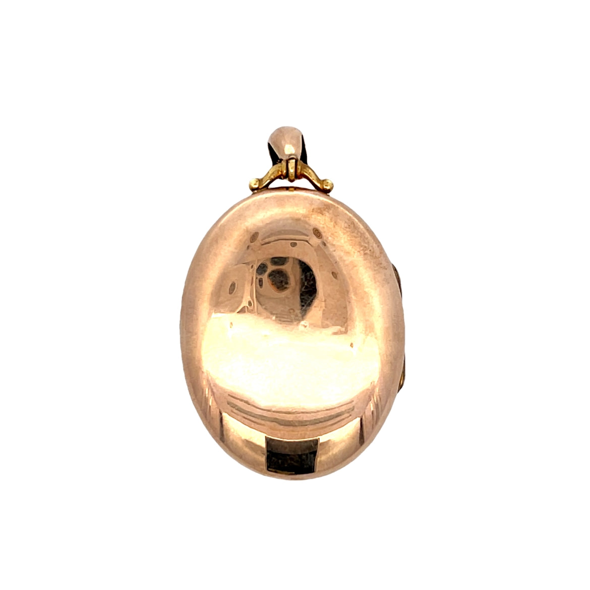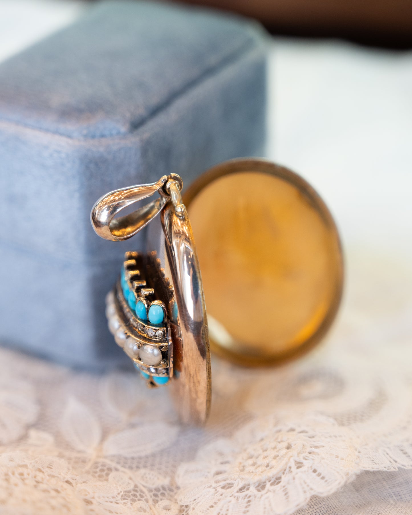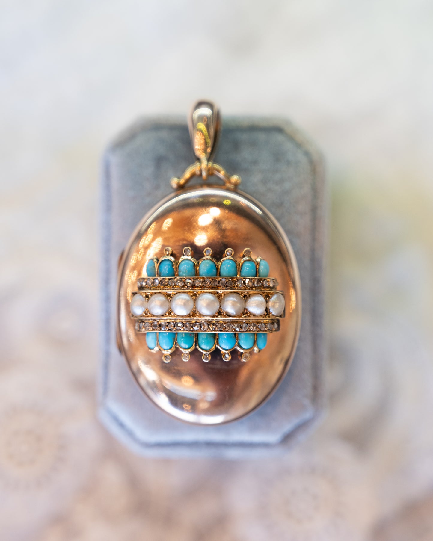 This antique Victorian locket pendant necklace is made from 10 karat rose gold with an oval shape that opens to store small mementos. The locket contains 48 tumbled grey diamonds in rose-cut shapes, each weighing .01 carats for a total diamond weight of .48 carats. Fourteen pearls measuring 3.25 x 2.75mm each add a soft, iridescent element to the design. A cabochon-cut turquoise stone provides a bright blue-green contrast against the warm rose gold, grey diamonds, and white pearls. The combination of three different natural materials—diamonds, pearls, and turquoise—creates a design that reflects authentic Victorian-era jewelry styles.