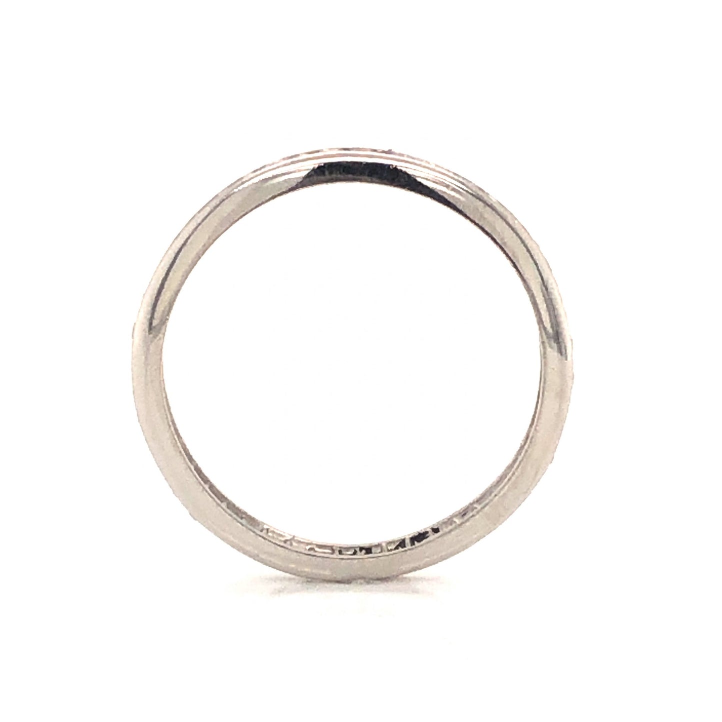 A secure and shimmering wedding band for everyday wear. This Art Deco eternity band features .48 carats of single cut diamonds in platinum. Forty-eight (48) glittering diamonds are securely set in a channel around the entire band. An antique ring with modern sensibility, this wedding band is perfect to pair with any era of engagement ring. Finished in high polished platinum, this wedding band has a sleek design that looks lovely on everyone.