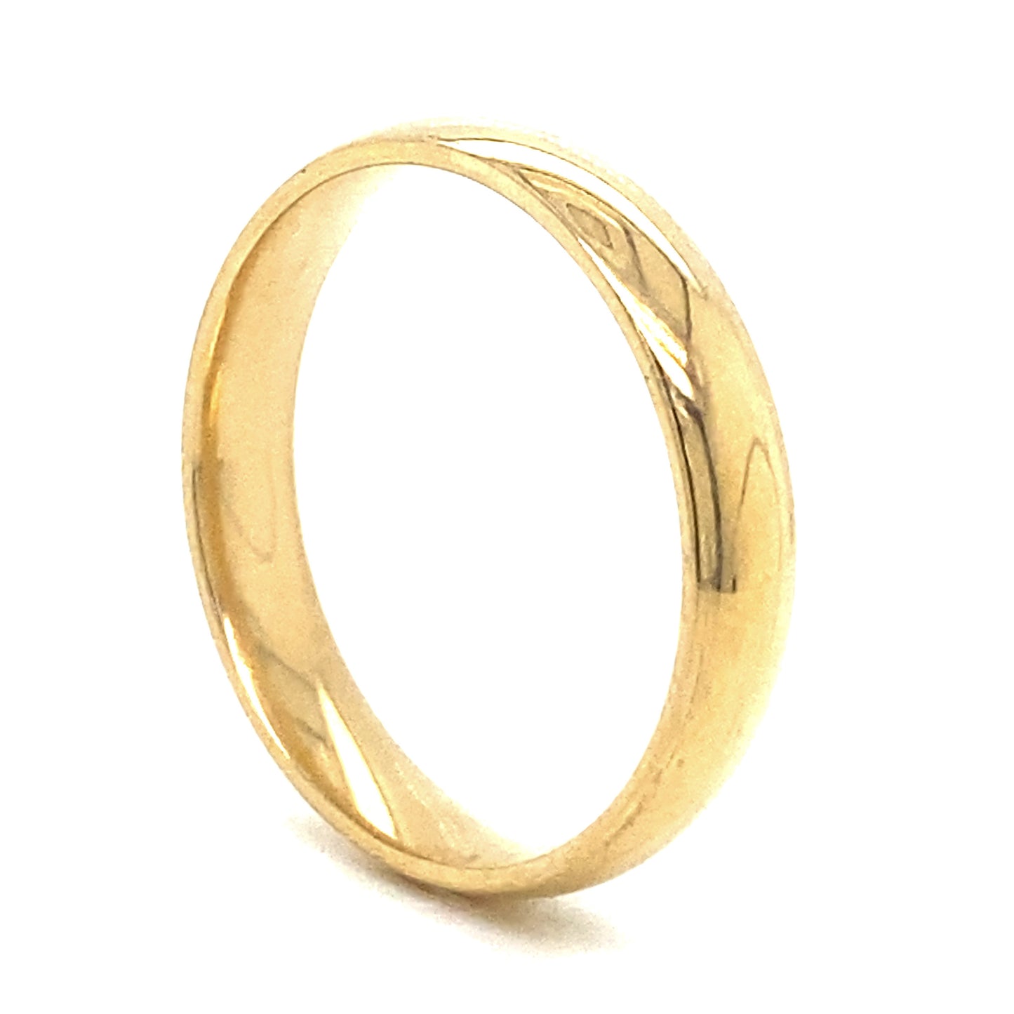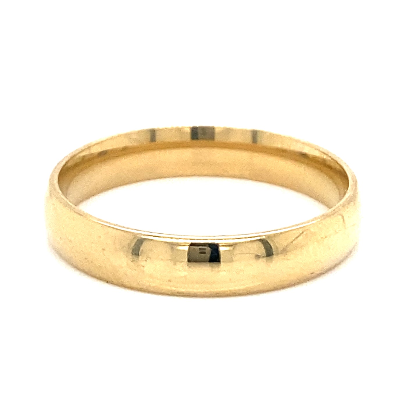 4mm Half Round Mens Wedding Band in 14k Yellow Gold. This mens half-round, comfort fit light wedding band is perfect for everyday wear. The ring measures 4.19mm wide and weighs just over 4 grams. Finished in high polished 14 karat yellow gold, this mens band is timeless in style.
