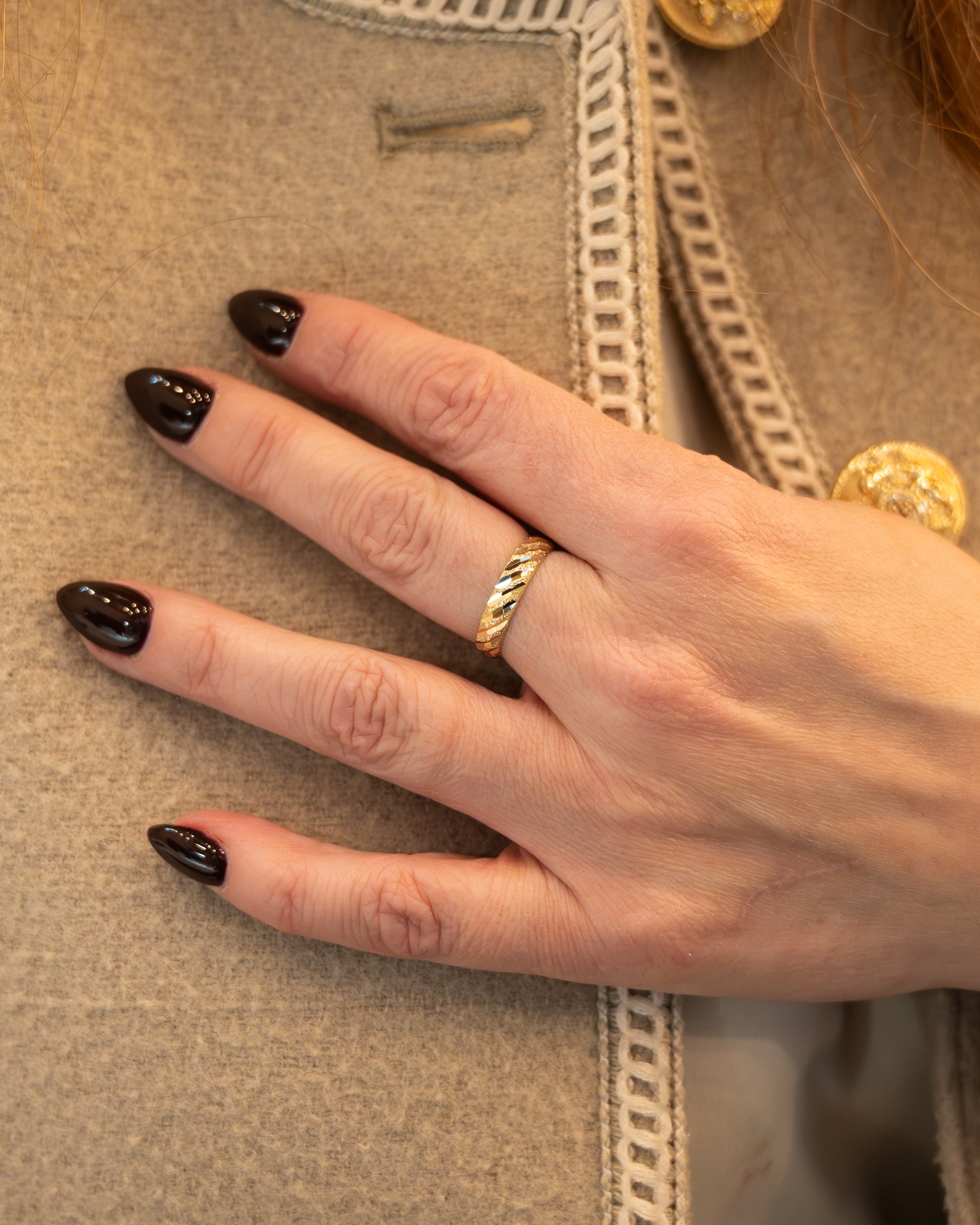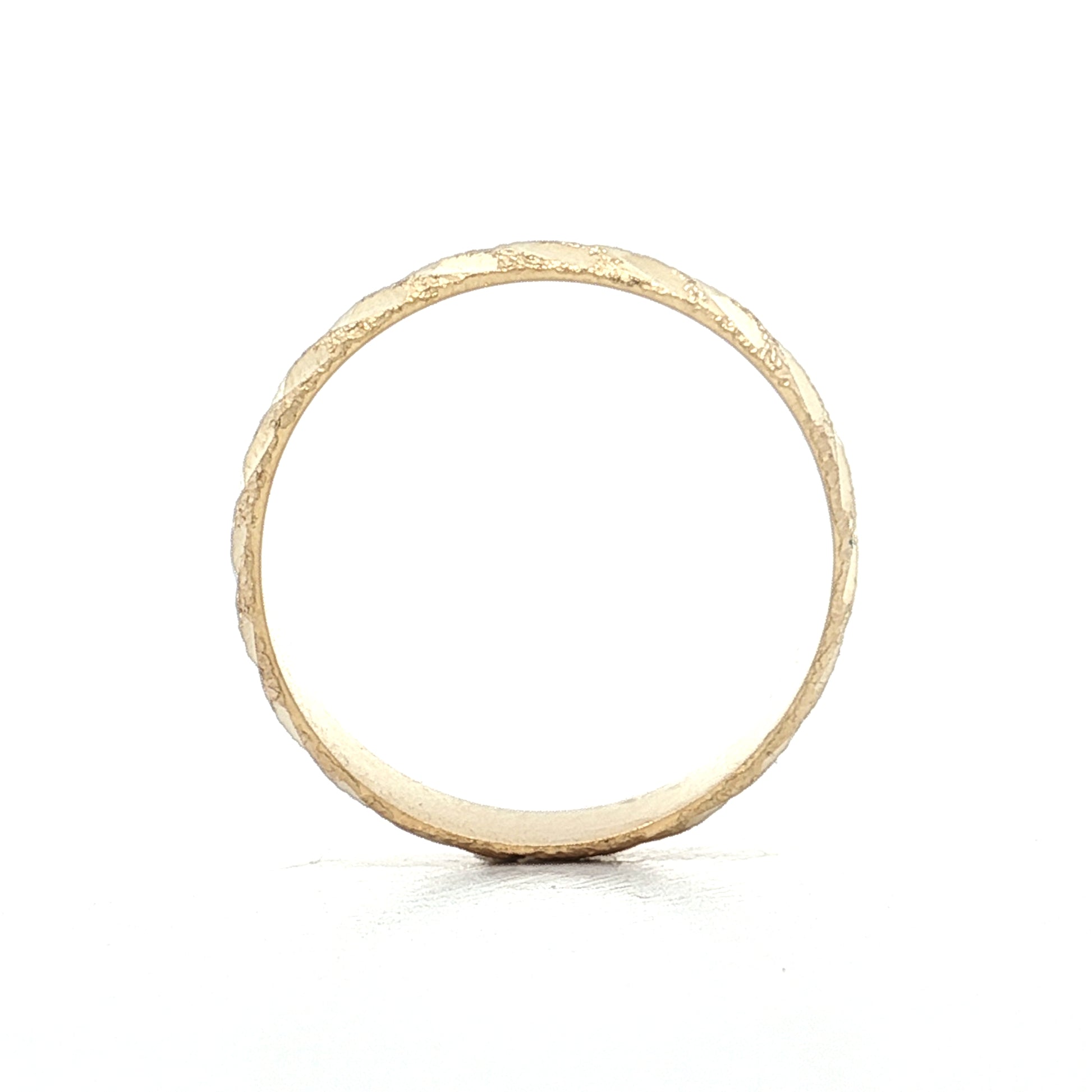 The half-round interior curves gently against the finger, making it more comfortable for all-day wear than a flat interior profile. The 4mm width provides noticeable presence on the hand without excessive bulk. The textured finish on the yellow gold also helps hide minor scratches better than a highly polished surface would over time.