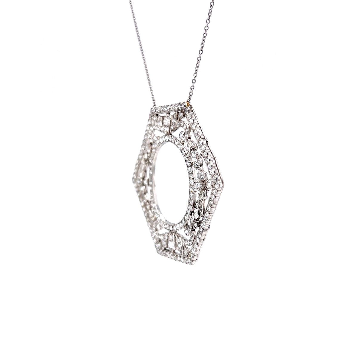 This elegant, Art Deco pendant necklace features 5.00 carats of natural diamonds in platinum. This is a necklace that truly pairs the interesting geometric shapes of the period with the fineness of the filigree work being produced at that time. Set with only old European cut diamonds, this delicate platinum diamond necklace truly glitters from any angle. For the lover of refined and timeless Art Deco jewelry, this necklace has it all.