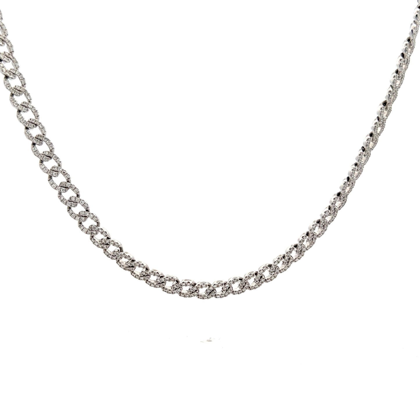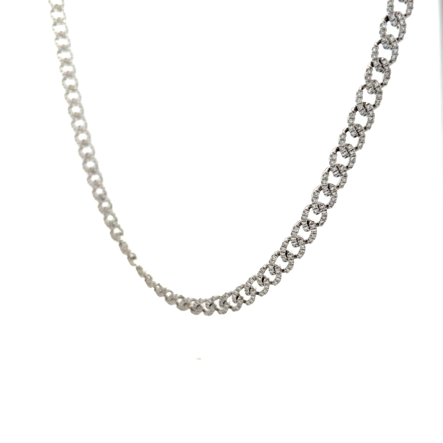 Elevate your necklace style with this modern and sleek diamond chain. Crafted in 18 karat white gold, this piece features round brilliant cut natural diamonds on every link of the chain. The diamonds have a total weight of 5.00 carats and have a gorgeous G color.  The 18k white gold chain measures 16 inches and the links are a flat curb style which will allow the necklace to sit flat.  Perfect for layering or wearing on its own this necklace will work great on its own or layered with others.