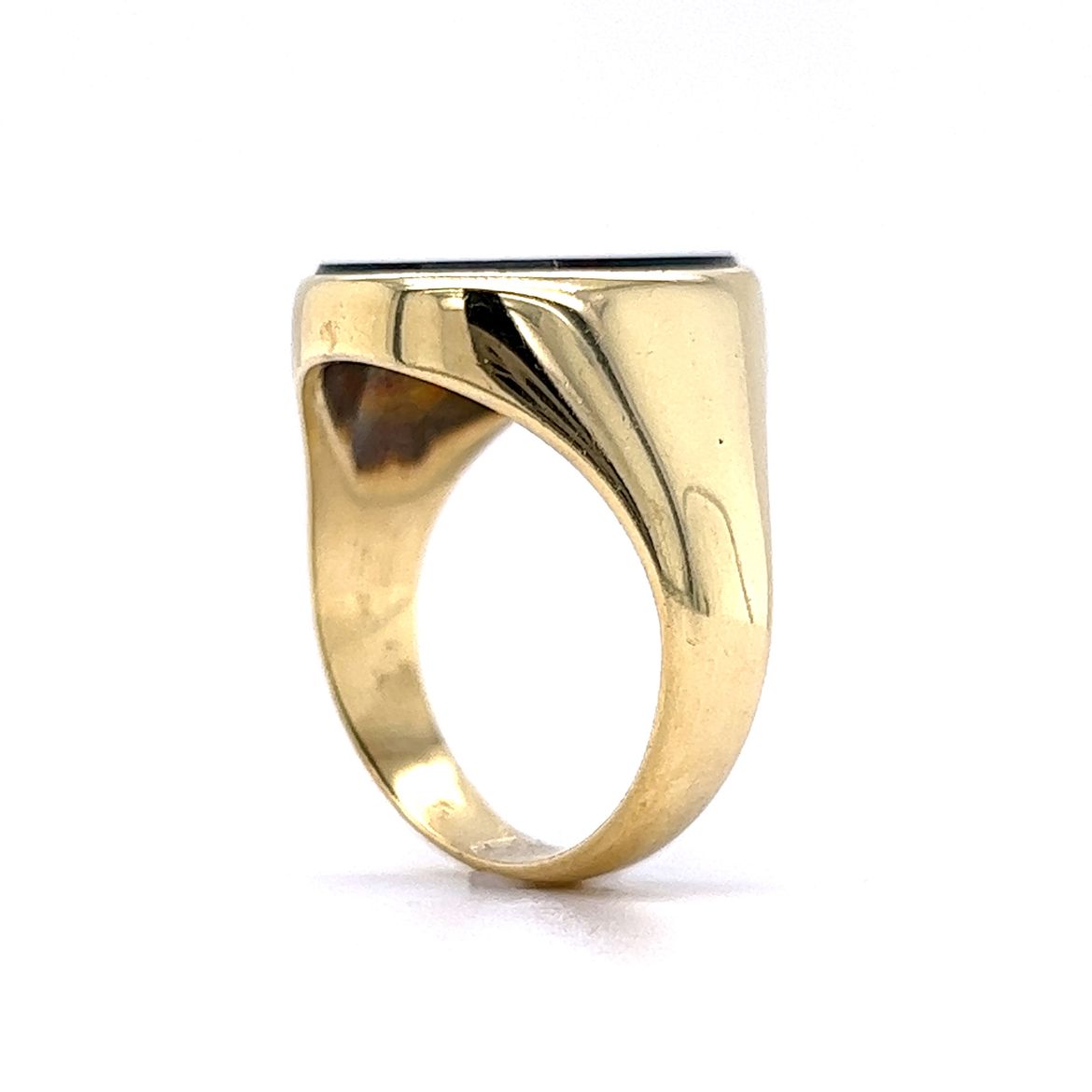 This mid-century signet ring is a timeless tribute to traditional mens wear. Crafted with 14 karat yellow gold, this eye-catching cocktail ring features a large cabochon cut bloodstone. The impressive 5.05 carat stone reflects an eye catching bold deep red hue . The rich coloring of the bloodstone is contrasted beautifully by the yellow gold band, creating a striking look. A bold and captivating statement piece, this bloodstone ring will be an excellent addition.