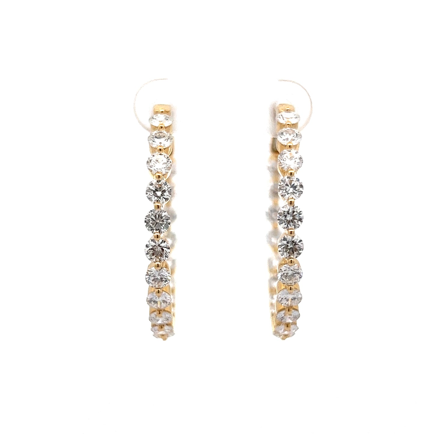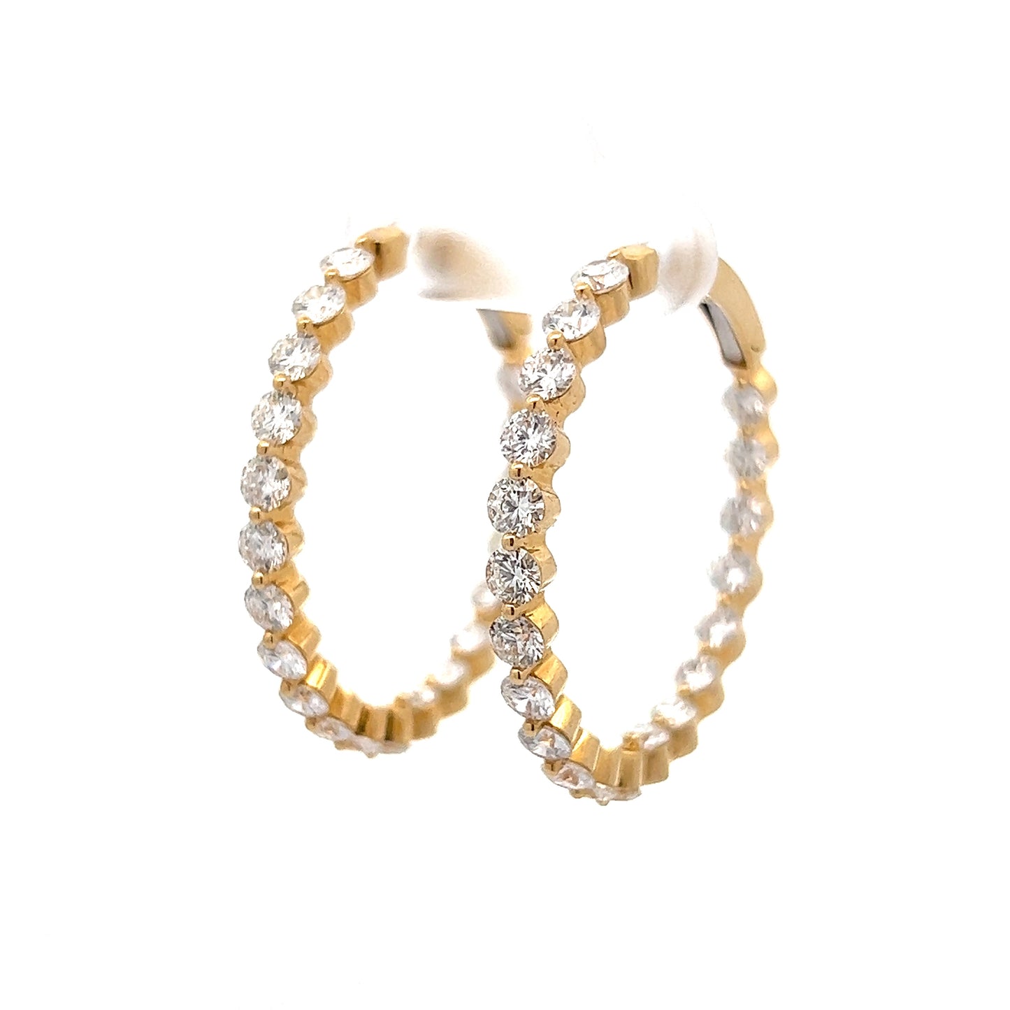 These elegant and modern 5.12 Diamond & Yellow Gold Hoop Earrings are crafted from 18 karat yellow gold, making them the perfect accessory for any occasion. Featuring 5.12 cttw of near-colorless Round Brilliant Cut diamonds of VS2 clarity and H color. Each diamond is expertly placed in a polished 18k yellow gold shared prong setting. The stunning round diamonds catch the light beautifully, making a bold statement. These hoop earrings are the perfect combination of elegance and modernity, effortlessly elevating any outfit. You never go wrong with hoop earrings!