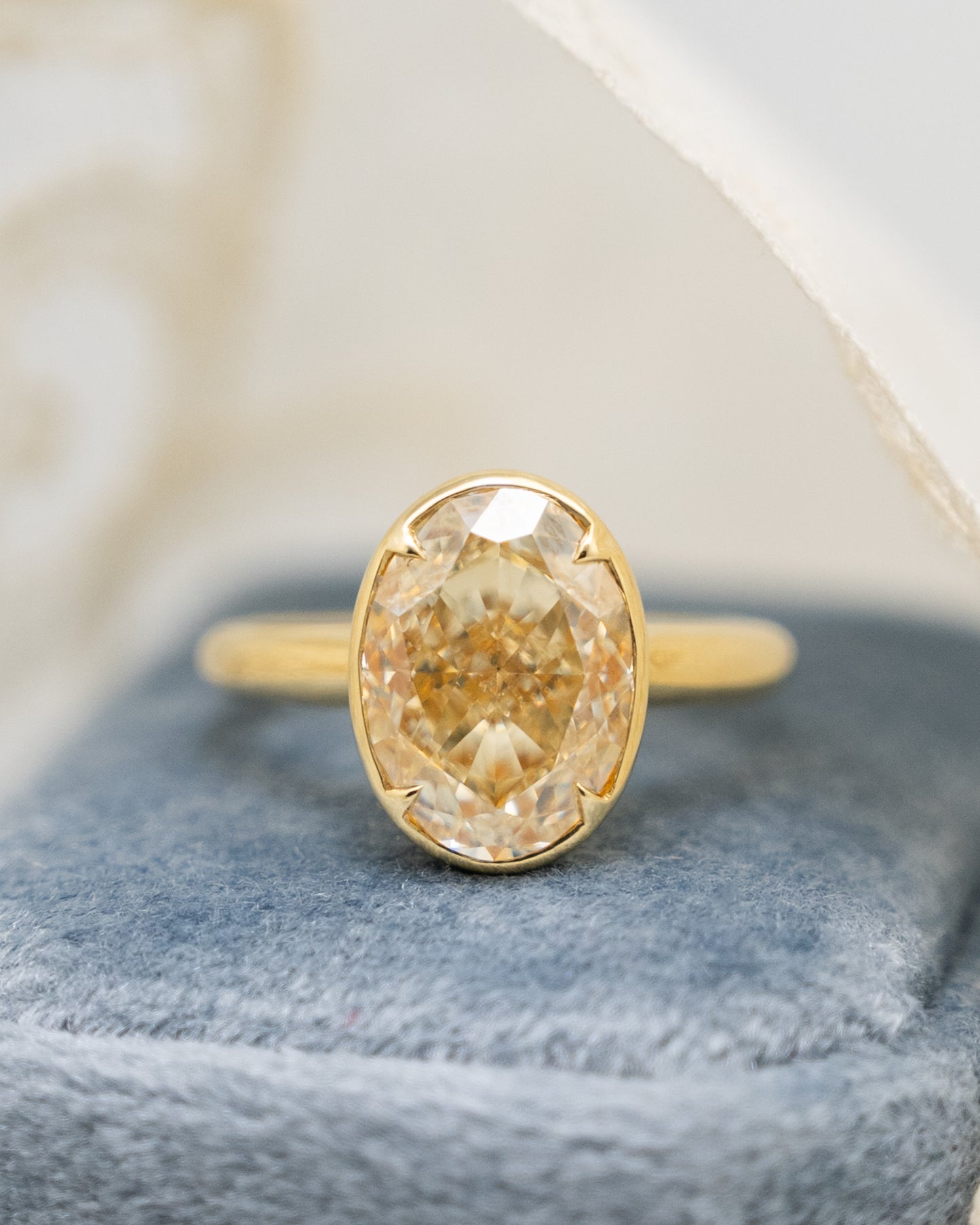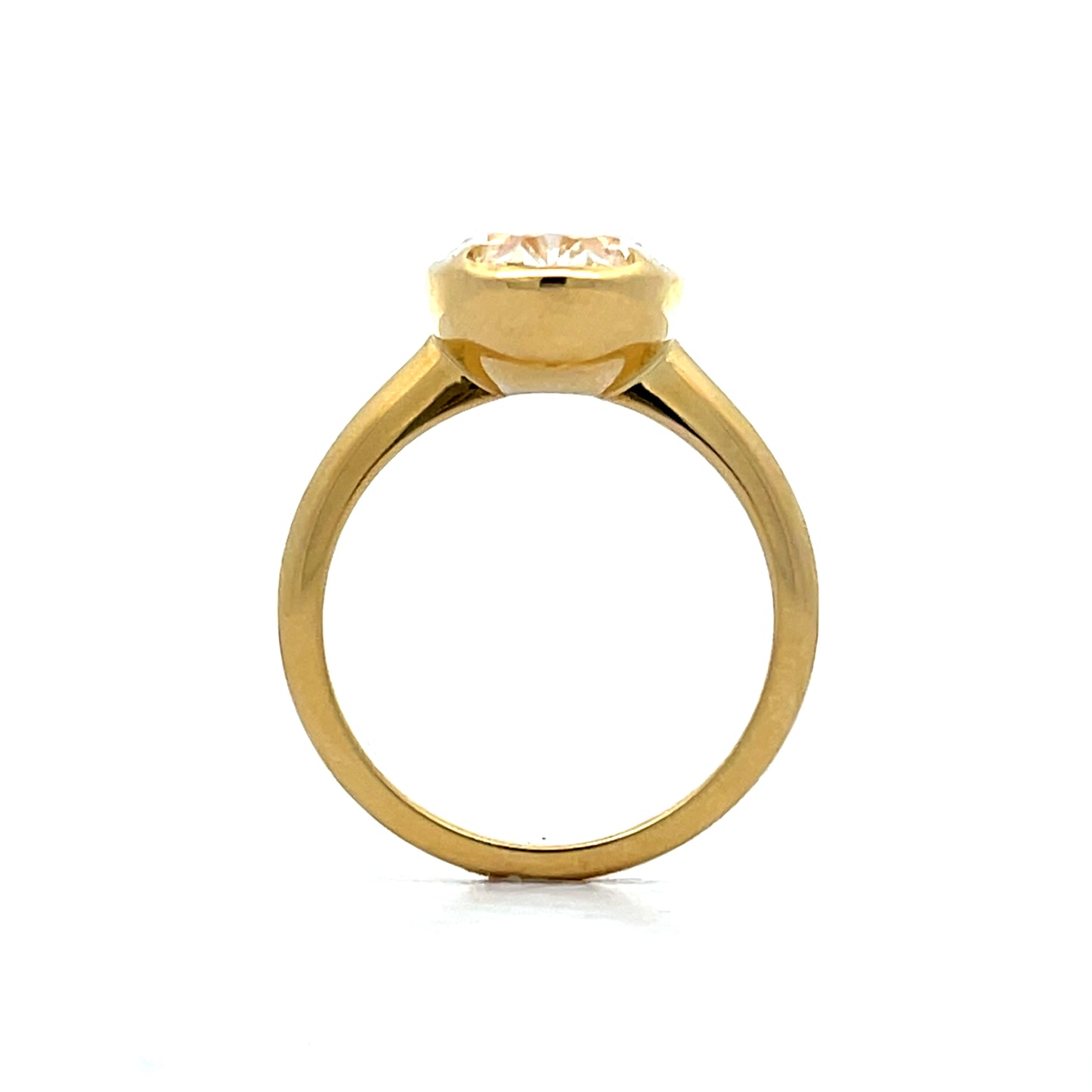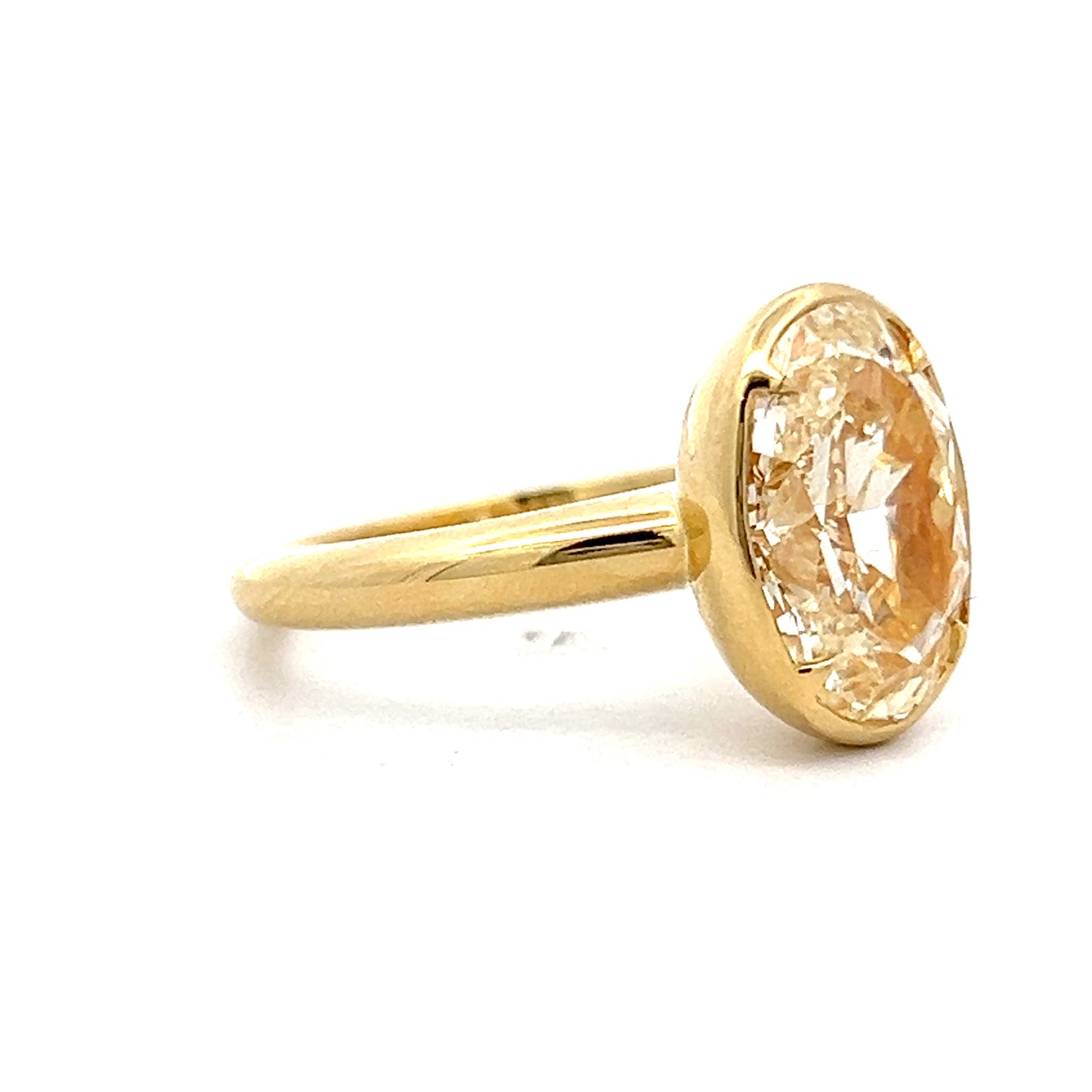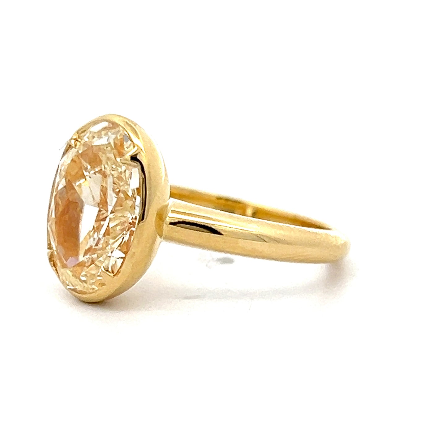 This oval diamond ring features a 5.14 carat stone set in 18 Karat Yellow Gold that gives off a warm glow. The diamond has VS2 clarity with a distinctive U-V warm color tone that makes it stand out from typical colorless stones. It's collet set to maximize light reflection while keeping the stone secure. The 2.75mm gold band provides a simple backdrop that lets the diamond remain the focus of attention. This stunning engagement ring is an absolute showstopper!