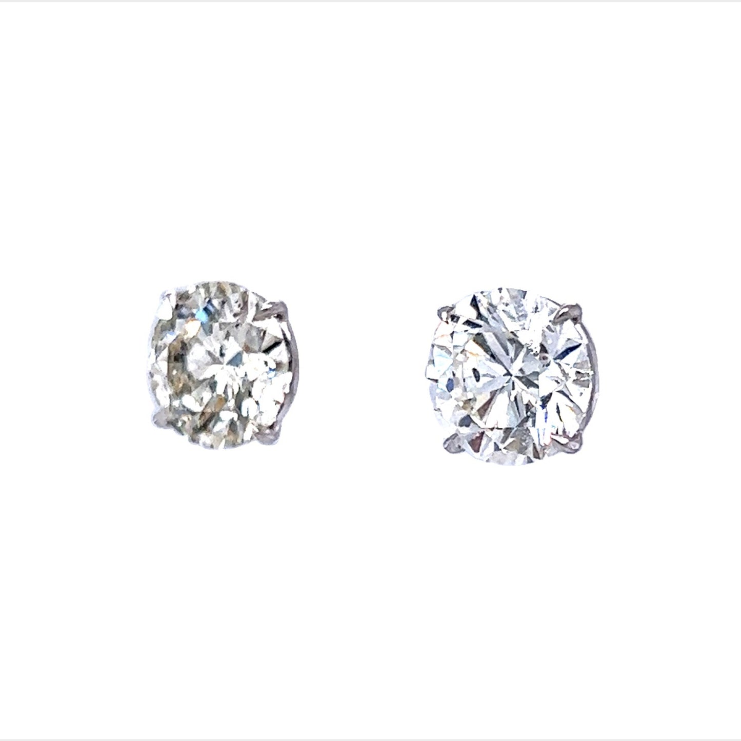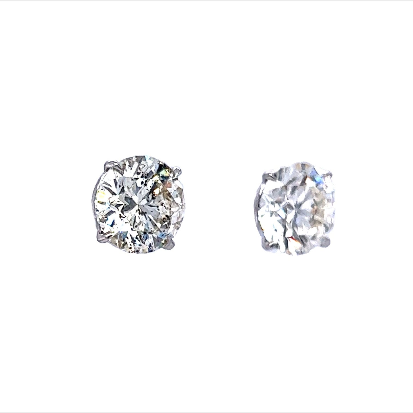 These 5.17 Round Brilliant Cut Diamond Earring Studs in shimmering 18k White Gold are the classic diamond studs you've been dreaming of! Featuring two (2) round brilliant cut diamonds set in prong baskets. Modern & eye-catching. One 2.61 and one 2.56 carat diamonds create the sparkling pair. With a soft, warm hue and facets that bring an impressive amount of fire and brilliance, these diamond studs speak for themselves. A perfect gift for any diamond lover in your life!