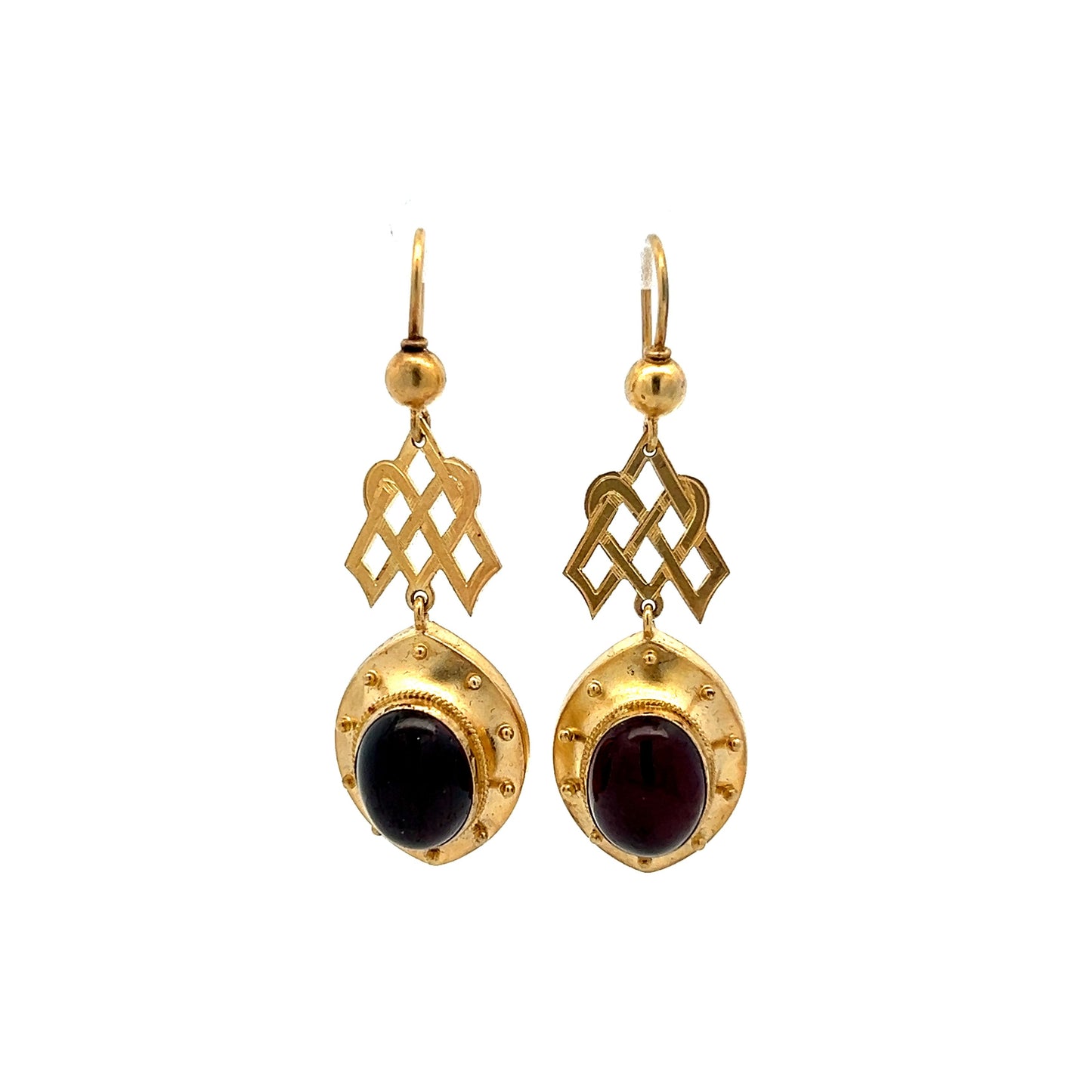 These antique Victorian drop earrings are a unique and captivating accessory, featuring oval cabochon cut garnets set in rich 14k yellow gold. The earrings showcase a beautiful woven gold detail and a natural gold patina, enhancing their vintage charm.