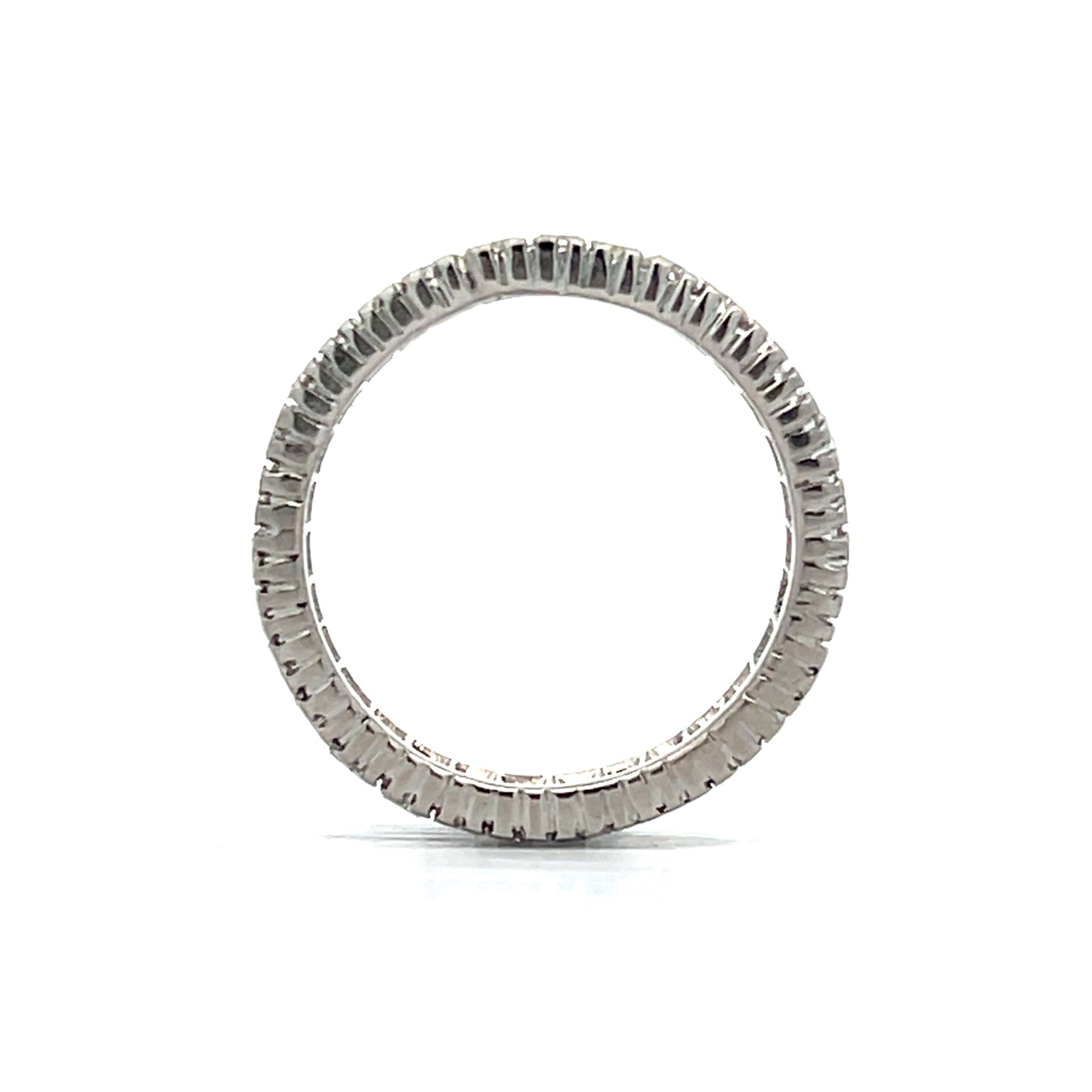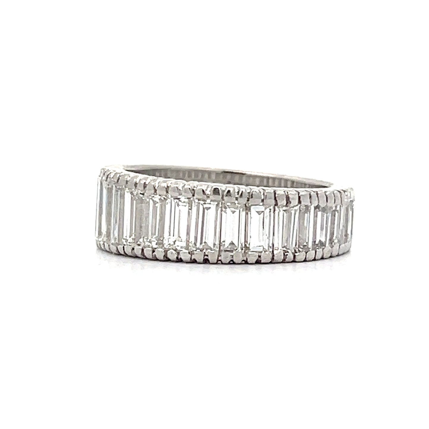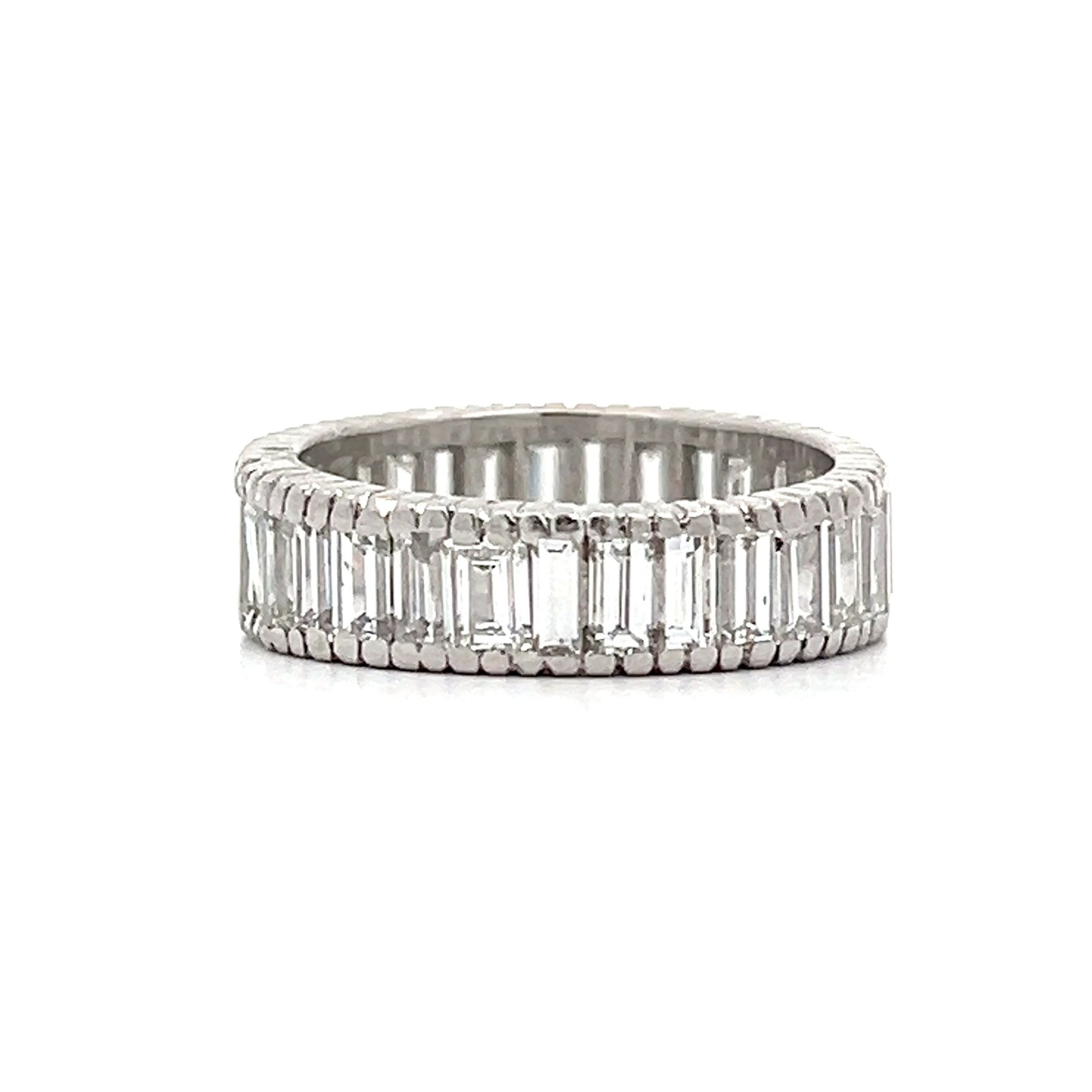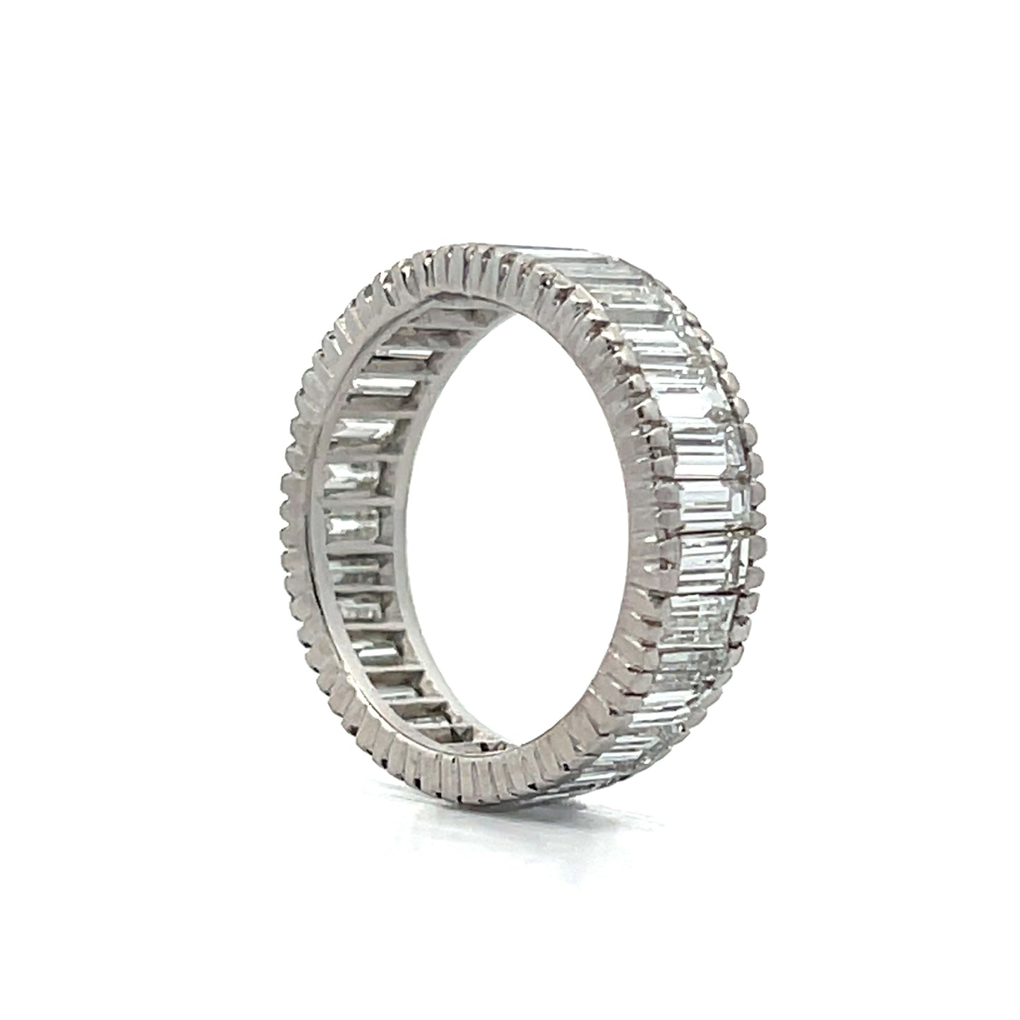 This diamond eternity band is crafted in platinum and features 5.27 carats of baguette-cut diamonds that encircle the entire ring. The diamonds have a clarity range of VS1-VS2 and a G-H color grade. Each diamond is securely prong-set in a channel along the tapered band, giving it a sleek, streamlined look. The ring’s continuous design offers a balanced sparkle from every angle. Substantial eternity bands such as this make for wonderful statement rings or can be worn as an engagement ring.