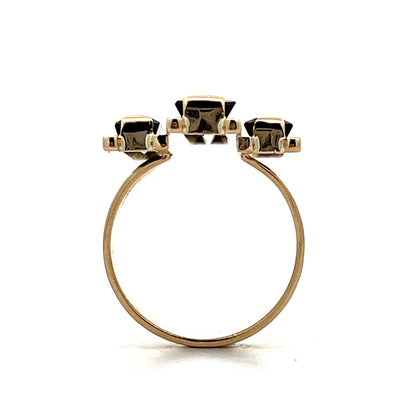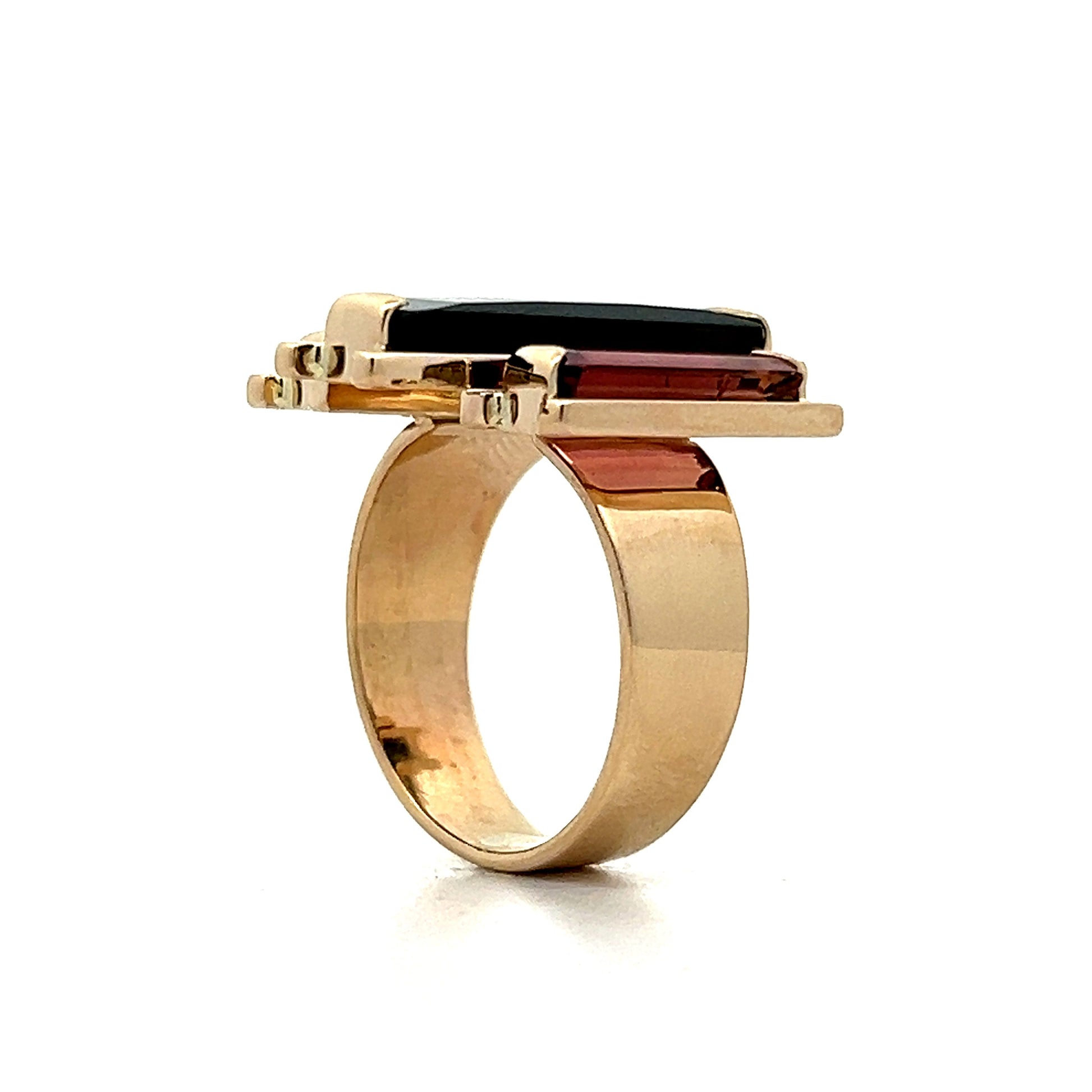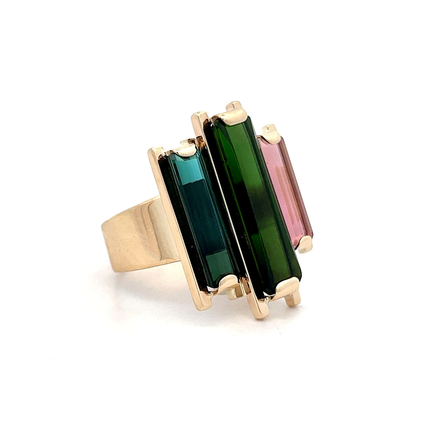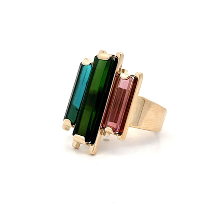 This 14 karat yellow gold cocktail ring is a bold statement of color, featuring a striking 2.68 carat emerald cut green tourmaline as its centerpiece. Flanked by two vibrant accent stones—a 1.65 carat blue tourmaline and a pink tourmaline—this ring plays with color in a way that’s both eye-catching and refined. The bar-set stones create a dynamic look that balances the rich hues of green, blue, and pink, making this piece a standout for any occasion. Whether it’s a night out or a day when you simply want a burst of color, this ring brings a fresh energy that feels both playful and polished.