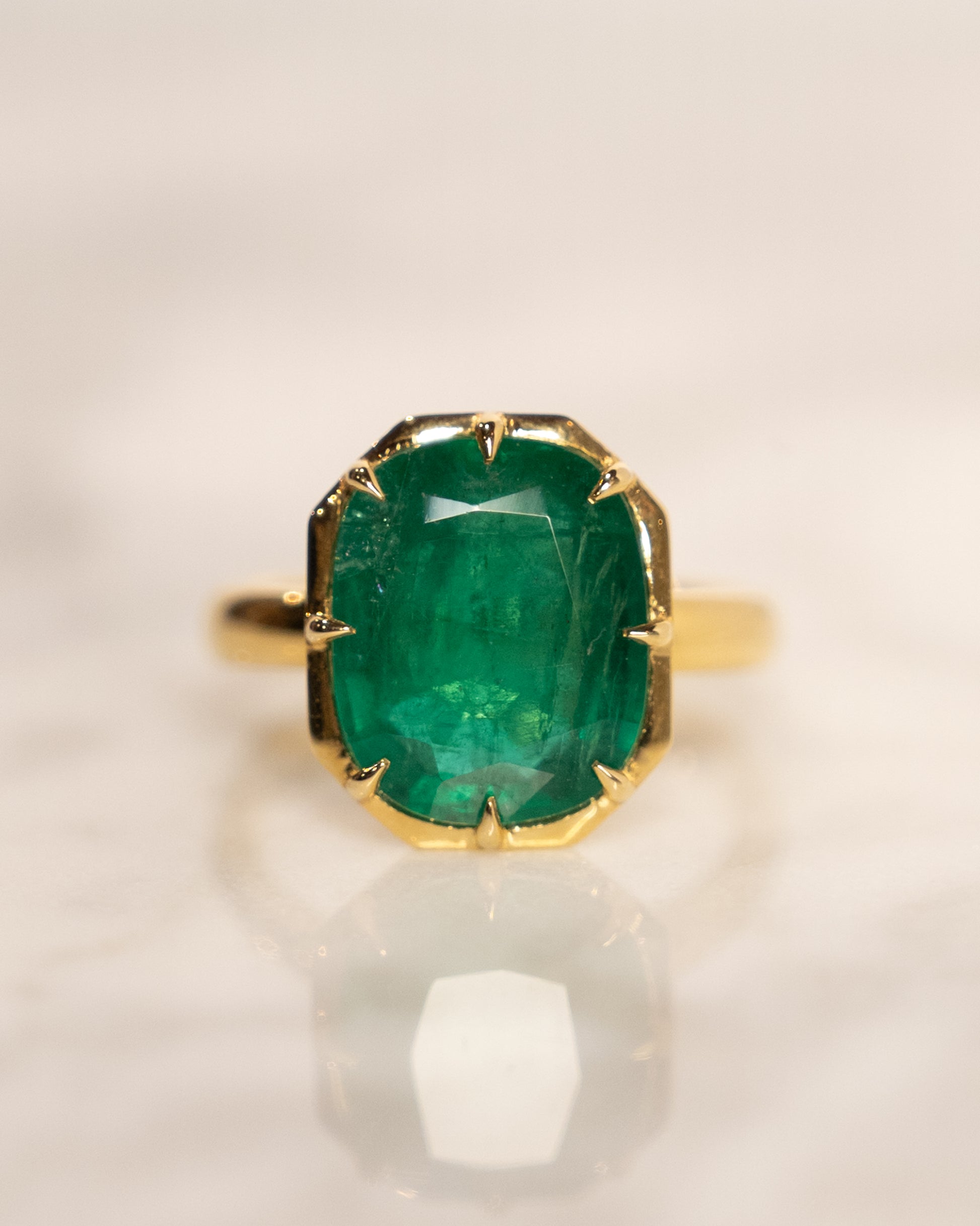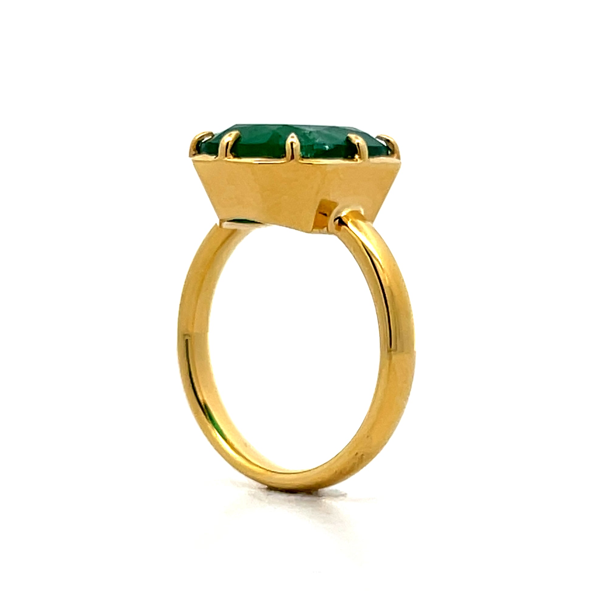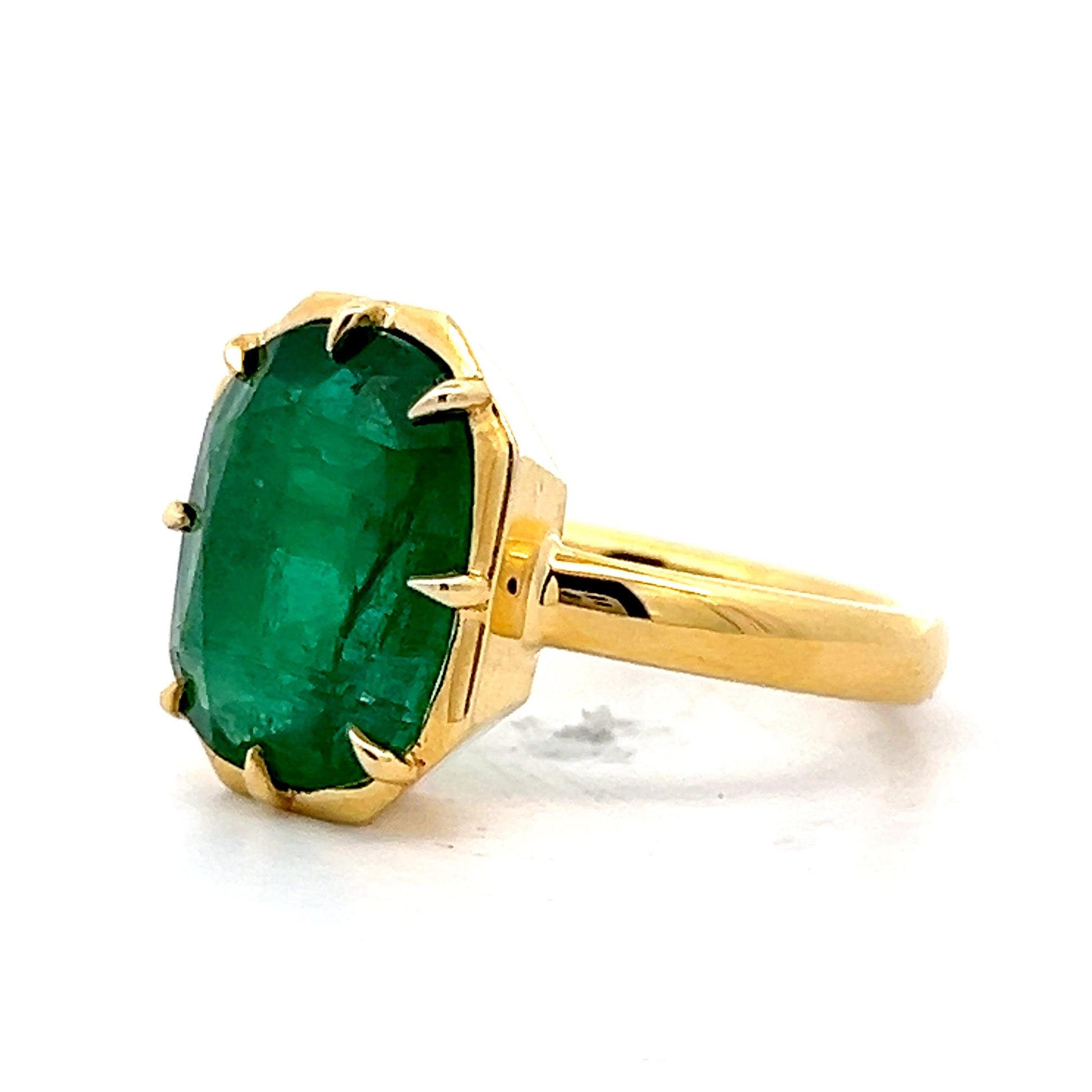 The cocktail ring features a cushion cut emerald as its centerpiece, held securely by an eight-prong basket in a collet setting. This solitaire design keeps the focus on the bright green emerald. The ring is made from 18 karat yellow gold, which creates a nice color contrast with the rich green of the emerald stone. The cushion cut shape of the emerald offers a mix of classic styling with the more unusual choice of an emerald as the main stone instead of a diamond.