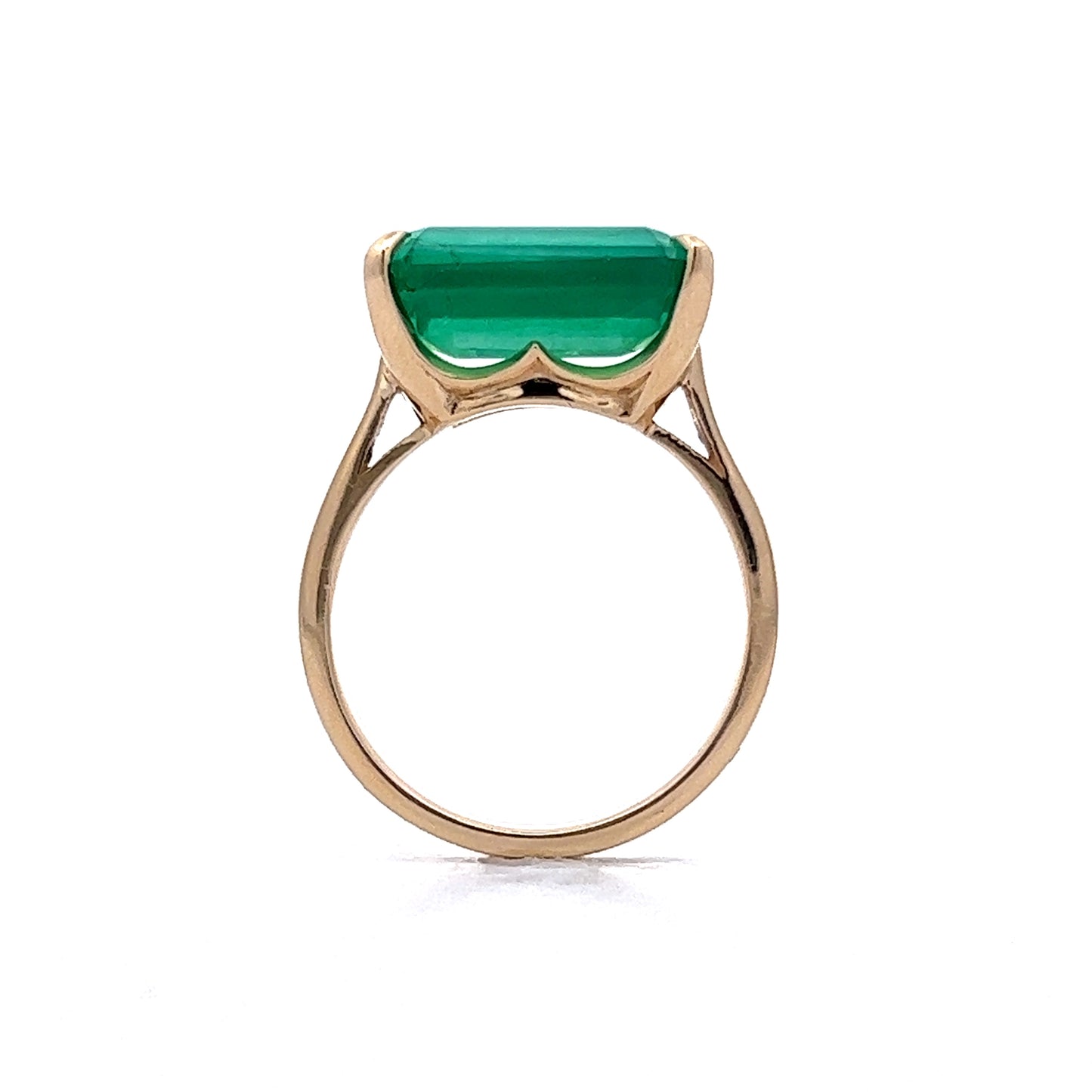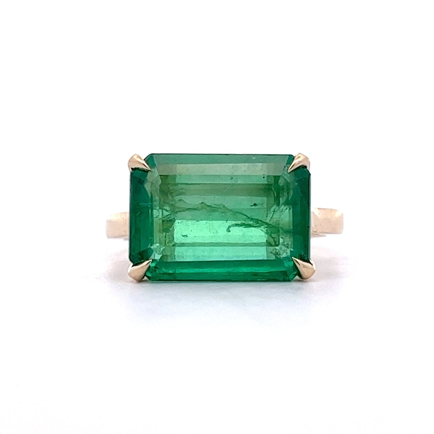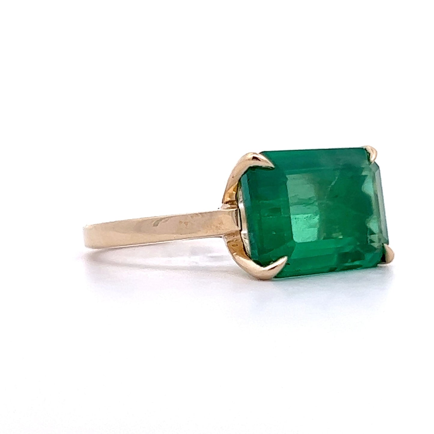 Crafted in 14 karat yellow gold, this ring features a stunning emerald weighing 5.73 carats. The emerald is set in an east-west orientation, creating an eye-catching effect. The frame of the emerald is a polished yellow gold. This custom "By Filigree" statement ring is a unique piece that will be sure to stand out. Simple, classic and stunning.
