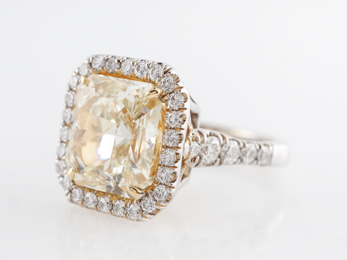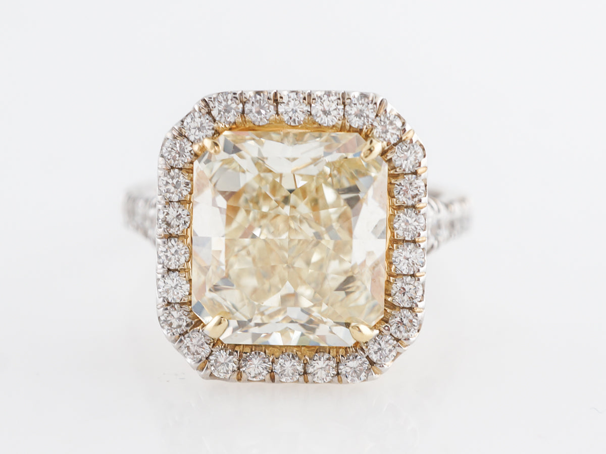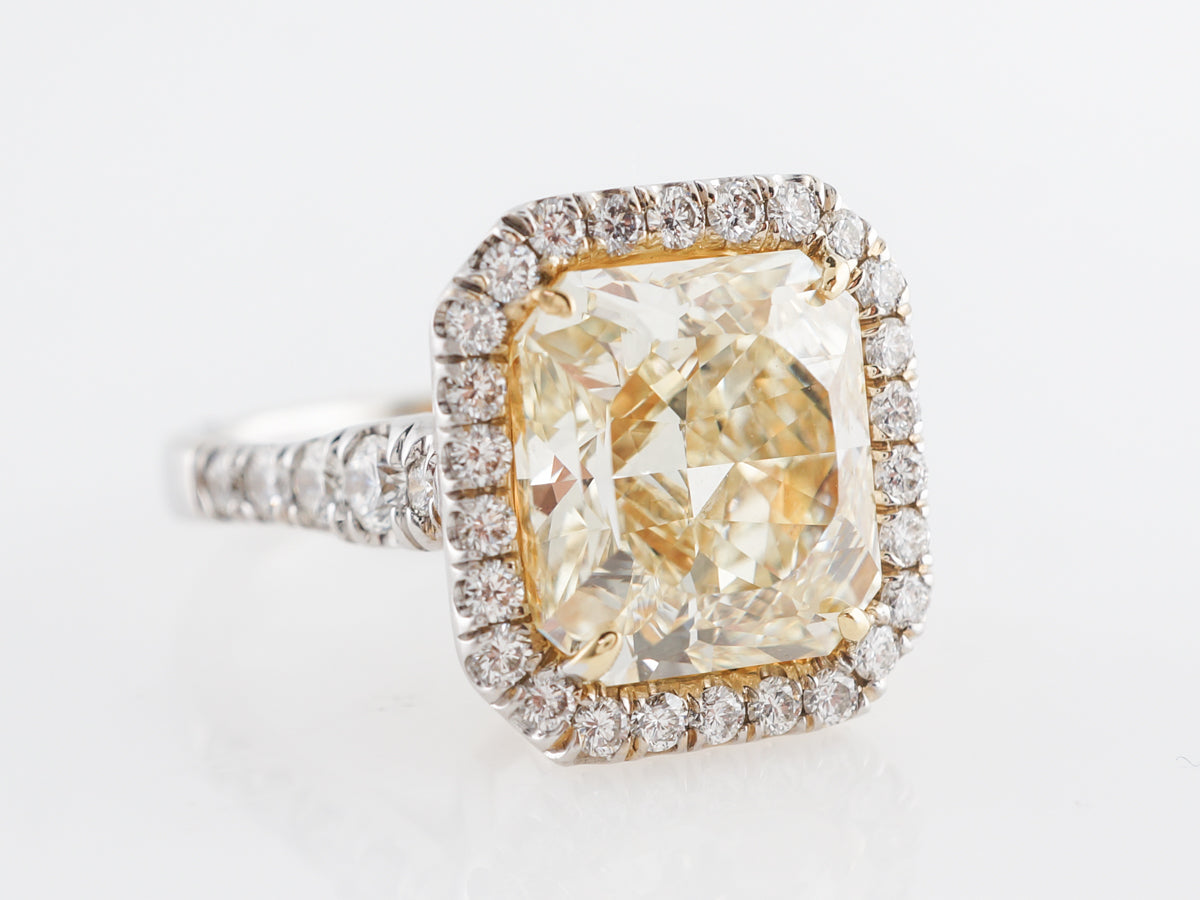 5.90 Carat Fancy Yellow Diamond Engagement Ring in Platinum 18k. This modern engagement ring features a stunning GIA certified 5.90 carat fancy yellow radiant cut diamond set in 18 karat yellow gold and platinum. The gorgeous fancy yellow diamond is prong set in yellow gold and wreathed in a halo of smaller white round brilliant cut diamonds. This immediately treats the eyes to some beautiful contrast between the natural yellows of the diamond and gold with the halo and platinum. This is a stunning ring that is sure to draw eyes everywhere it goes!