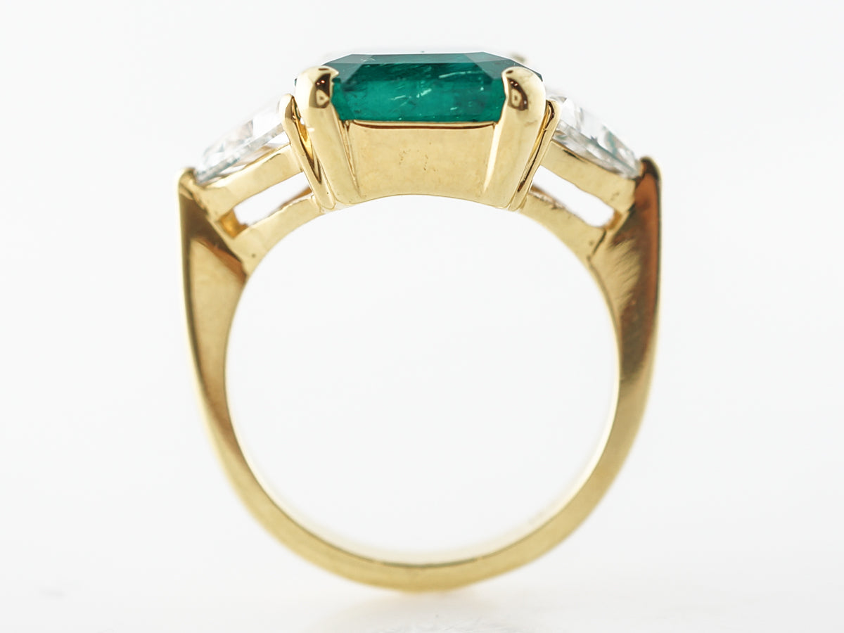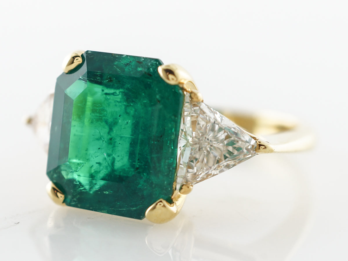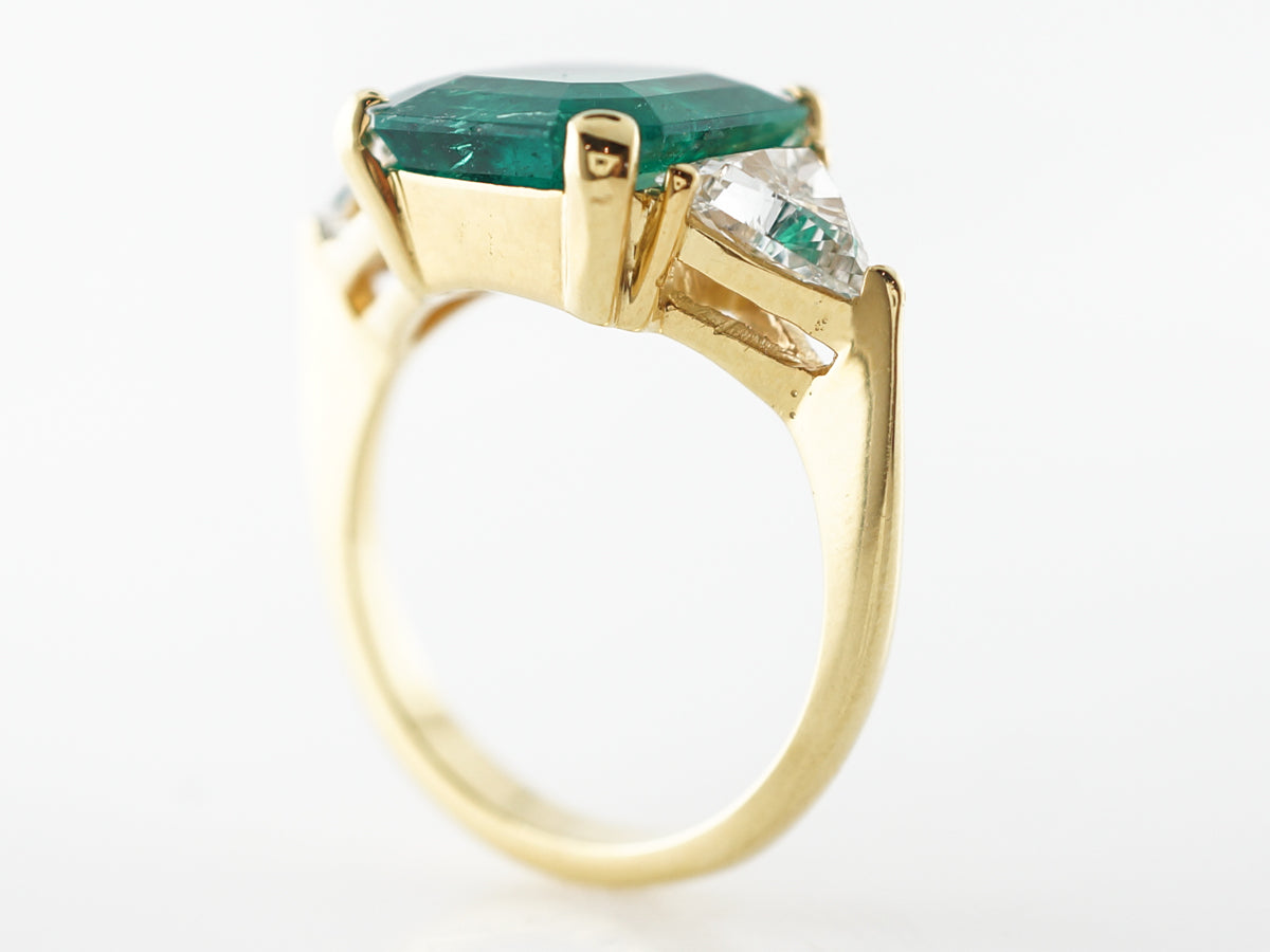 5 Carat Emerald Engagement Ring in Yellow Gold. This beautiful 5 carat emerald is prong set in 18 karat yellow gold. Being prong set allows for more light to bounce through the stone from all angles, bringing out more of the emerald green. Sitting on the shoulders are two trilliant cut 1.11 carat diamonds whose outside edges flow seamlessly from the corners of the emerald. This clean modern design in yellow gold highlights the natural beauty of the large emerald while subtle elements like the accent stone angles speak to the skilled craftsmanship involved in this rings creation.