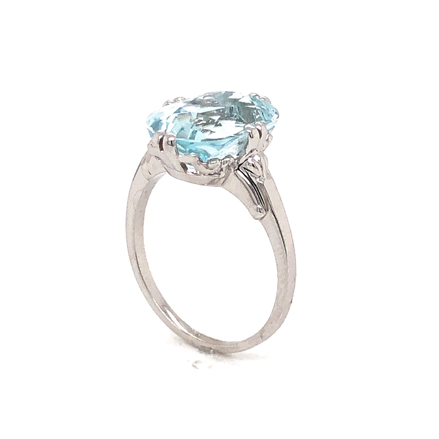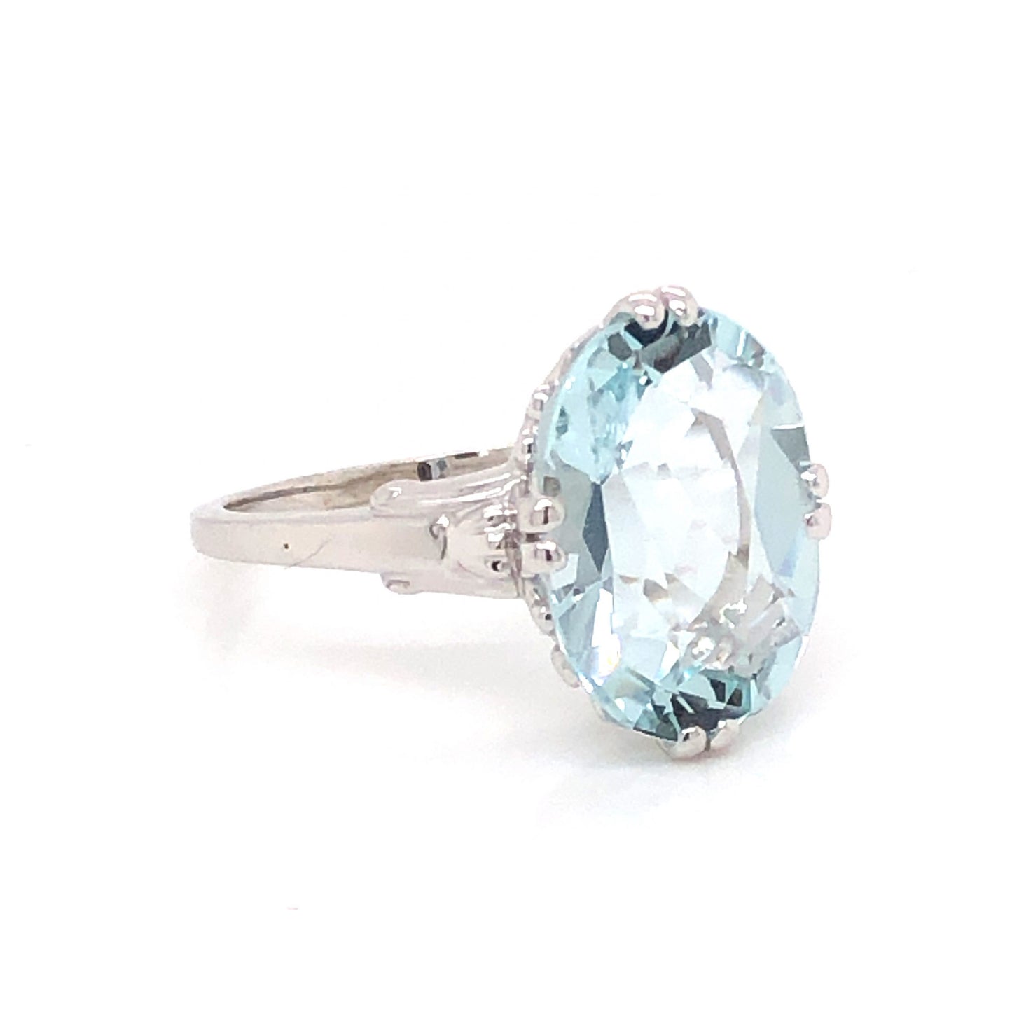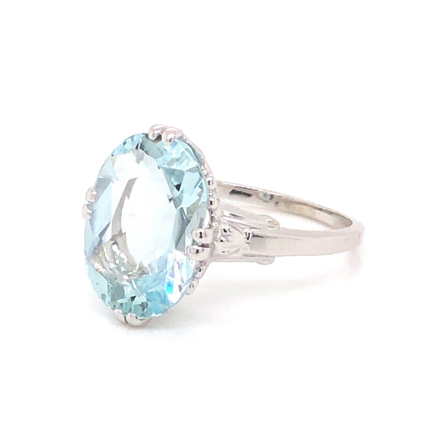 5 Carat Mid-Century Oval Cut Aquamarine Ring in 14k White Gold. This Mid-Century cocktail ring features a 4.99 carat oval cut aquamarine in dazzling 14 karat white gold. The aquamarine has a lightly saturated, soft blue hue. Accenting its already generous size, the oval cut facets give the blue aquamarine a powerful brilliance. The center stone is prong set on a beautiful, vintage basket mounting. The shoulders of the band feature structured, Mid-Century buckles that add a fine detail to the slightly tapered 14k white gold shank. For an elegant engagement ring with history, this fashionable Mid-Century ring is the one you need!