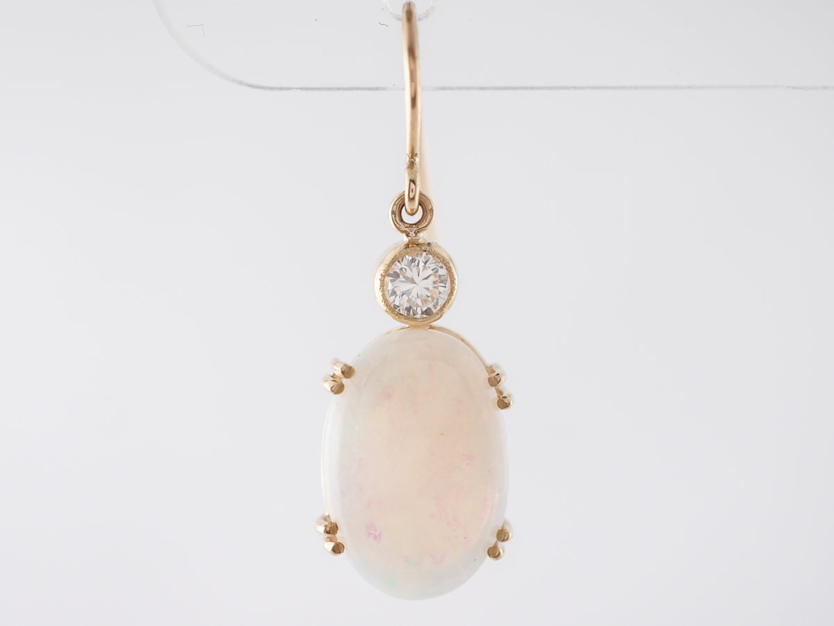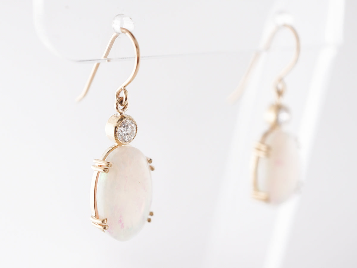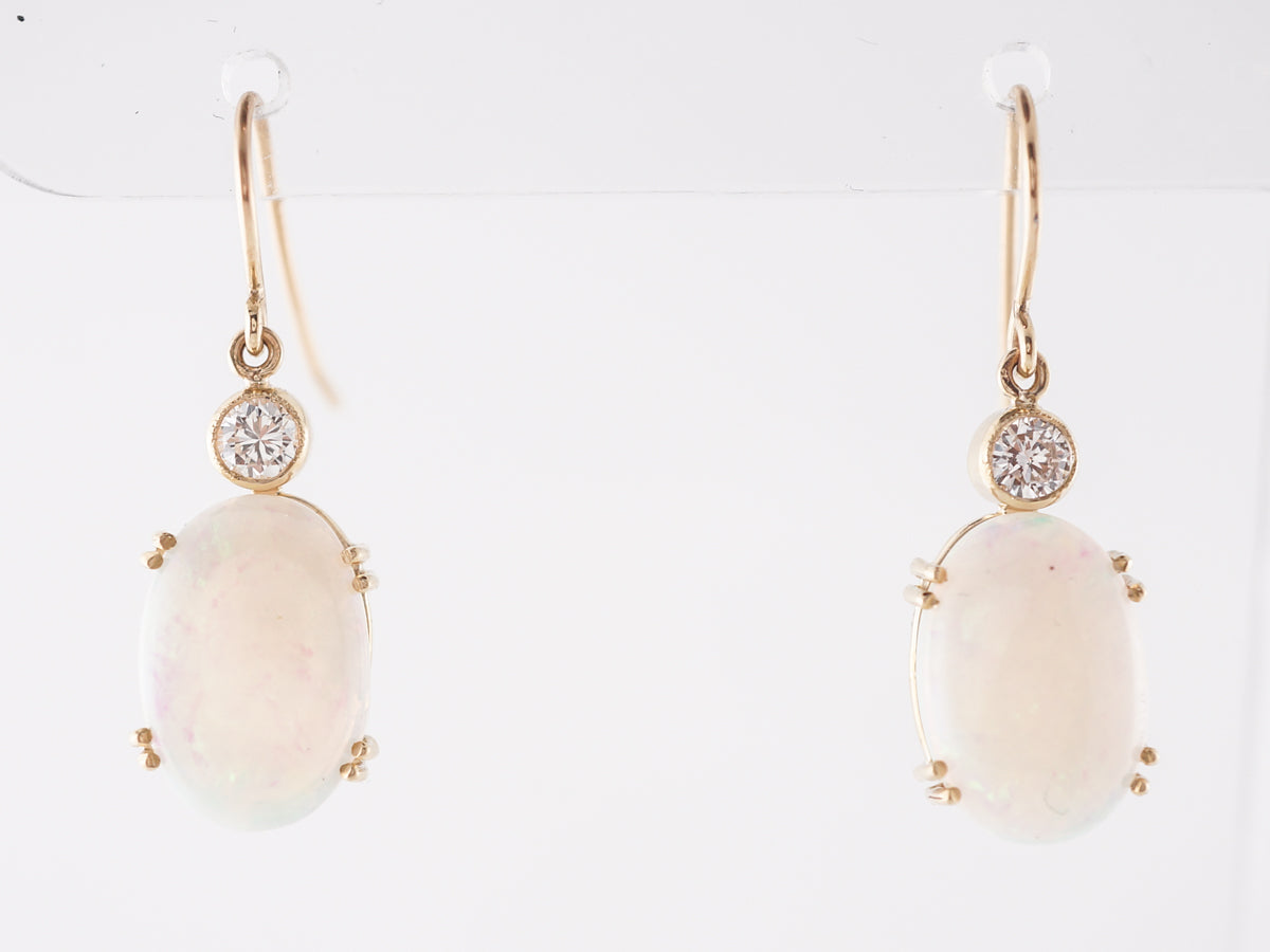 5 Carat Opal Diamond Earrings in Yellow Gold. These modern opal and diamond earrings are composed of 14 karat yellow gold that secures a gorgeous cabochon cut opal which is double prong set underneath a bezel set diamond. The opals contain a brilliant green flash with warm blues and reds that contrast beautifully with the yellow gold. The accent diamonds are bezel set with very fine milgrain detail and total .27 carats. Set with a shepherds hook these drop very slightly creating some nice movement to accentuate the colors of the opals.