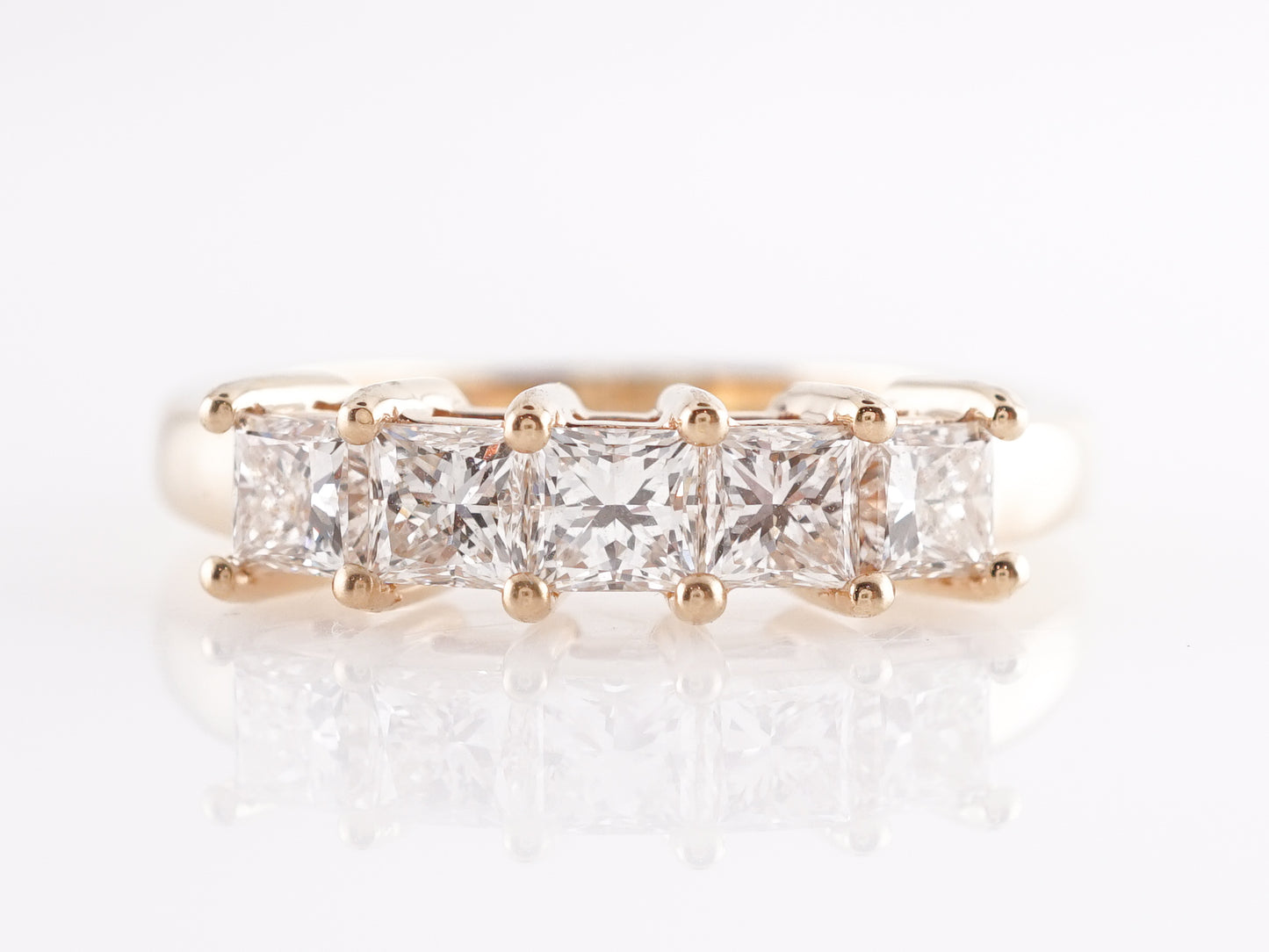 Structural and modern, this wedding band features five .20 carat princess cut diamonds in 14k yellow gold. Each diamond has intricate facets that allow for exceptional brilliance. Sleek and perfectly aligned, these princess cut natural diamonds are near colorless and are nestled in thick, 14k yellow gold prongs. Reserve this 1.0 carat diamond wedding band and bring some tasteful sparkle to your special day!