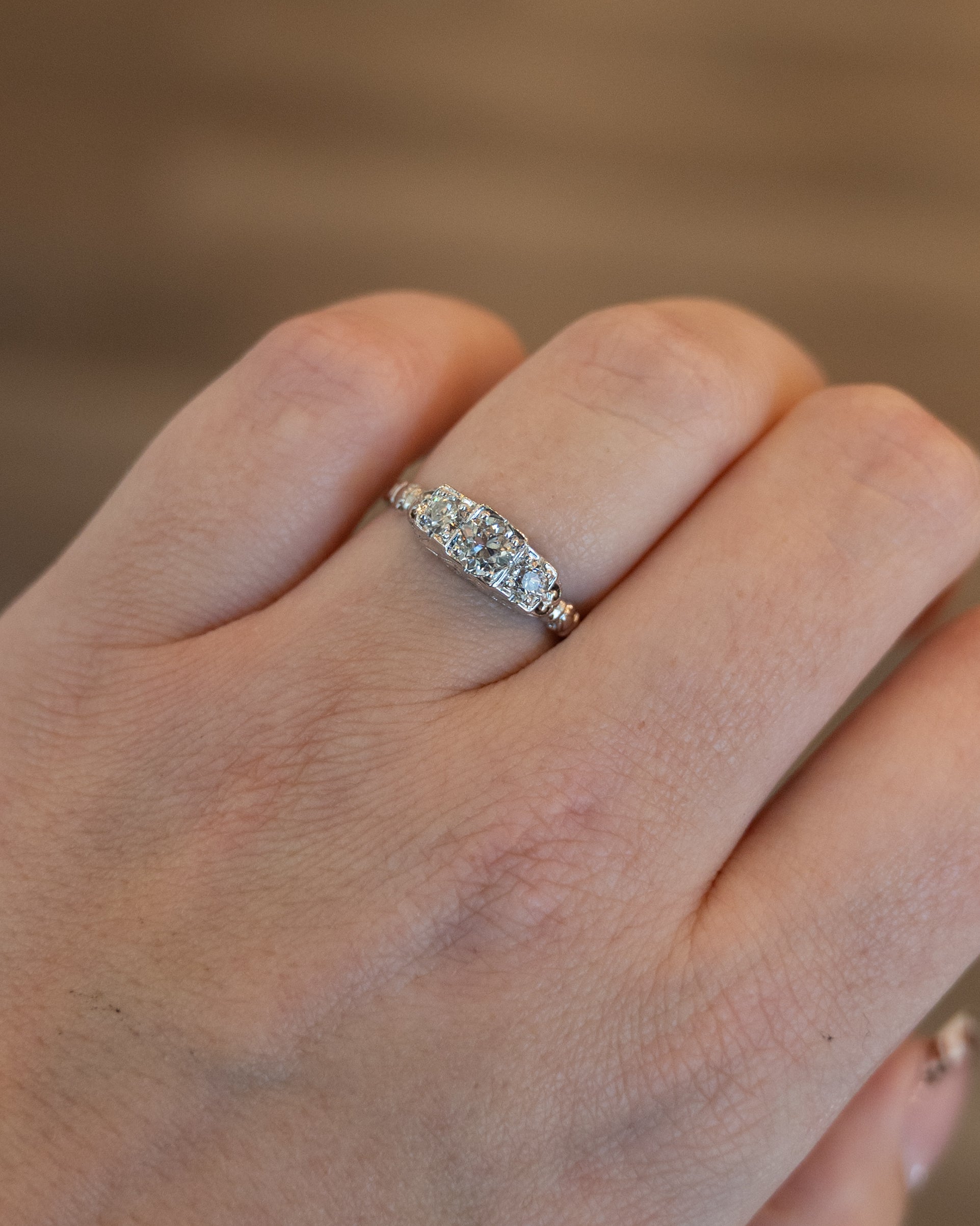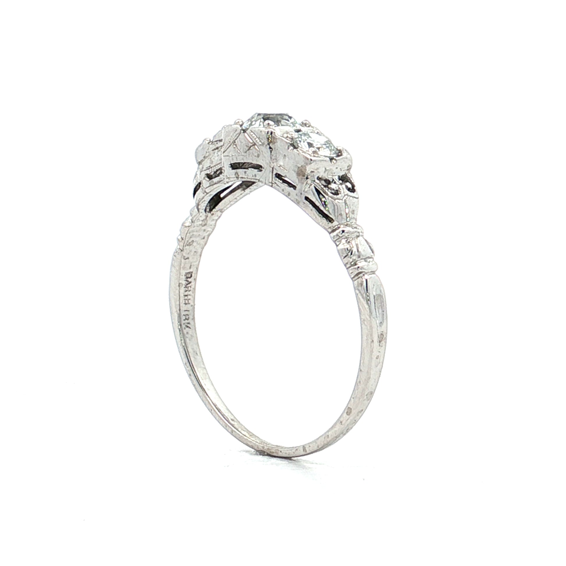 This Art Deco three-stone engagement ring features a .50 carat old European cut center diamond with I color and VS2 clarity, flanked by two .20 carat round brilliant cut diamonds for a total weight of .90 carats. Set in 18 karat white gold, the ring features gorgeous filigree work and geometric mounting that reflects the design style of the period. The three-stone design represents past, present, and future.