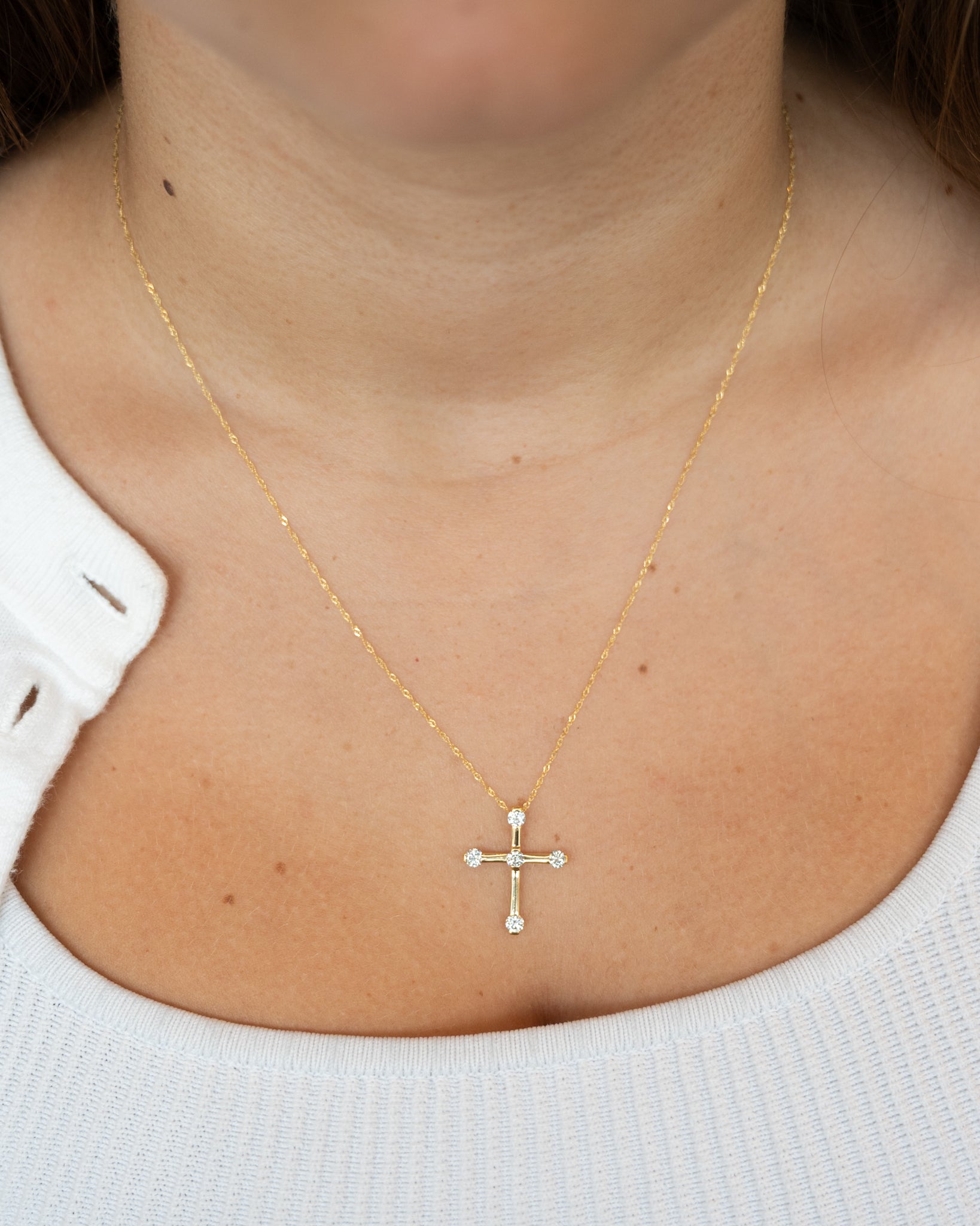 This 18 karat yellow gold pendant necklace features five natural round brilliant cut diamonds arranged in a Southern Cross constellation design. Each diamond measures 3.0mm and together they total .51 carats. Suspended from an 18-inch chain, this pendant sits at collarbone length.