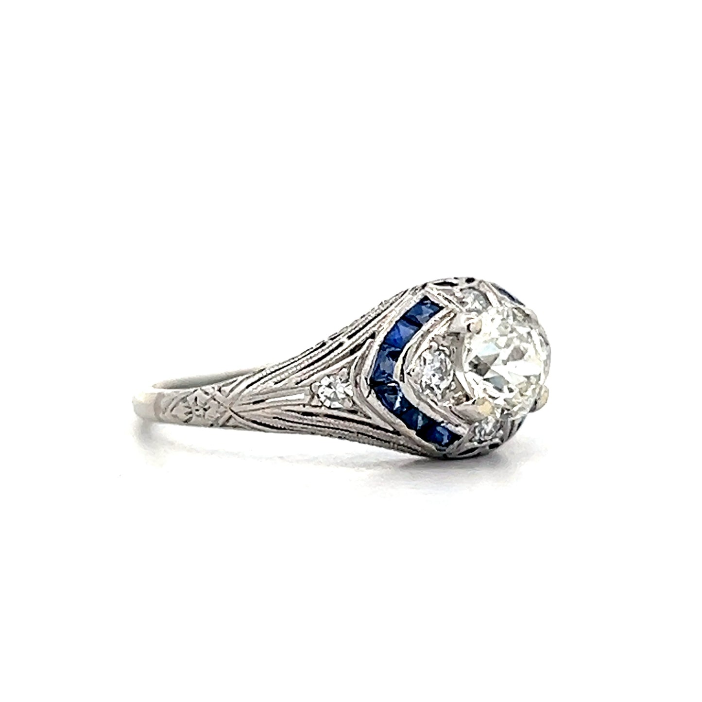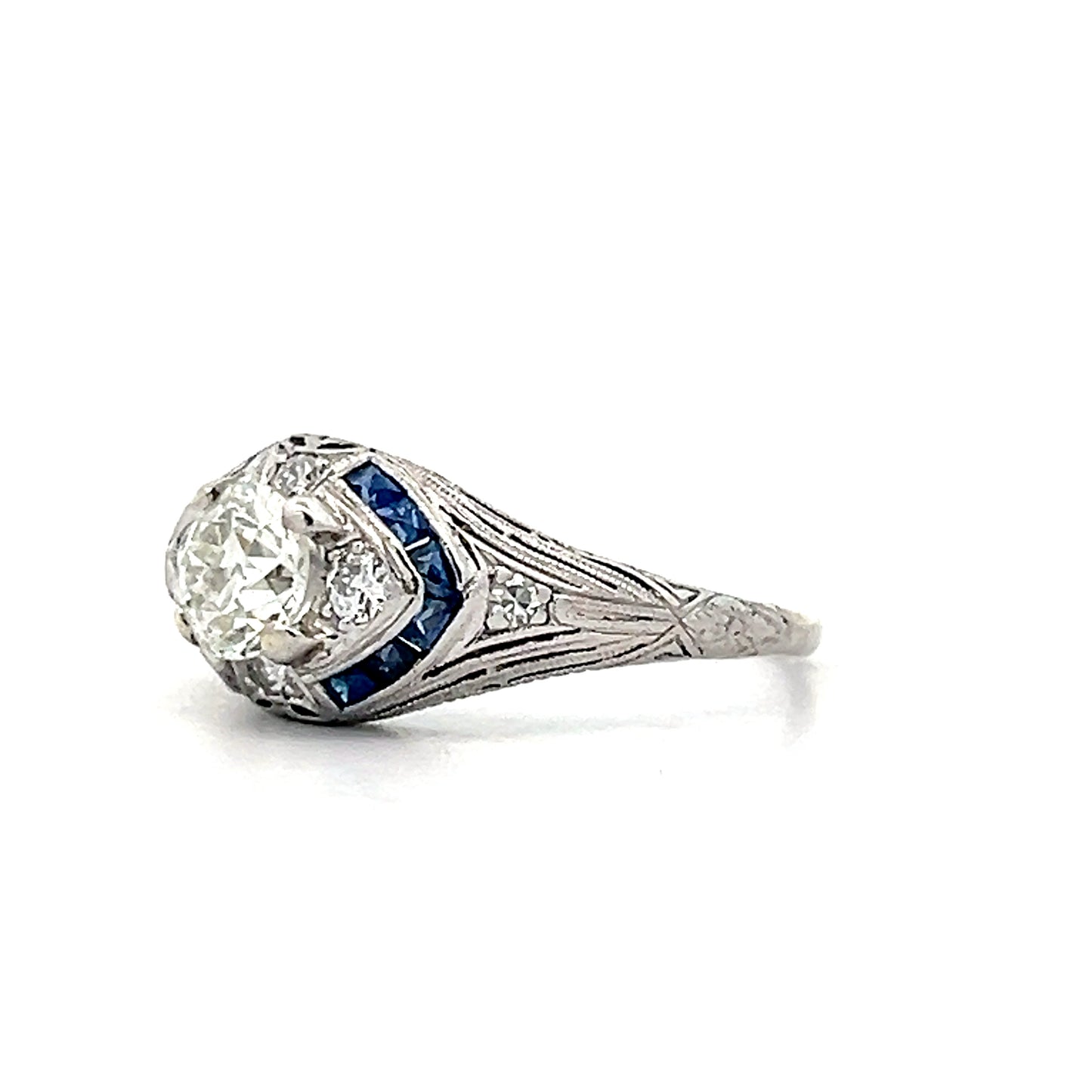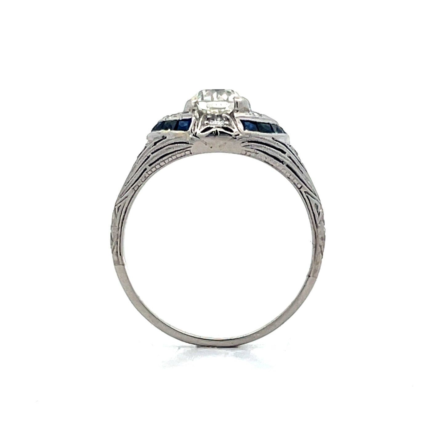 Celebrate the intricate beauty of the Art Deco era with this gorgeous engagement ring. Crafted in platinum, it features a prong-set Old European cut diamond at its center, weighing .52 carats. Channel-set French cut blue sapphire accents, totaling .06 carats, bring a striking contrast with their blue hue. The ring’s filigree details and engraved band highlight the intricate craftsmanship characteristic of the Art Deco period.