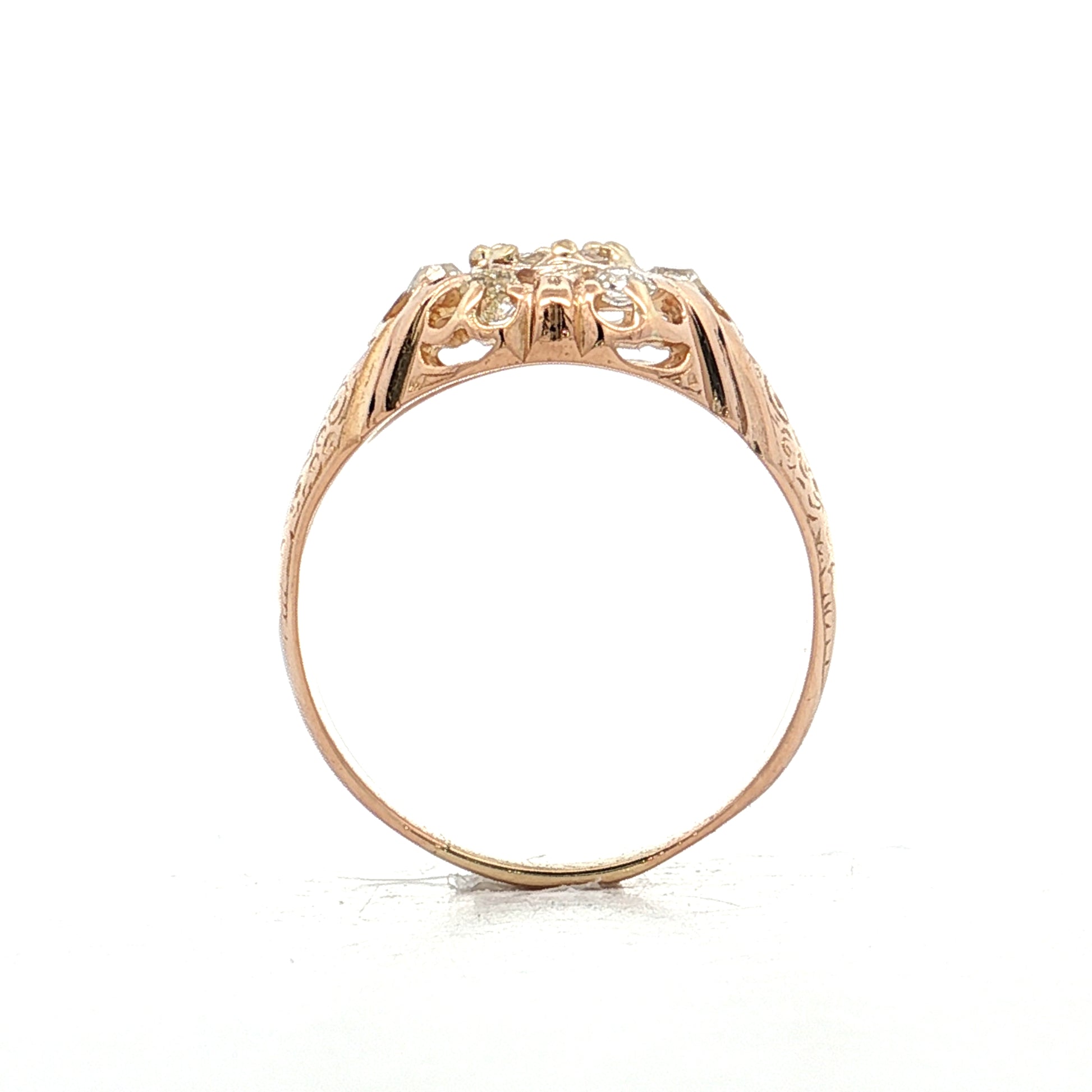 Rose cuts have a flat bottom and domed top with triangular facets that create a softer, more subdued glow rather than the intense sparkle of modern cuts, giving the diamond a distinctly antique appearance. Old mine cuts produce a similar gentle light return with their cushion shape and large facets. The ring is set in 14 karat yellow gold with a floral mounting and engraved shoulders, typical of Victorian design.