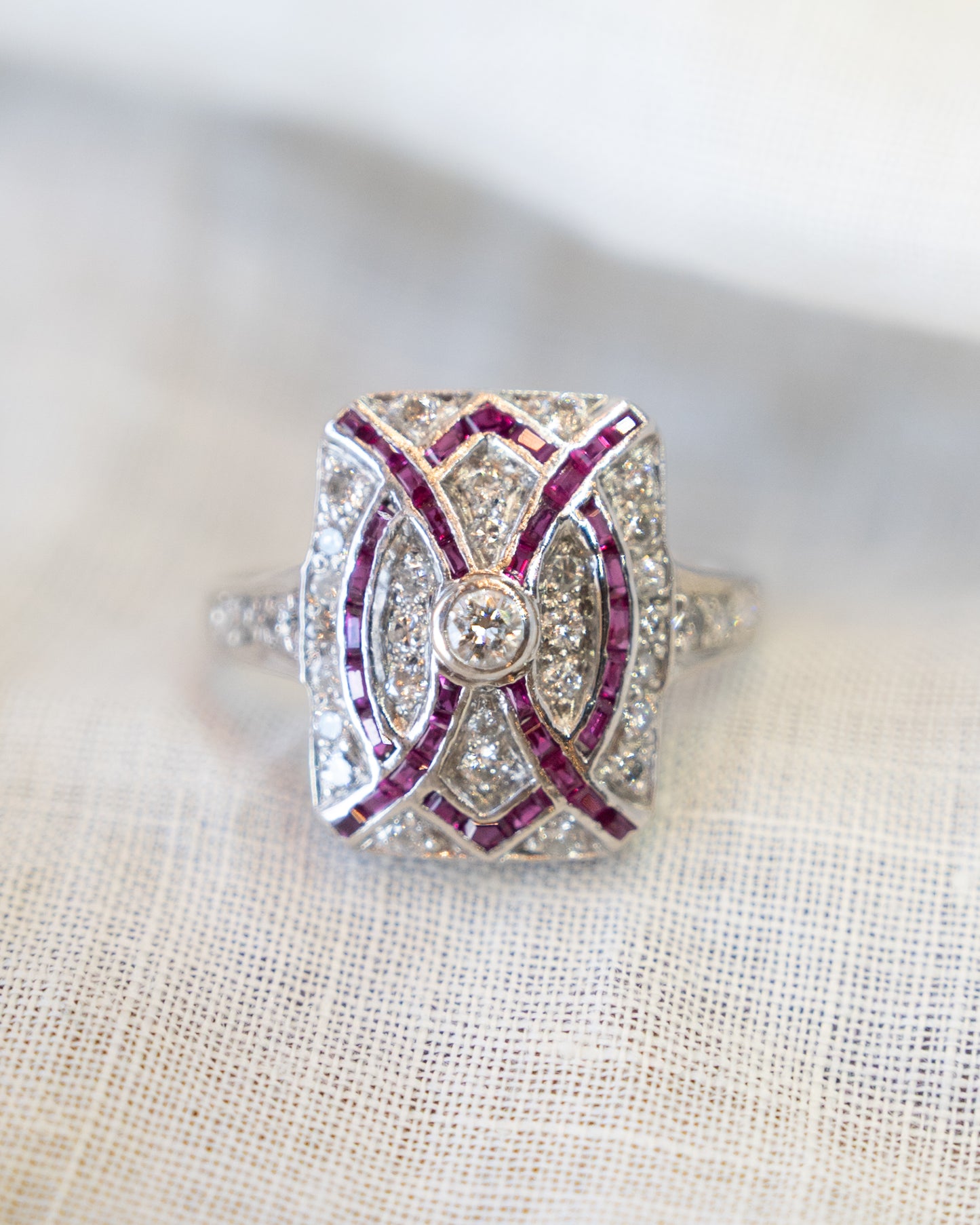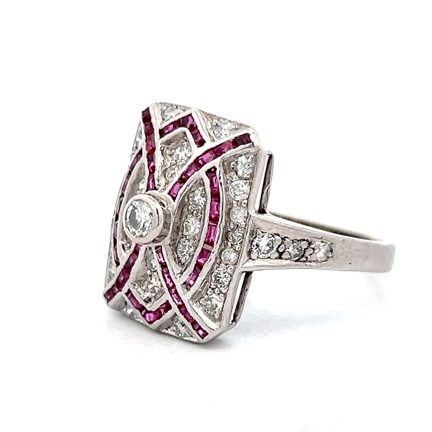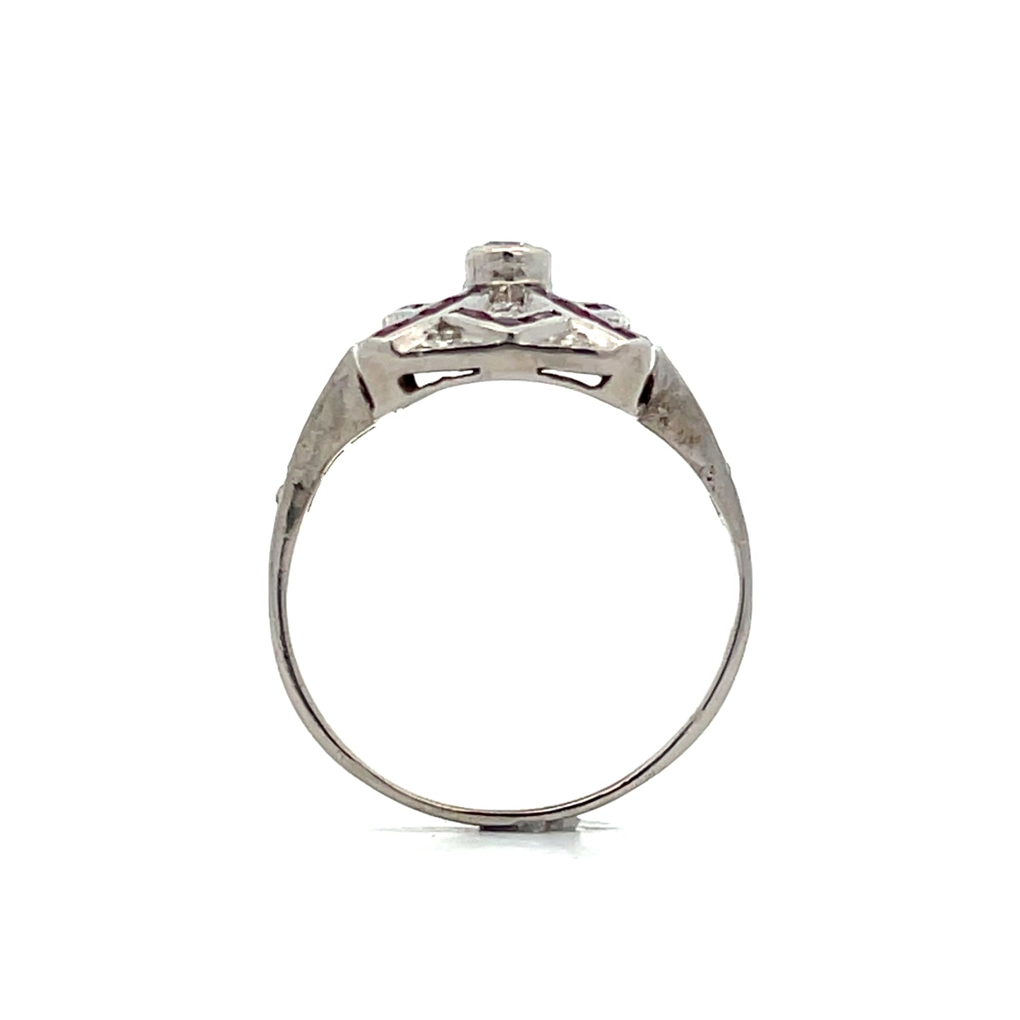 The ring features 28 accent stones measuring between 1.25 and 2.0 mm and weighing between .01 and .03 carats each, with a ruby accent weight of .42 carats. This unique blend of diamonds and rubies creates a balanced mix of sparkle and color that stands out from typical jewelry designs.