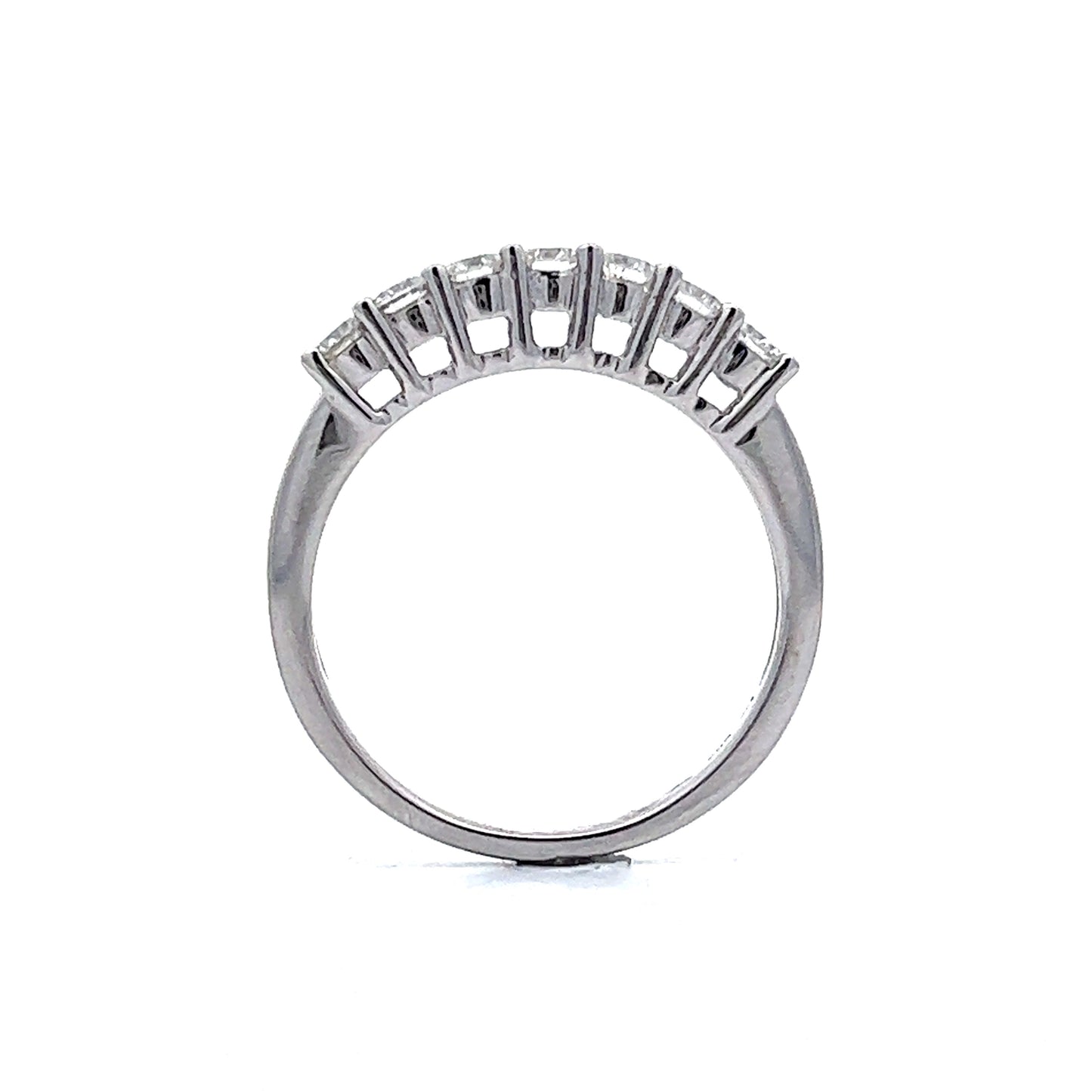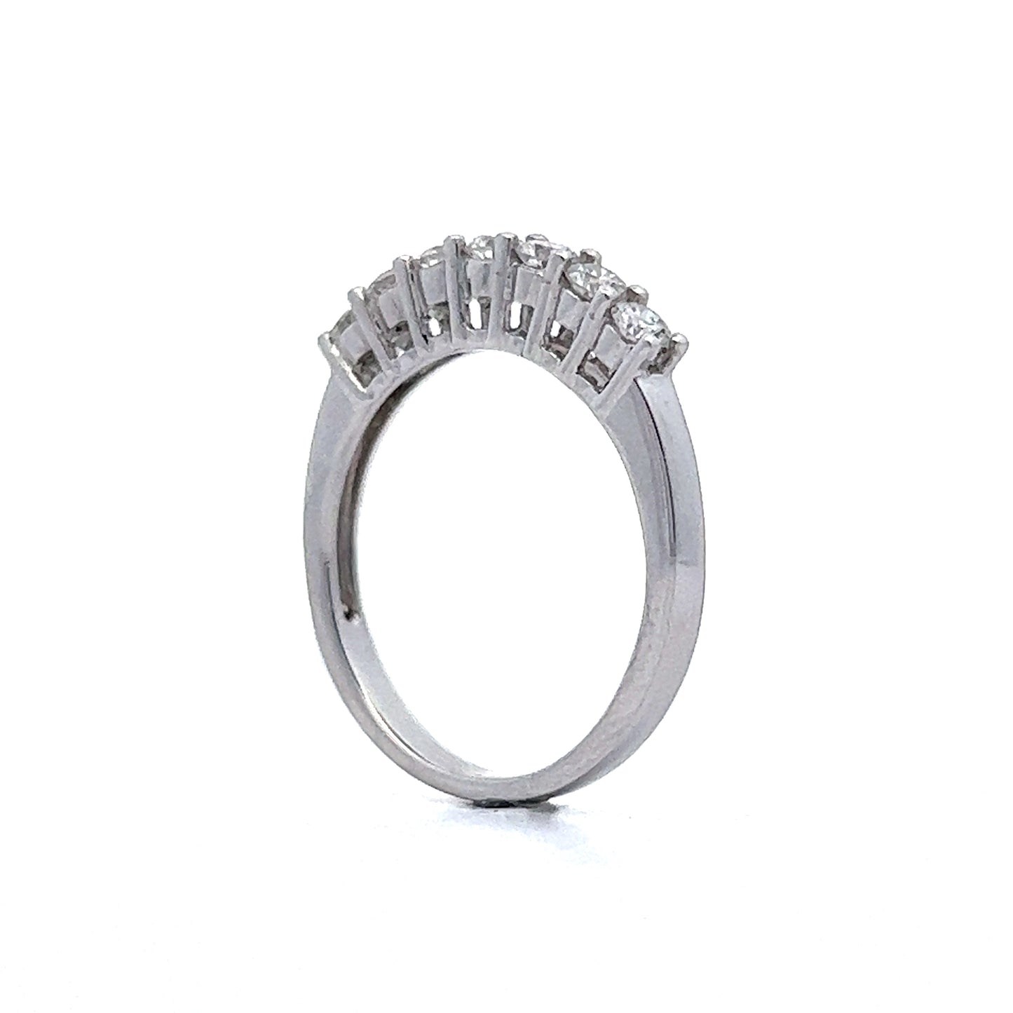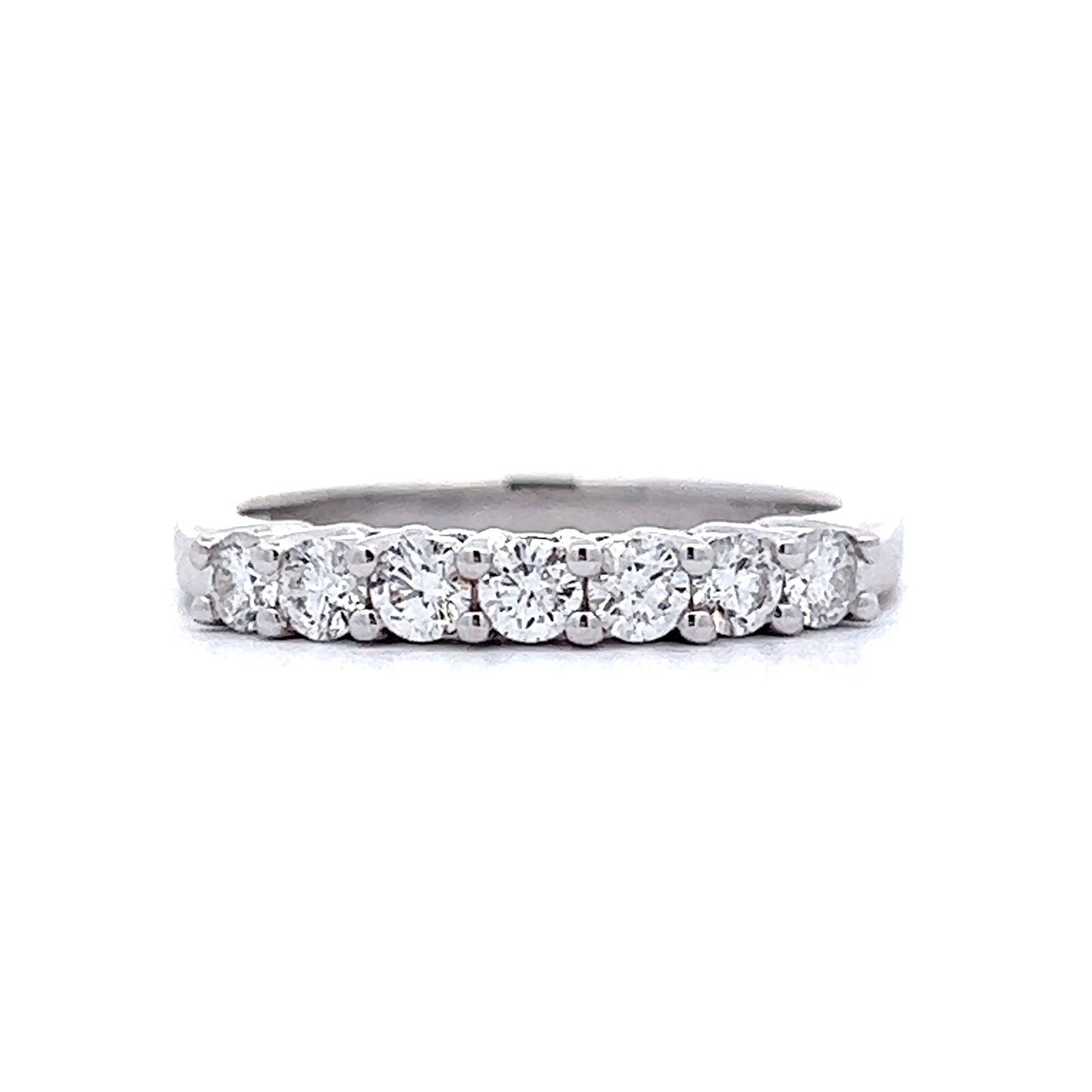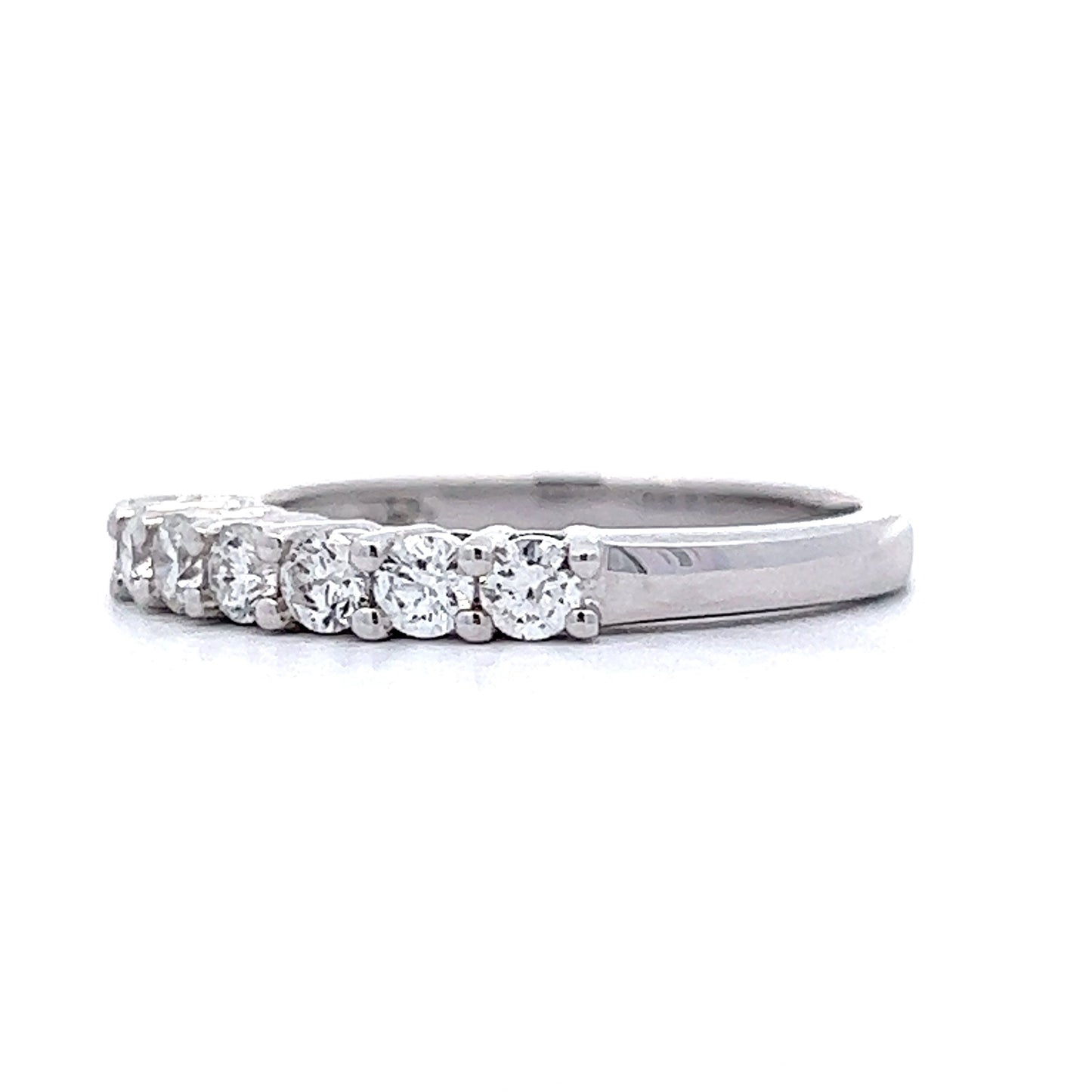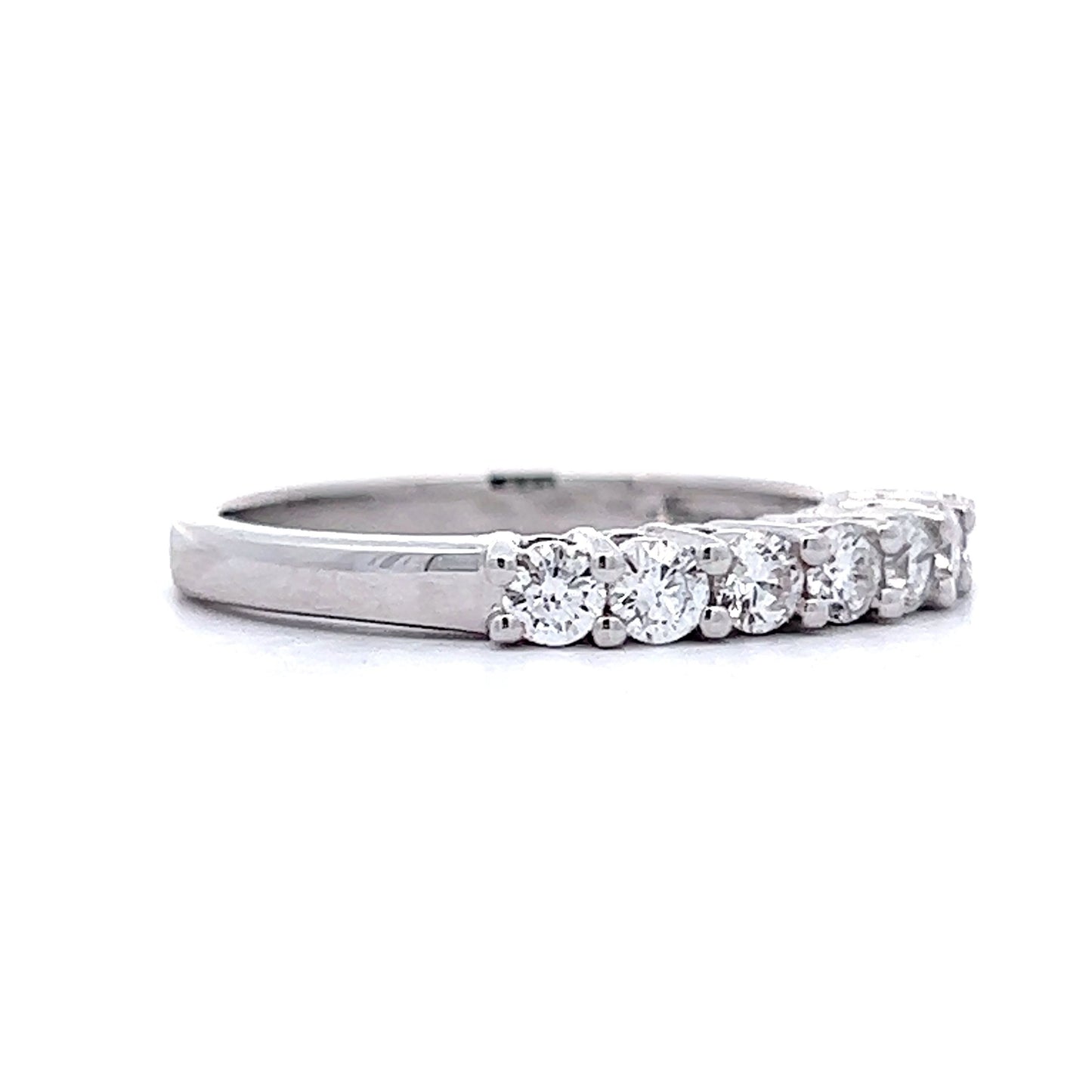 .53 Diamond Wedding Band in 14k White Gold. This modern wedding band features .53 carats of diamonds finished in polished 14 karat white gold. Seven (7) .075 carat brilliant diamonds are set in distinctive shared prongs at the head of the ring. From the profile, the gallery showcases elevated basket mountings for the diamonds, bringing a delicate texture to the band. Measuring 2.77mm wide, this diamond wedding ring is versatile enough to pair with any style of engagement ring and comfortable for daily wear.