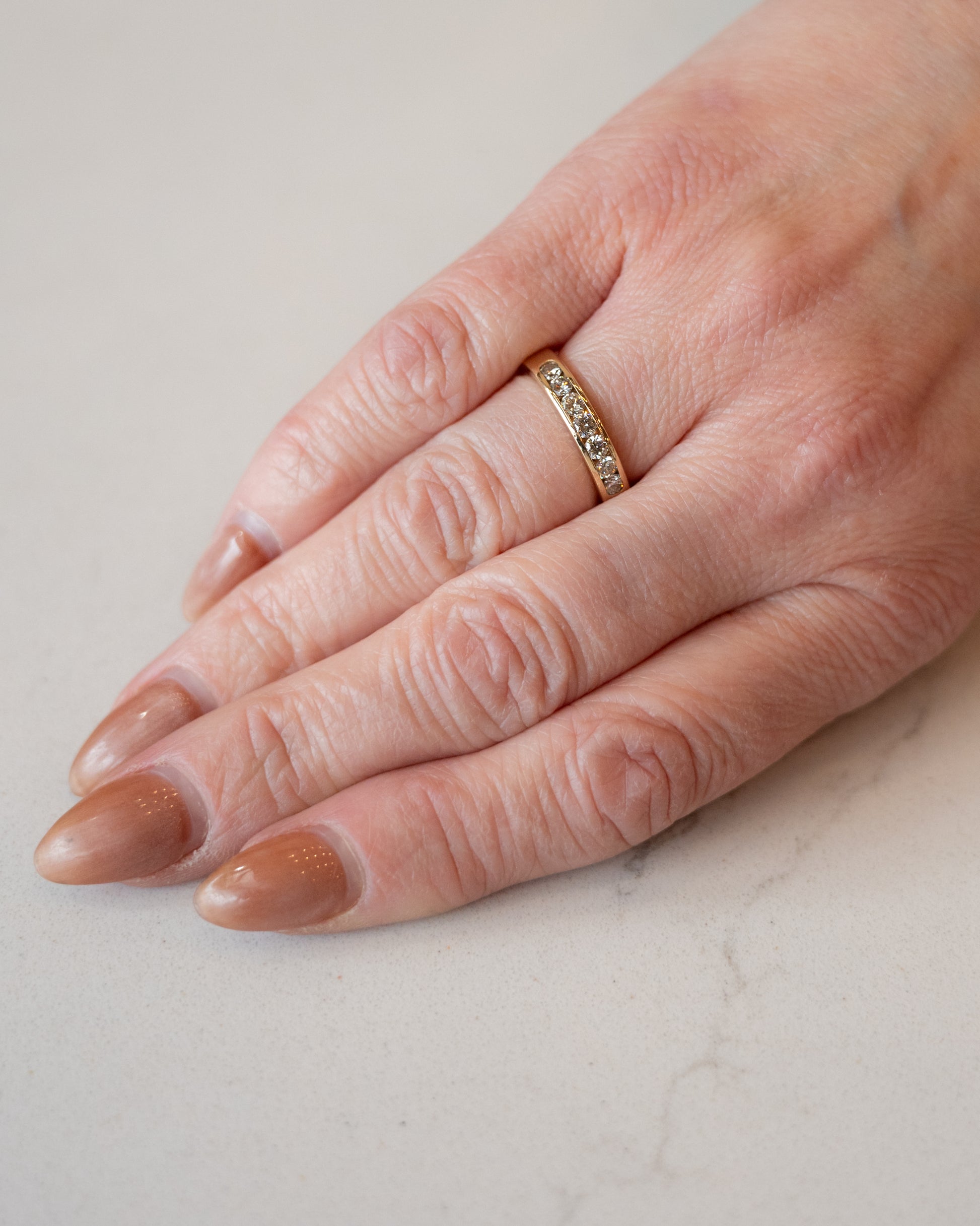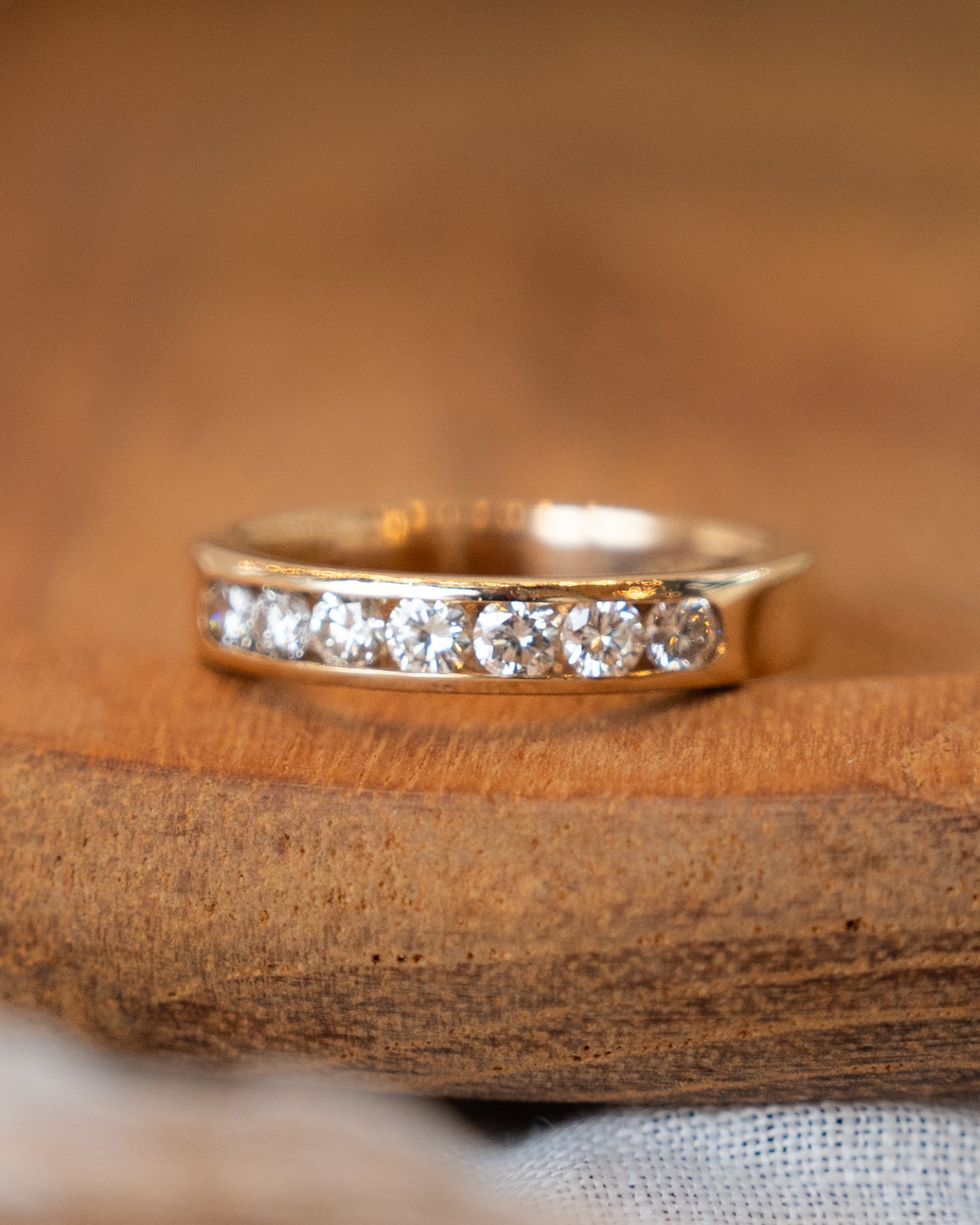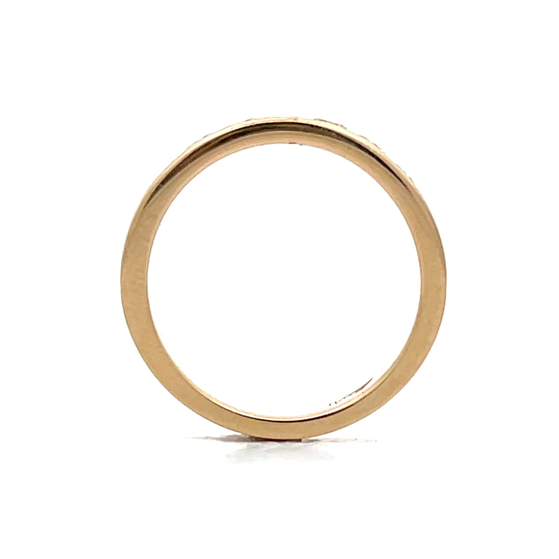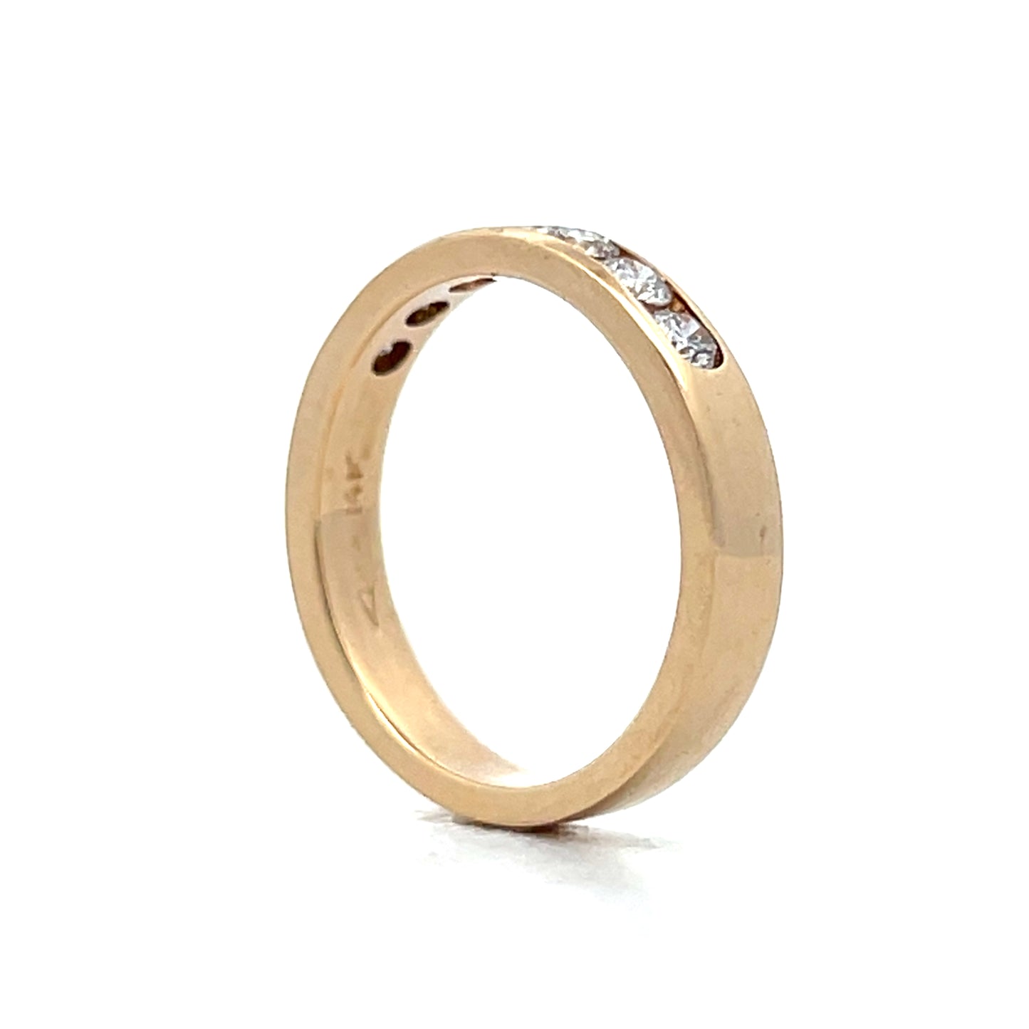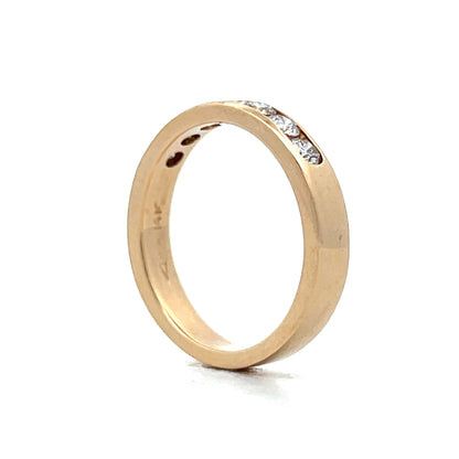 This channel set wedding band in 14 karat yellow gold holds round brilliant cut diamonds (total .54 carats, VS2 clarity, H color) securely within its flat-edge design. The diamonds shine brightly against the yellow gold's warm tone. The band's smooth surface combines simplicity with brilliance.