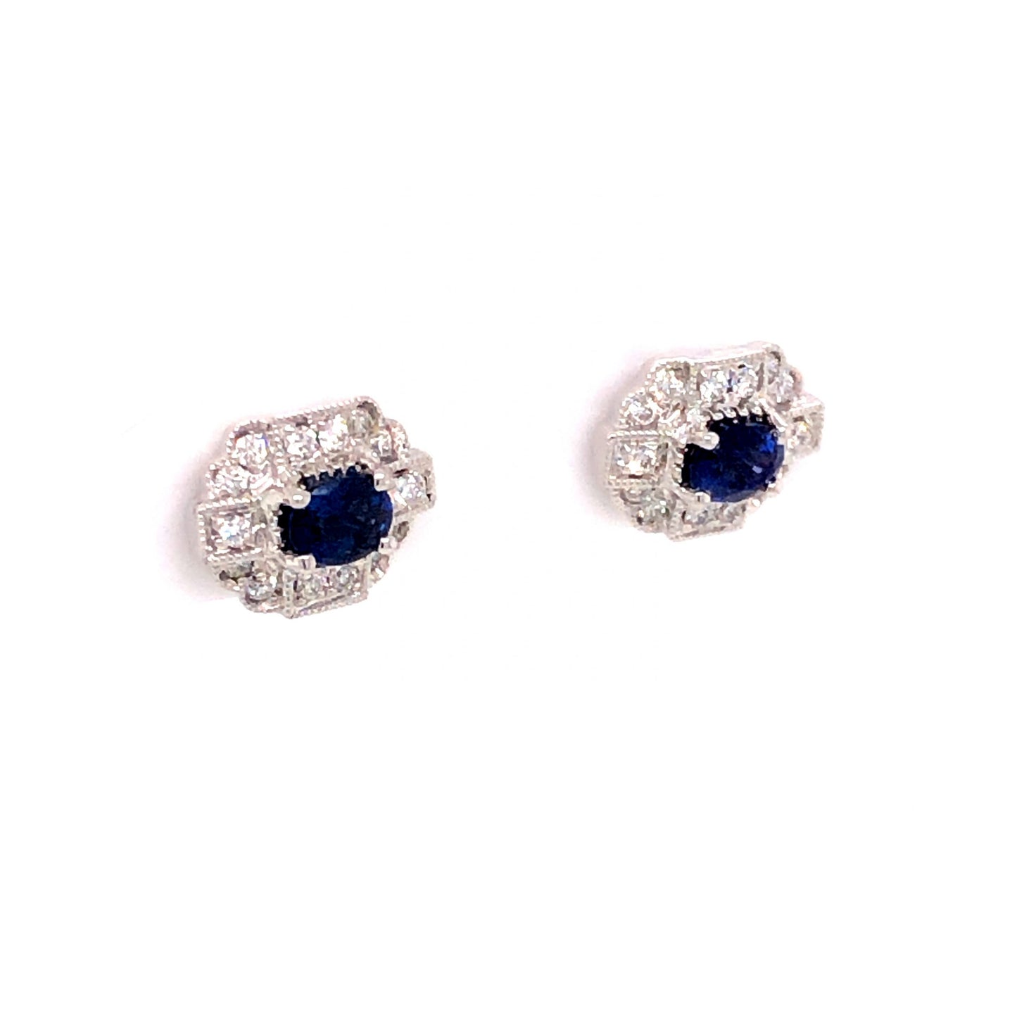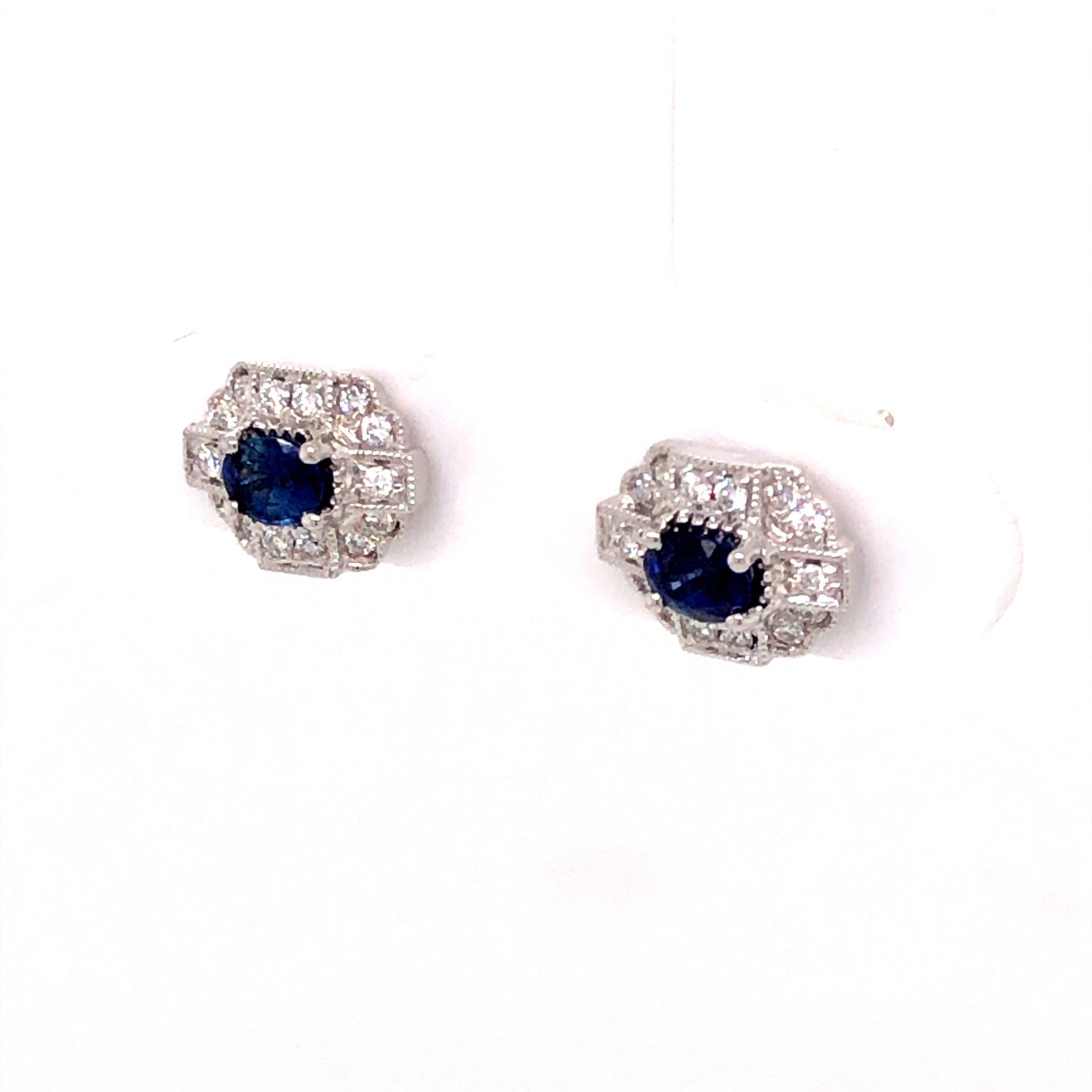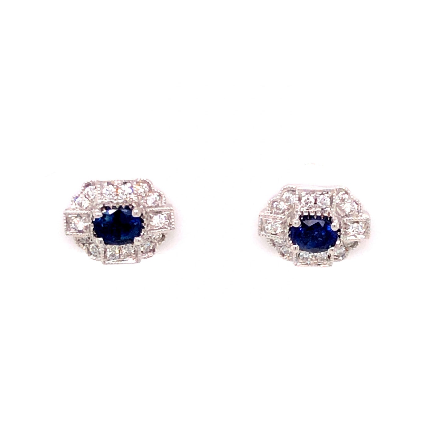 .54 Oval Cut Sapphire Diamond Stud Earrings in 18k White Gold. These structured stud earrings feature .54 carats of blue sapphires and .19 carats of accent diamonds finished in 18 karat white gold. The two (2) .27 carat sapphires are oval cut and prong set. The sapphires have a highly saturated, royal blue hue and are accented by twenty-eight (28) .0068 carat diamonds. The near colorless diamonds have a lovely sparkle and are set on a milgrain 18k white gold backing.