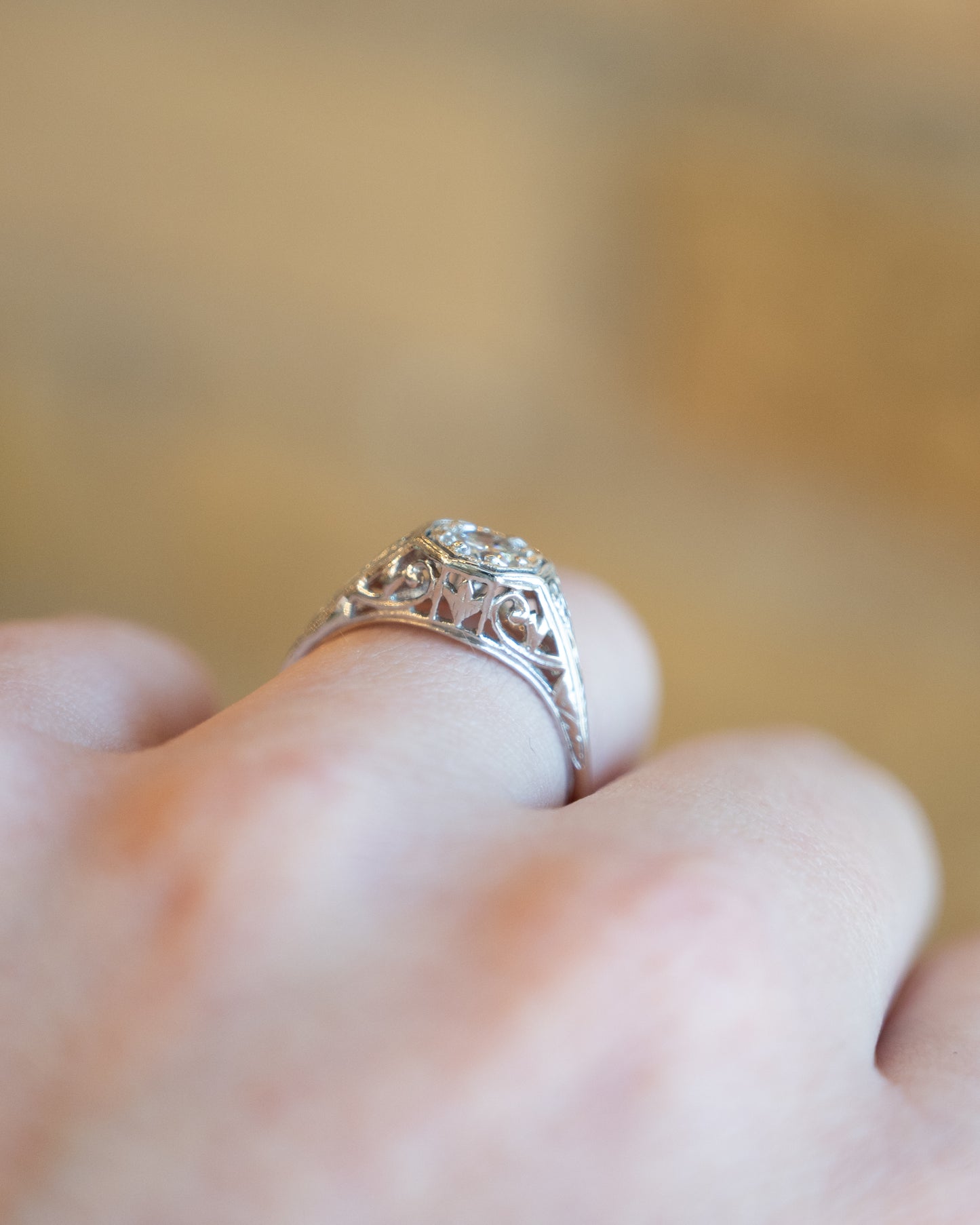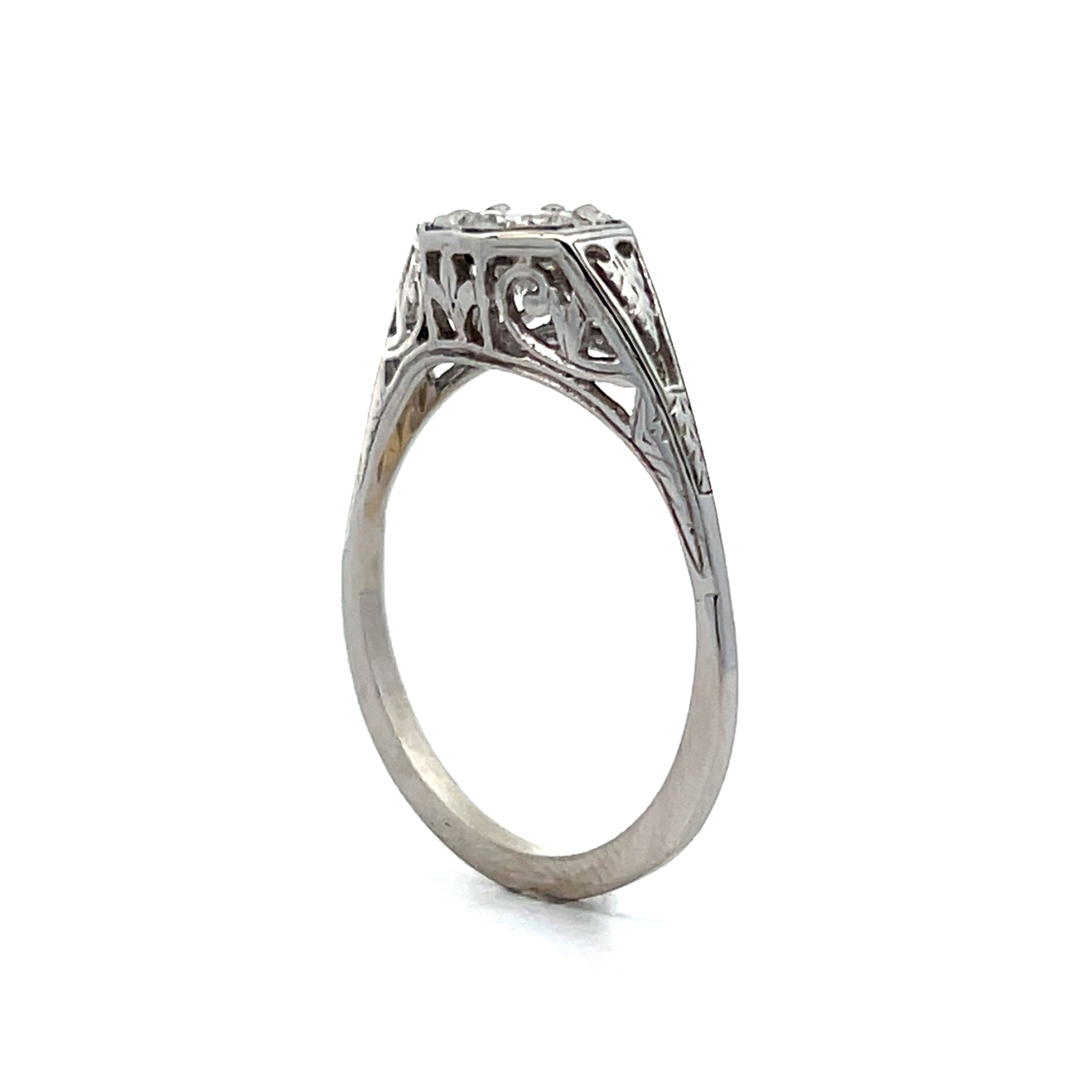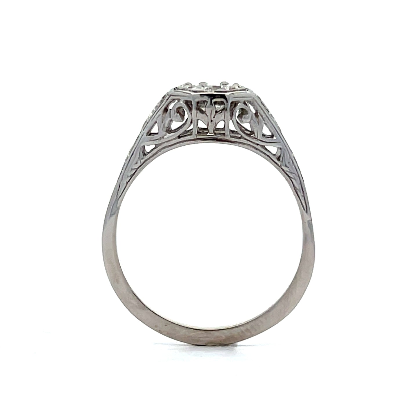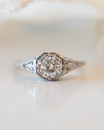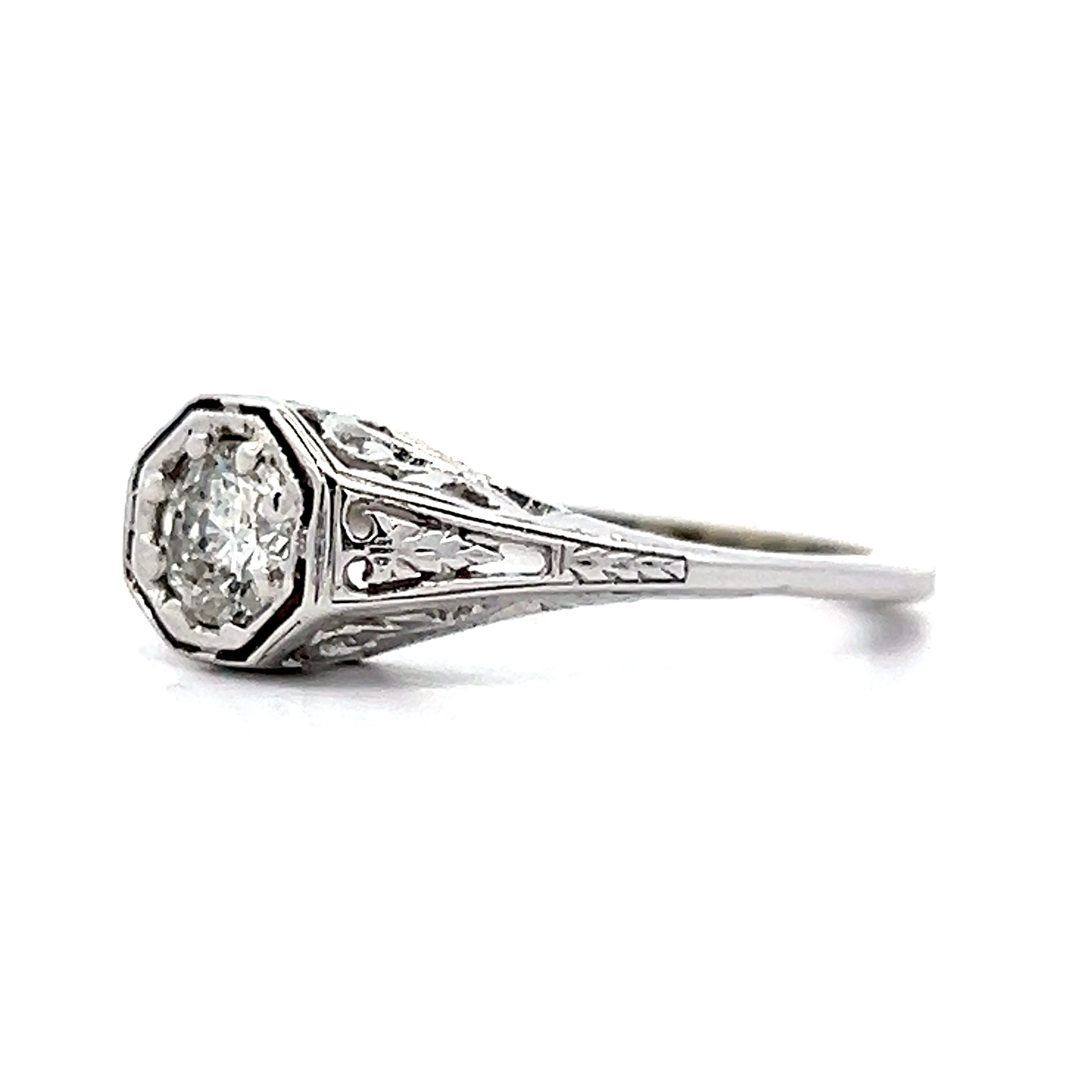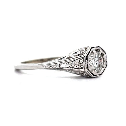 This vintage Art Deco diamond engagement ring features a .54 carat round brilliant cut diamond set in 14 karat white gold. The diamond has an F color grade (almost completely colorless). This ring has all the hallmarks of an Art Deco ring with its open filigree metal work, geometric shapes and gorgeous wheat pattern engraving.