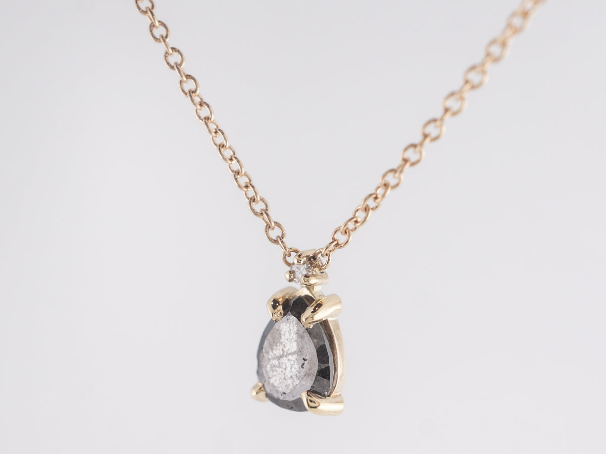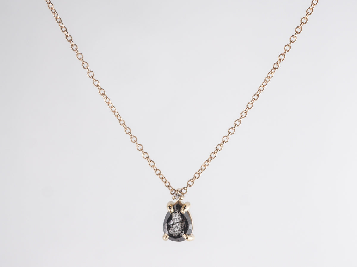 .55 Black Diamond Necklace in 14K Yellow Gold. This enchanting 18” necklace features a .55 carat natural black diamond in 14k yellow gold. The teardrop black diamond is set in four prongs. At the necklace bail, a .015 carat natural diamond accentuates the peak of the primary stone. This modern black diamond necklace will look fabulous paired with your favorite LBD!