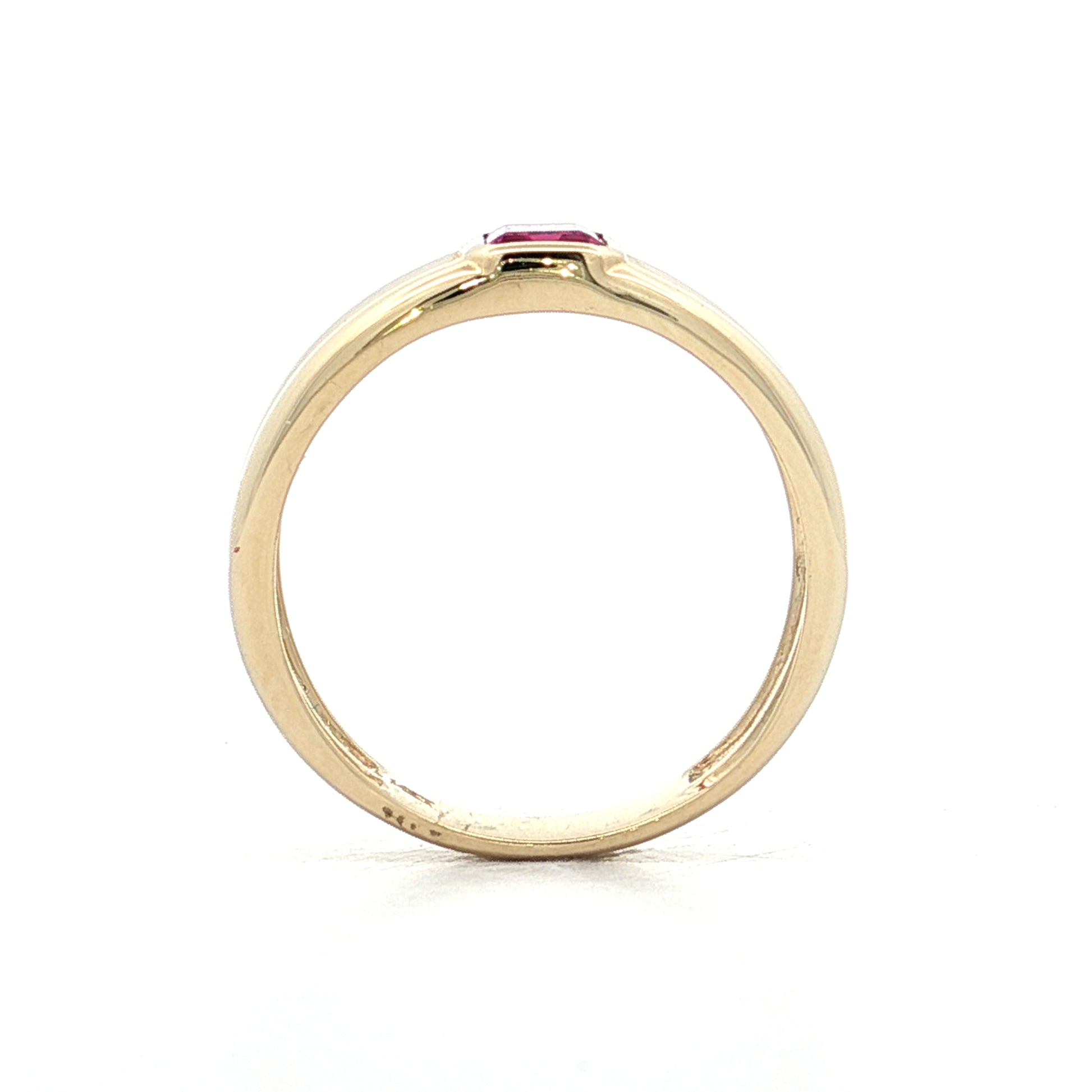 This 14 karat yellow gold stacking ring features a .55 carat emerald cut pink tourmaline set in a bezel setting. The emerald cut's rectangular facets and step-cut style create long, clean flashes of light that highlight the tourmaline's vivid pink color rather than scattering light into rainbow sparkle.