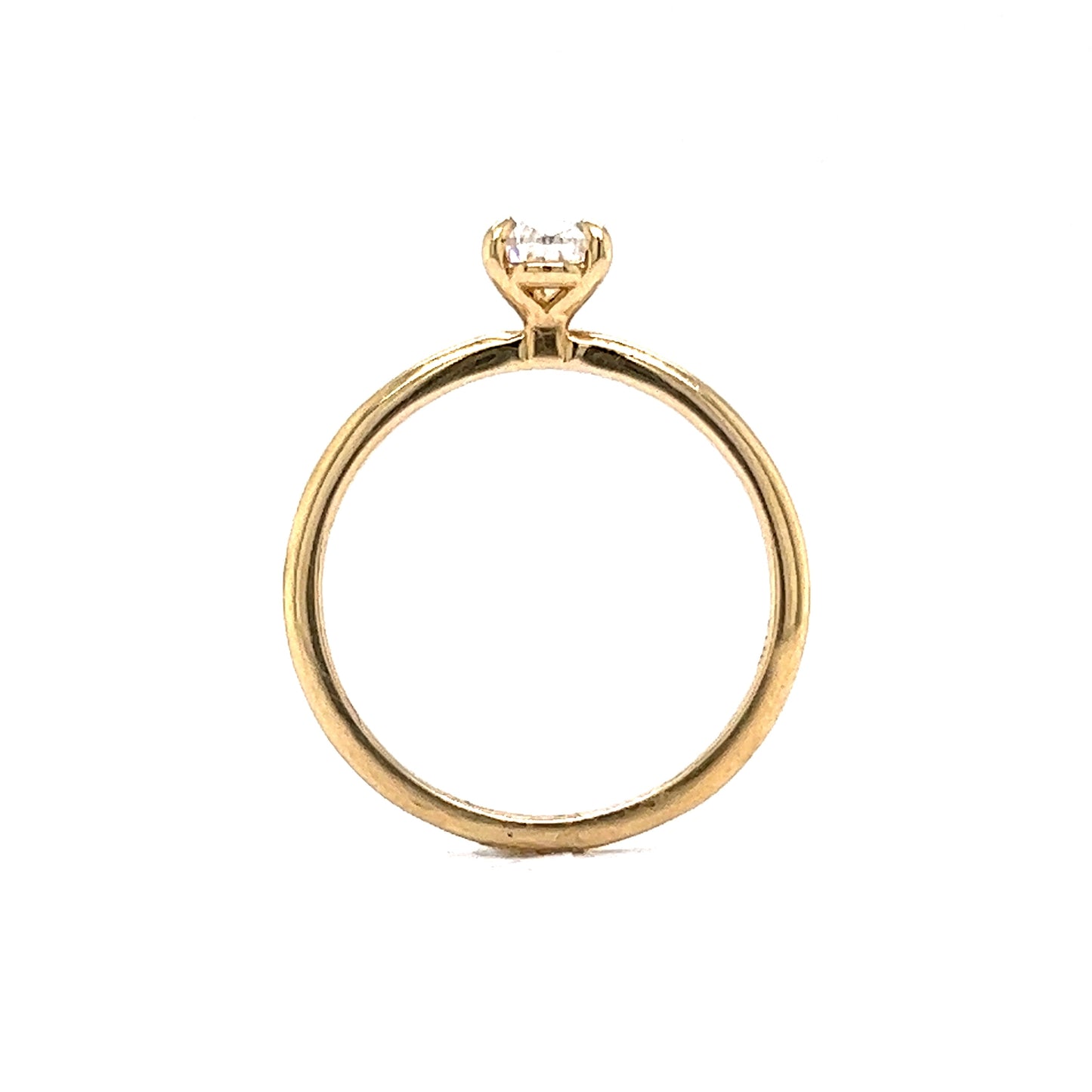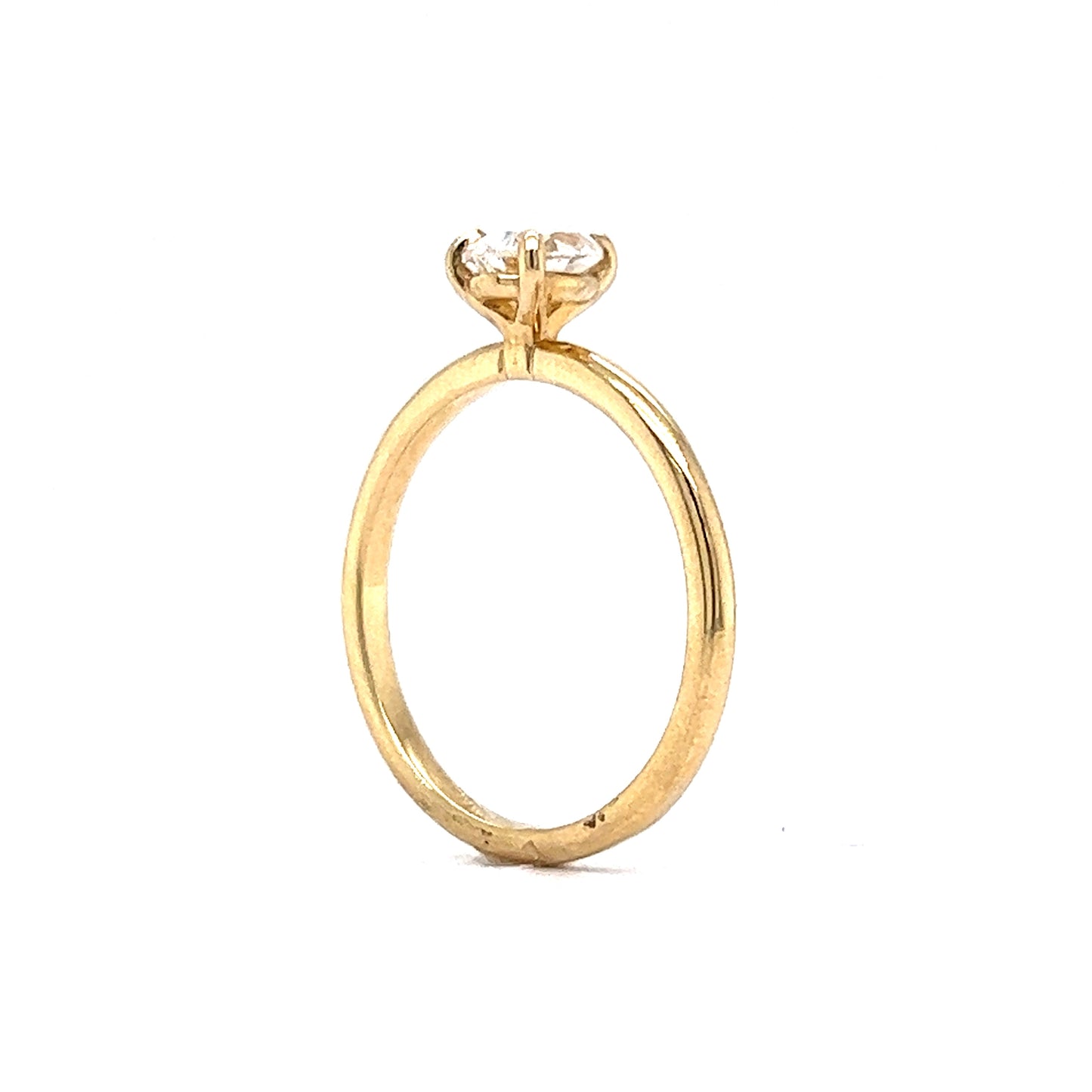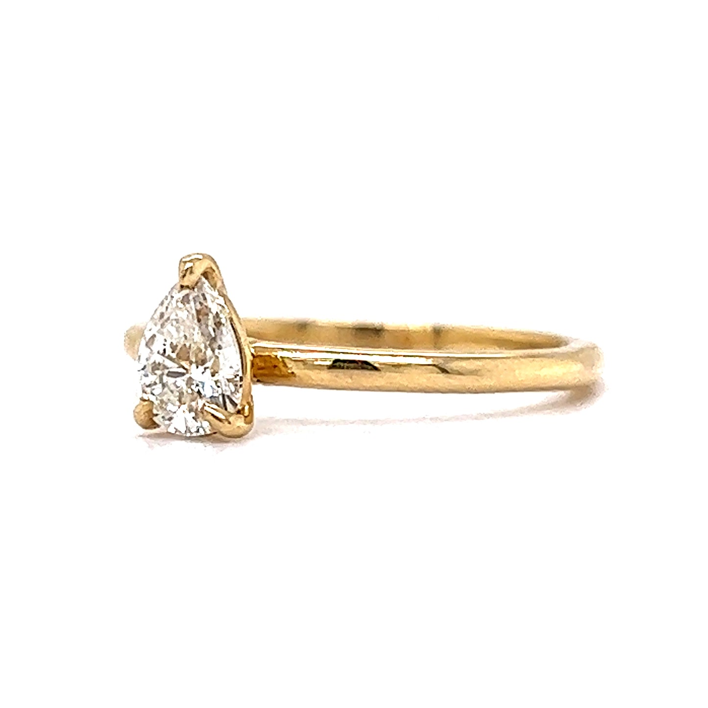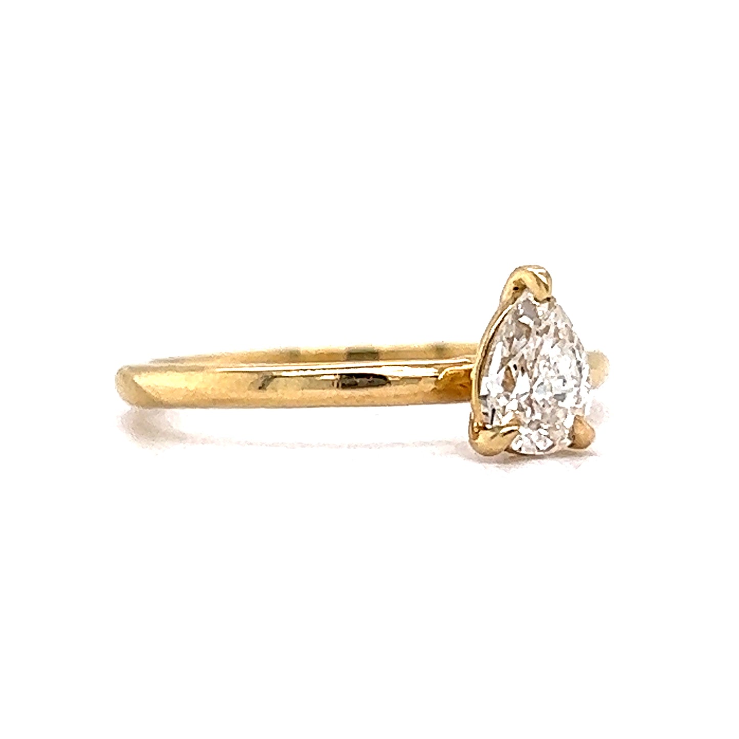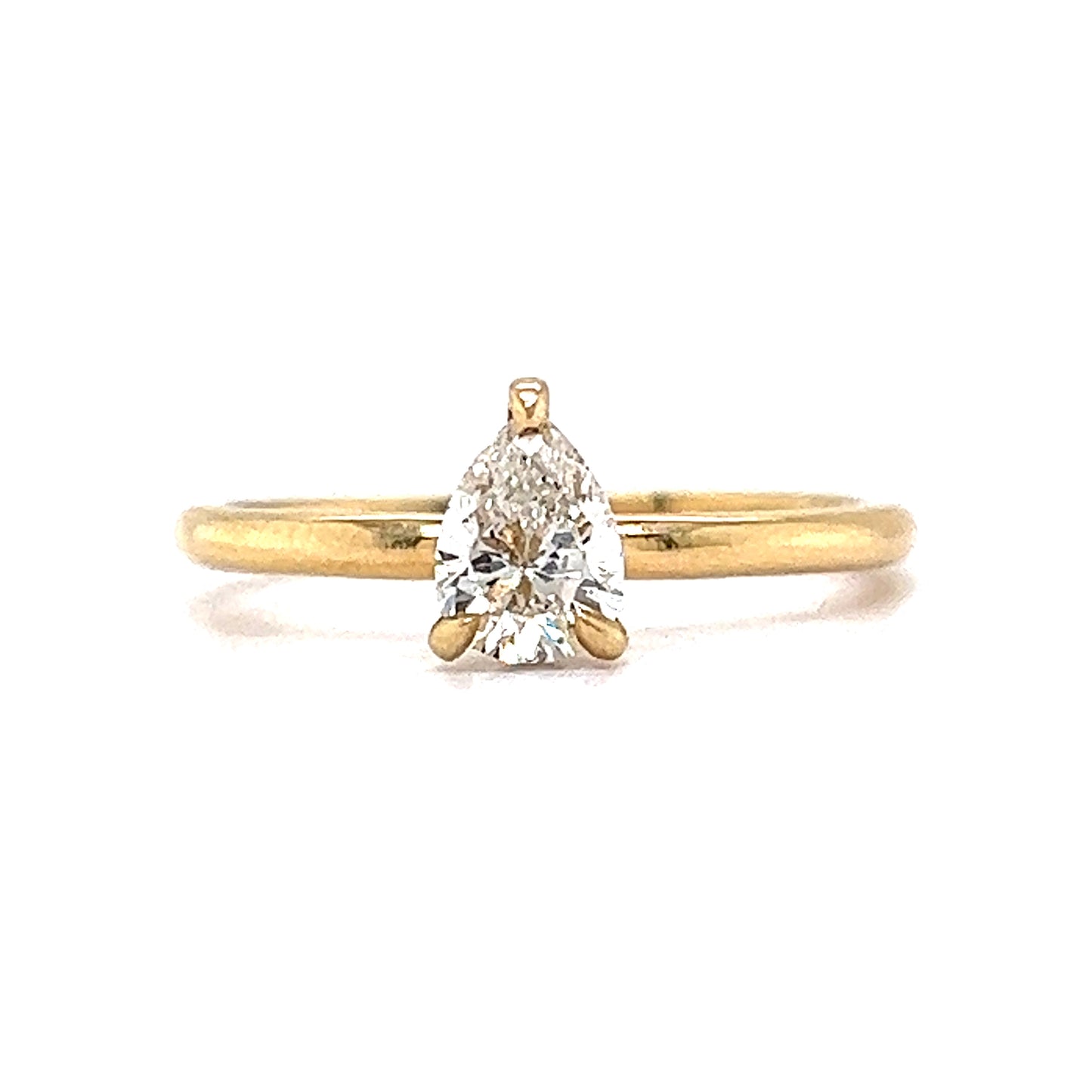 .55 Pear Cut Solitaire Diamond Engagement Ring in 14k. This timeless solitaire engagement ring features a .55 carat pear cut diamond finished in 14 karat yellow gold. The near colorless diamond is set in three golden prongs and showcases elegant amounts of brilliance and fire. From the profile, the diamond is set on a sleek, peg head mounting and finished on a polished 14 karat yellow gold band. This engagement ring is dazzling and expertly crafted. A modern minimalist’s dream!