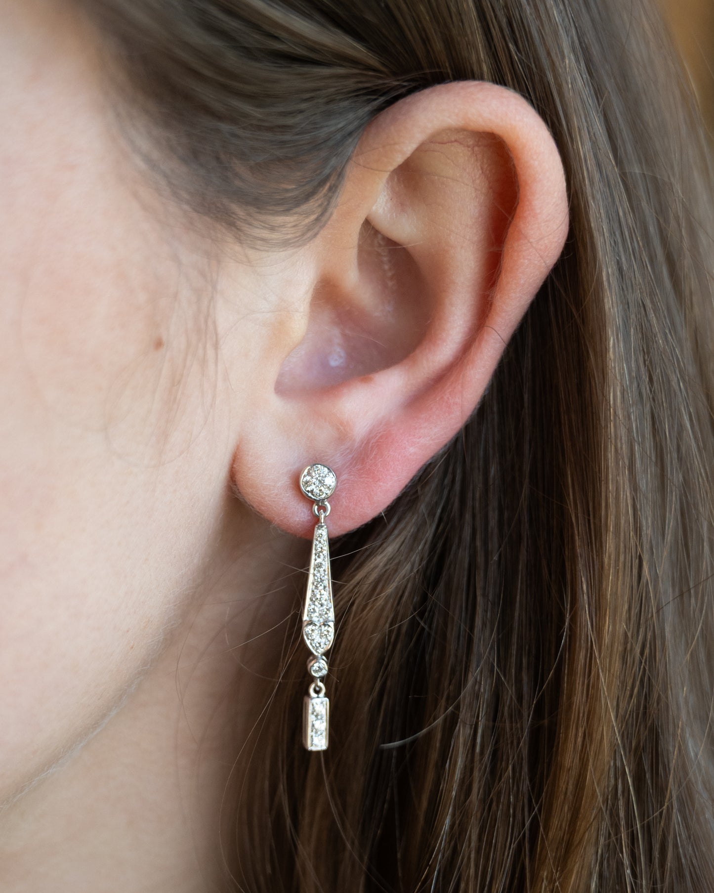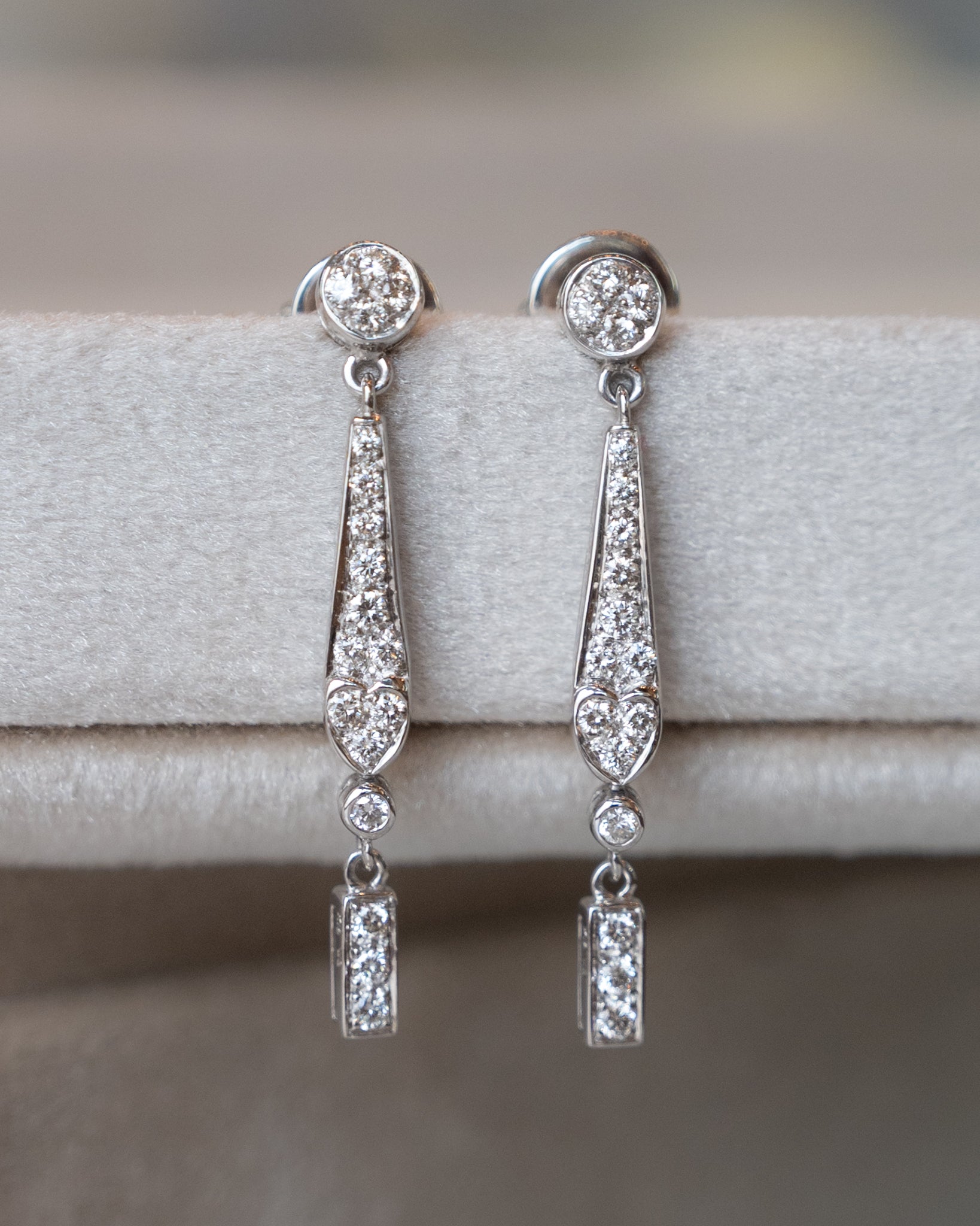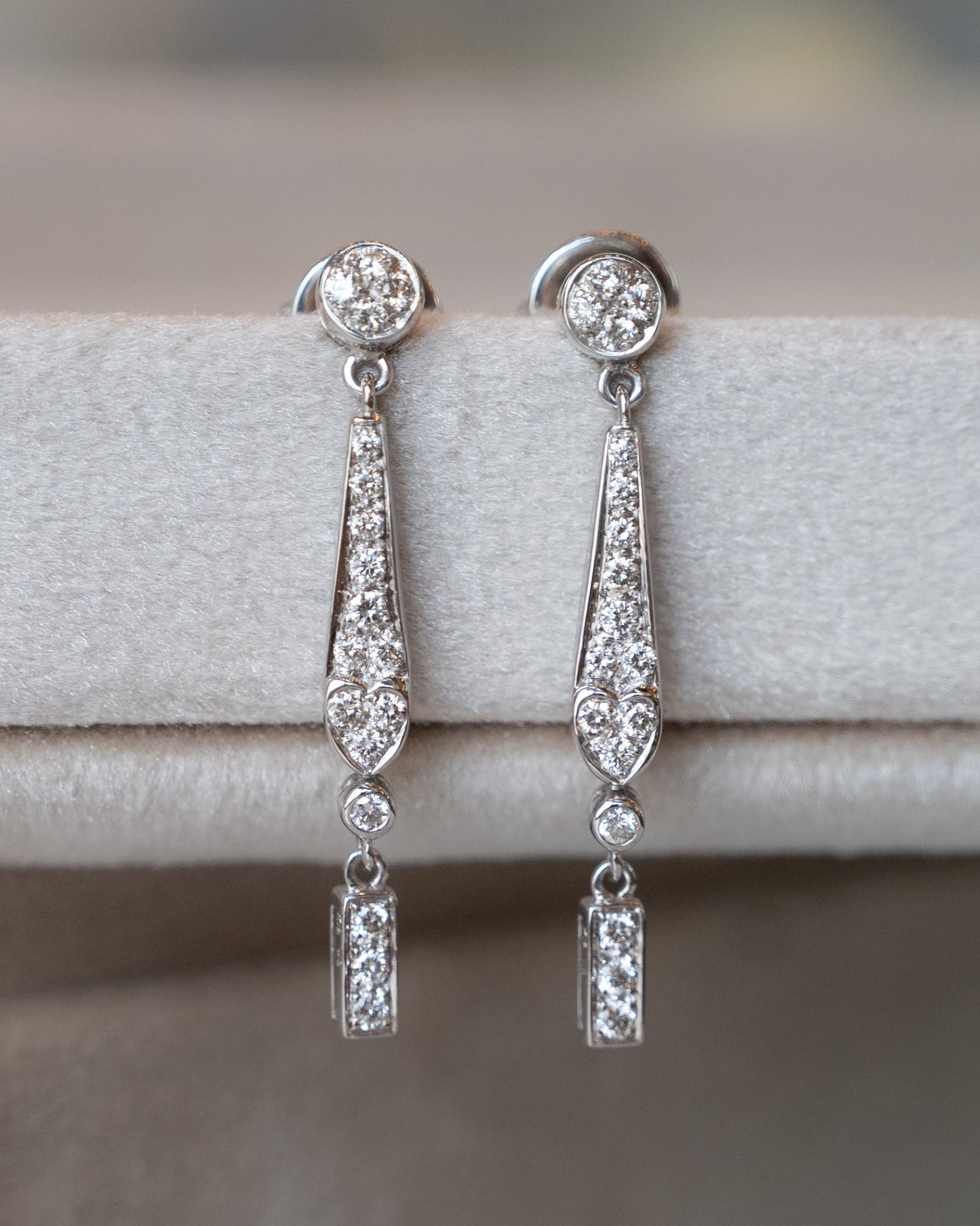 These 18-karat white gold drop earrings feature an Art Deco inspired geometric design with round brilliant cut diamonds totaling .57 carats. The diamonds are graded SI1 clarity with H color, delivering clean brilliance in each stone. These earrings are very wearable and are quite versatile. Dress them up or down!