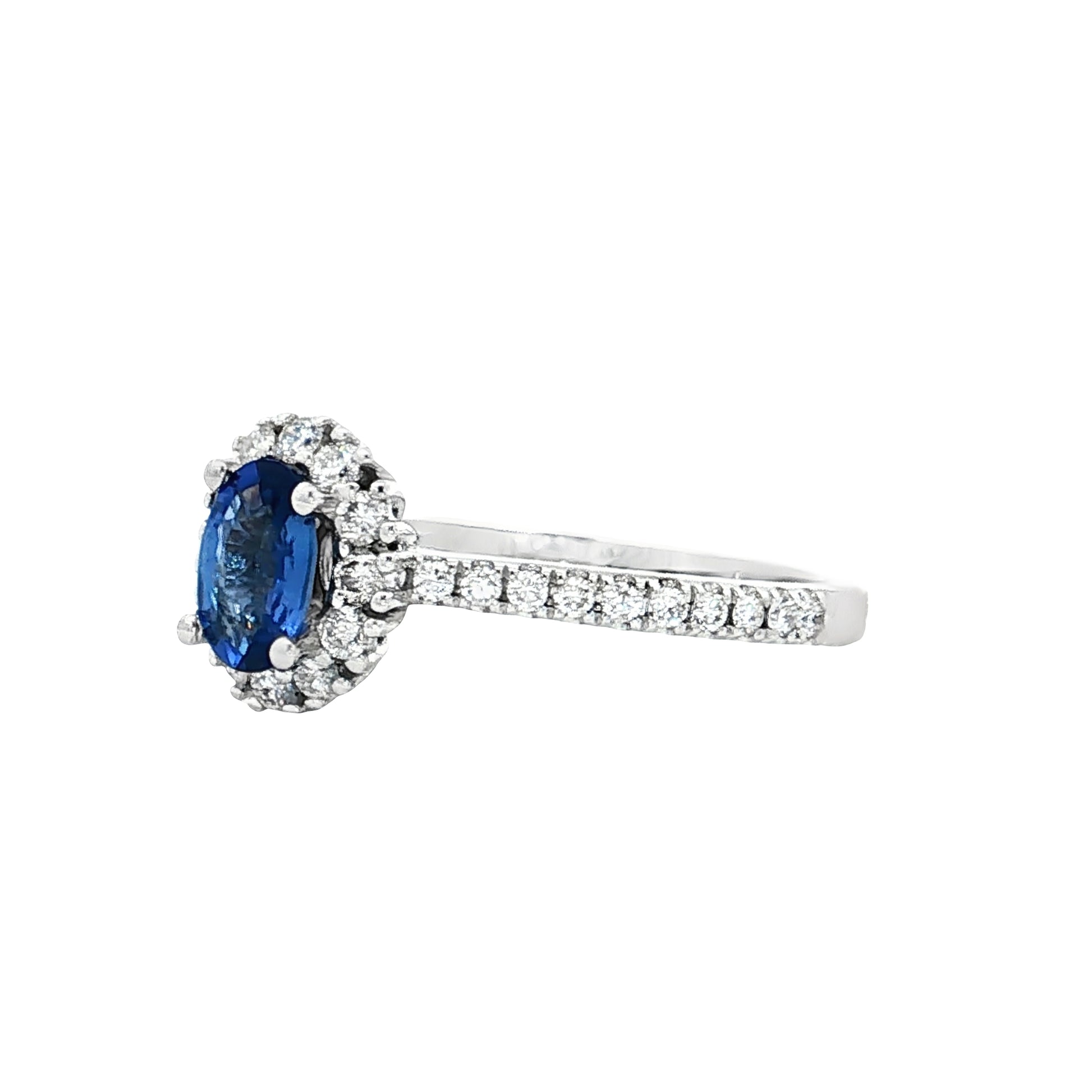 This 14 karat white gold engagement ring features a .57 carat oval blue sapphire as its centerpiece, surrounded by a halo of thirty-two round brilliant cut diamonds measuring 1.3mm each and totaling .32 carats.