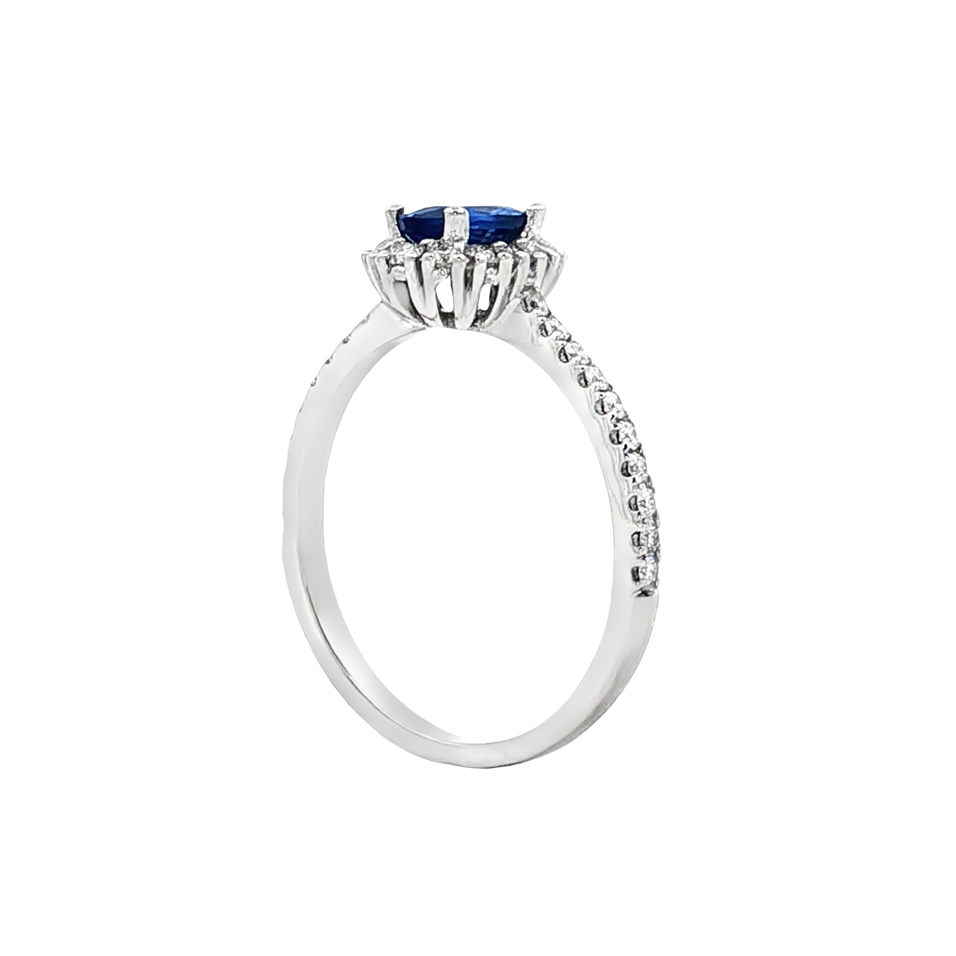 The round brilliant cut diamonds maximize sparkle through their 58 precisely angled facets, while the halo design makes the center stone appear larger than its actual carat weight. Additional pavé-set round brilliant cut diamonds line the band, extending the sparkle from the halo down both sides of the finger. The white gold setting complements both the cool blue sapphire and the colorless diamonds, creating a cohesive look that works well for daily wear.