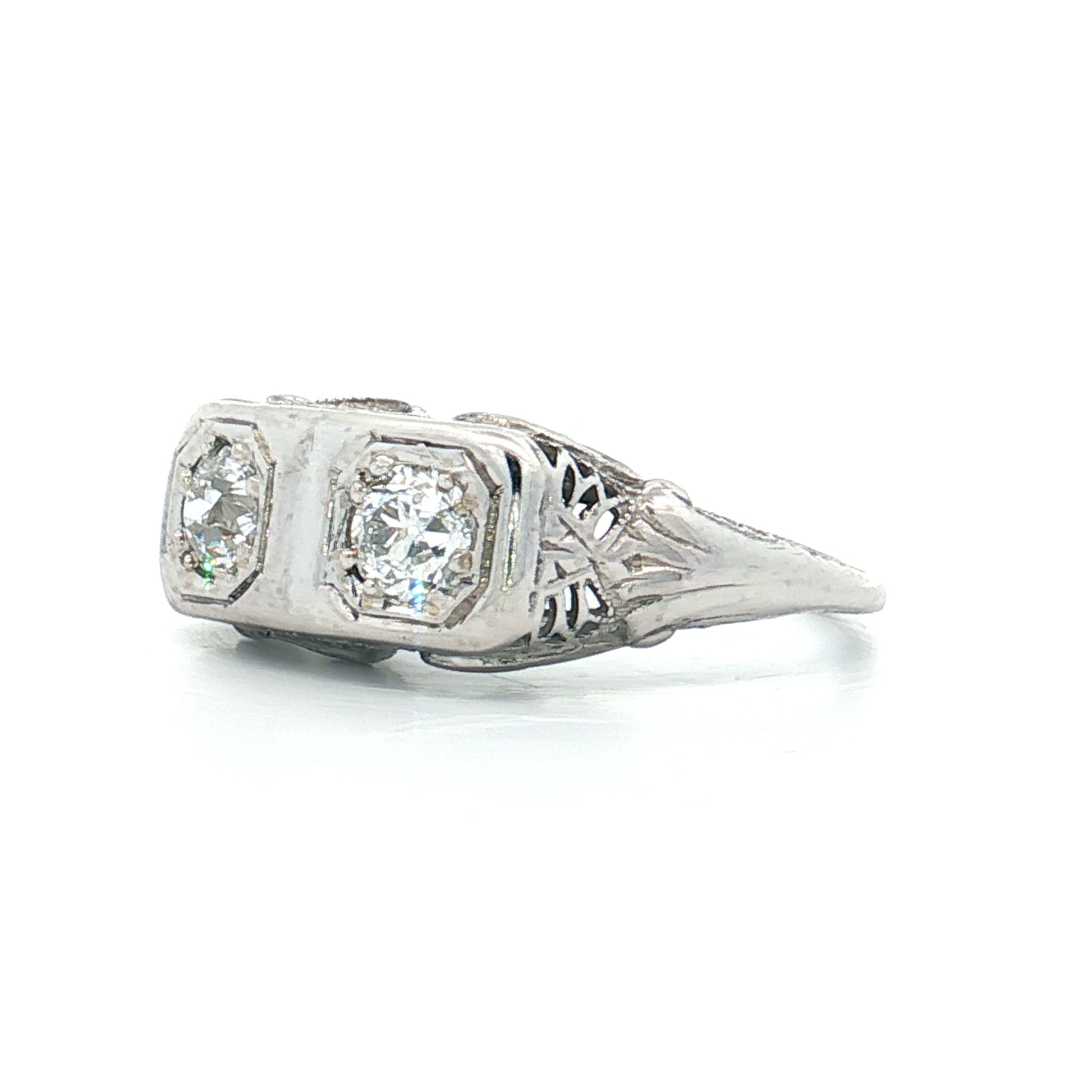 The mounting showcases detailed filigree work and milgrain beading along the edges, both signature techniques from the Art Deco period. The Toi et Moi design places two diamonds side by side, and this ring sits low on the finger, making it comfortable for everyday wear.