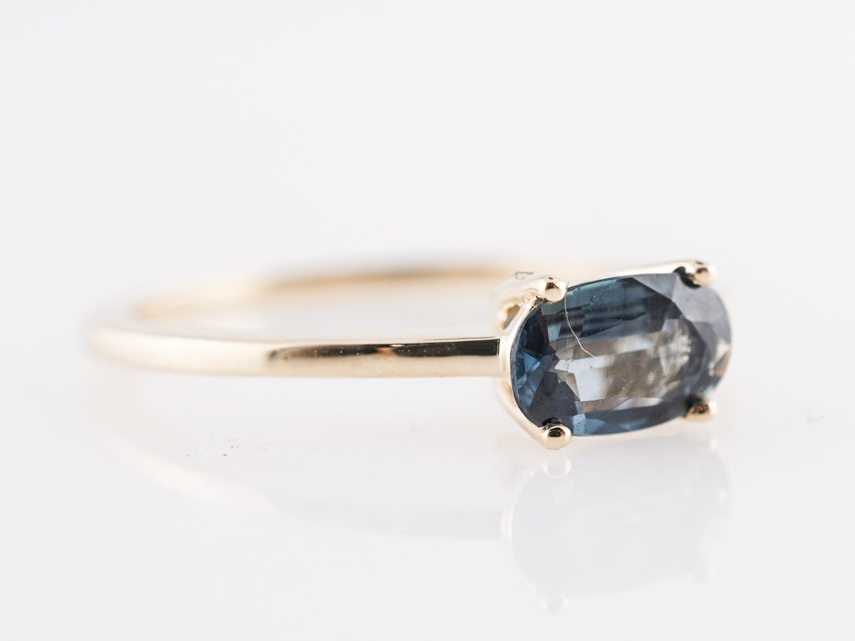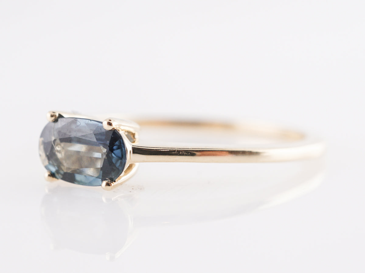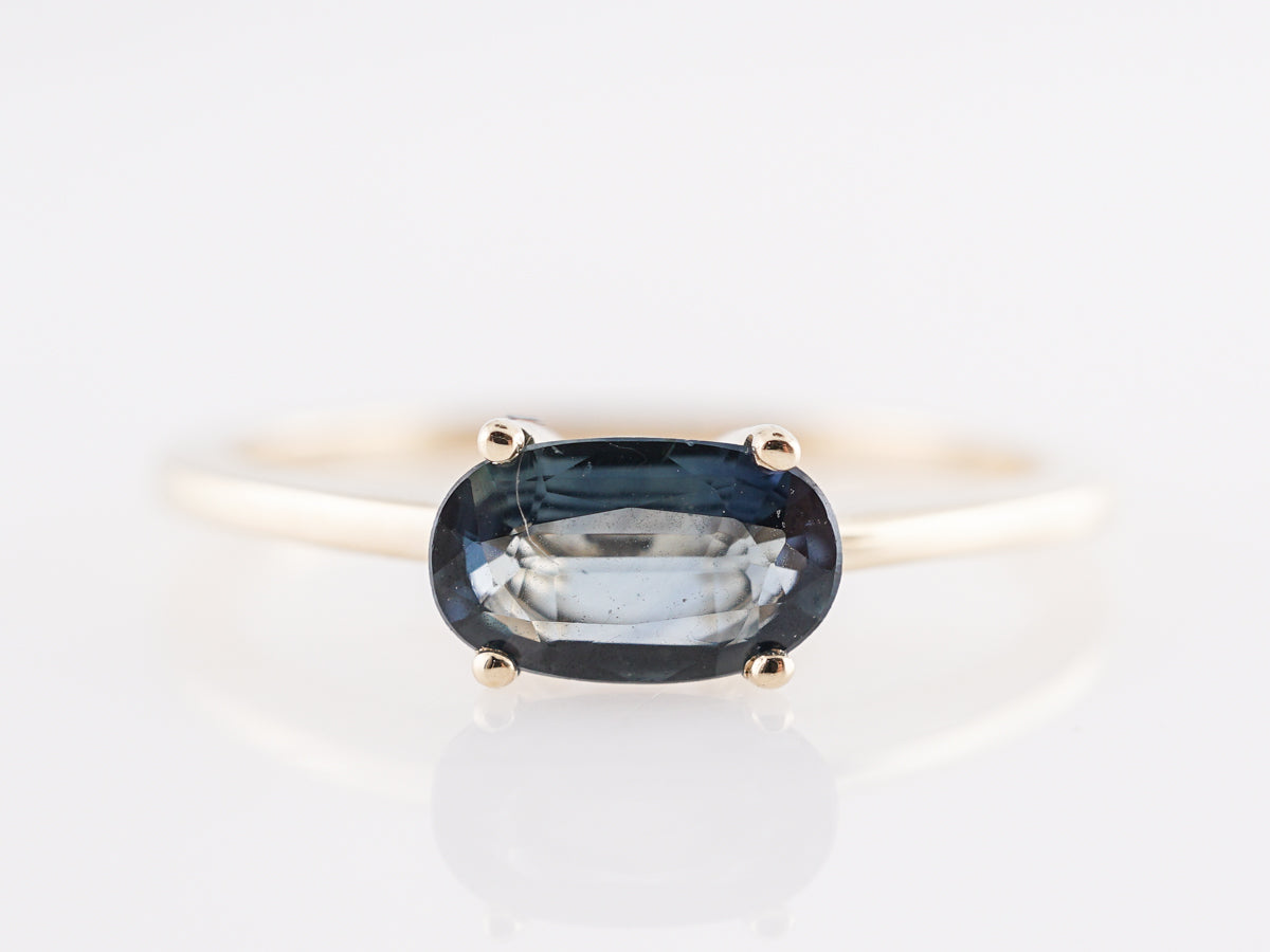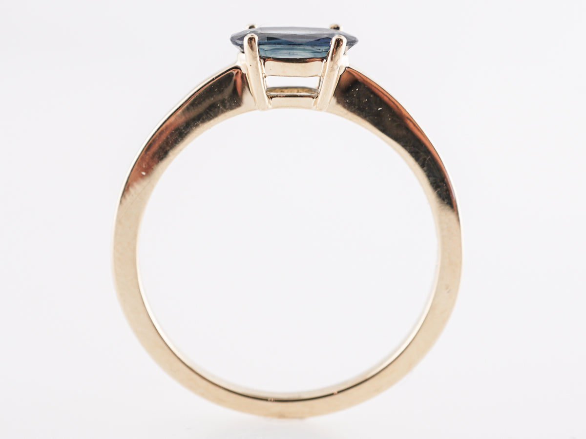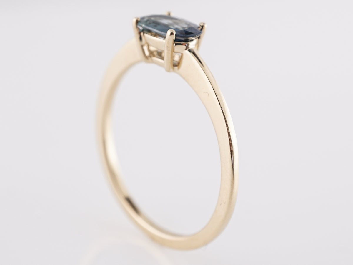 .58 Solitaire Sapphire Engagement Ring in 14K Yellow Gold. This .58 carat deeply saturated, cool-toned sapphire reflects a spectrum of colors from darker Aegean to Prussian blue. The primary stone is set in four (4) prongs on a 14k yellow gold band. From the silhouette, the slender, golden band is slightly tapered near the head of the stone. This traditional, solitaire engagement ring can be resized as needed.