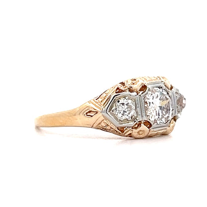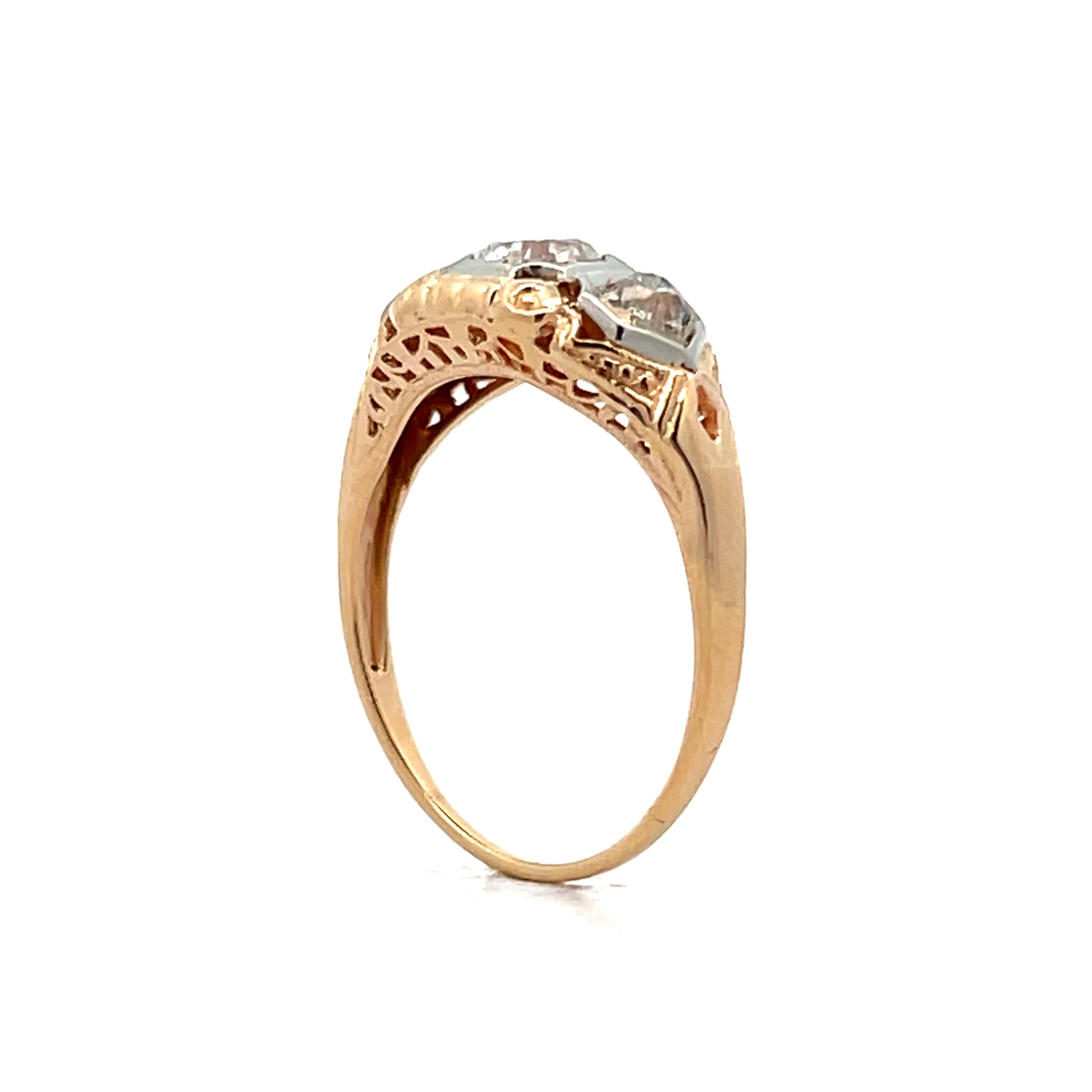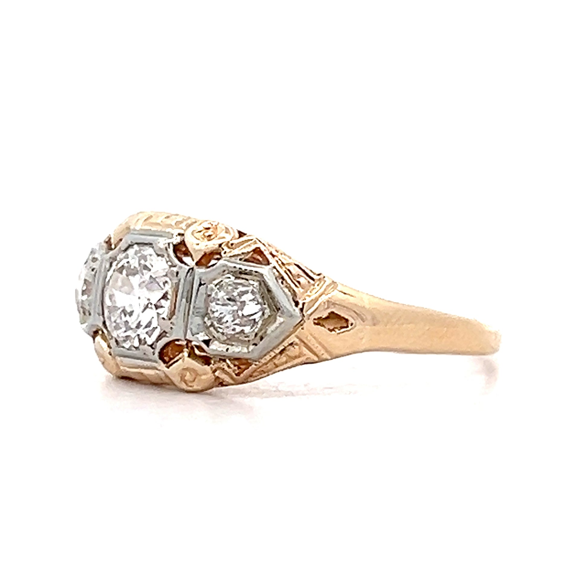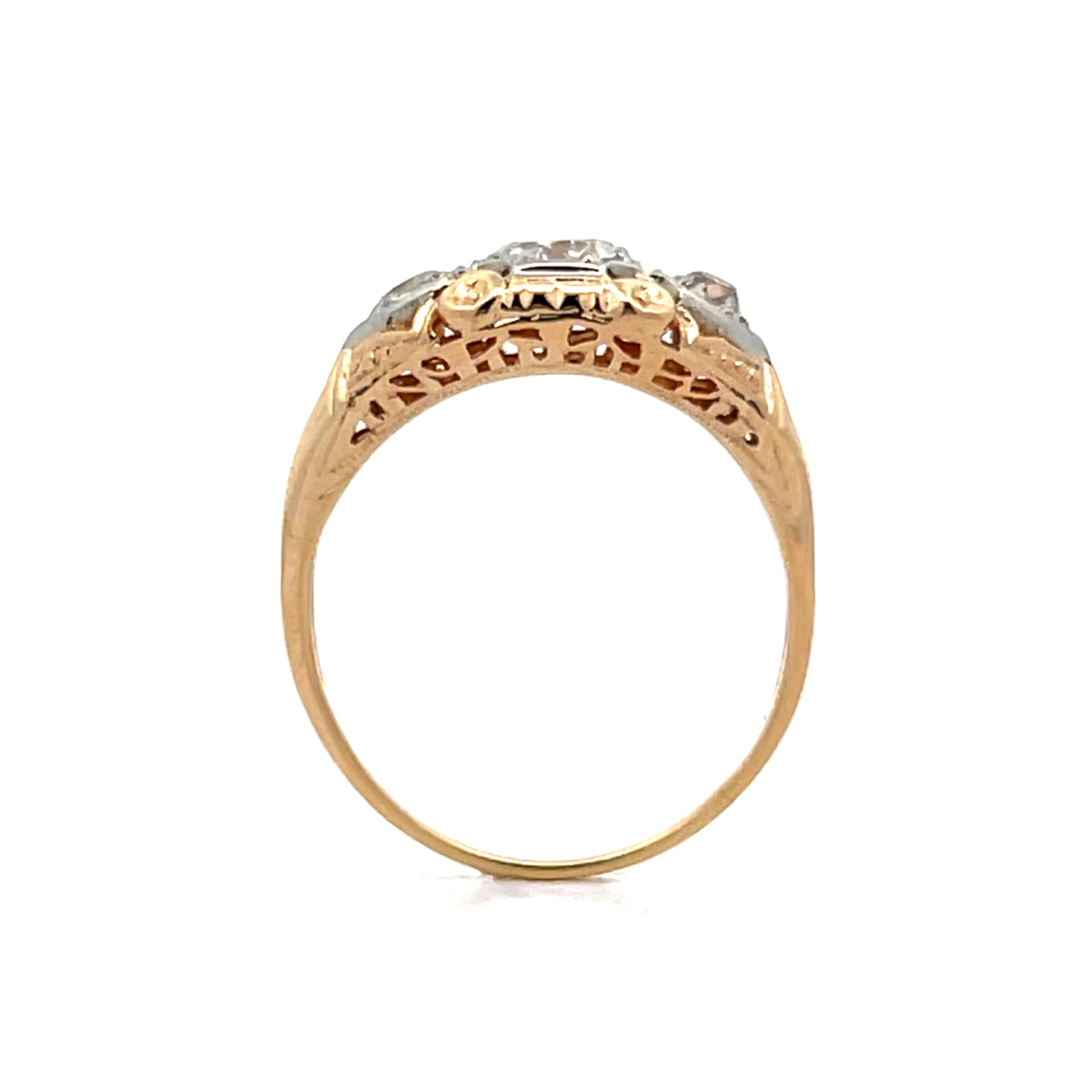 This vintage three-stone engagement ring blends 18 karat yellow gold and 14 karat white gold for a striking two-tone design. At the center is a .43 carat Old European cut diamond with G color and SI2 clarity, known for its distinctive facets and brilliant sparkle. Flanking the center stone are two natural diamonds, each measuring 2.70mm and weighing .08 carats, adding extra shimmer. Filigree details add a delicate texture, complementing the mix of metals and enhancing its appeal.