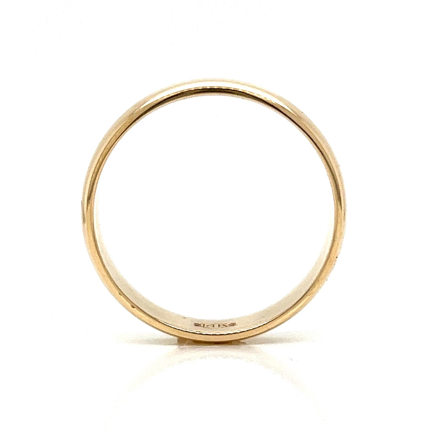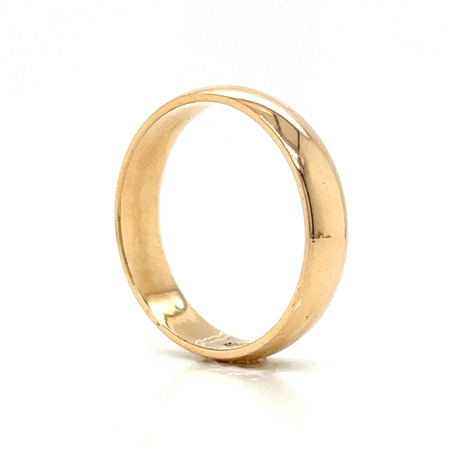This classic men’s yellow gold wedding band features a thick 5mm wide band in high polish 14 karat yellow gold. The band has a comfortable weight of 4.6 grams and is perfect for everyday wear. A style of men’s wedding band that is tried and true. Modern handsome.