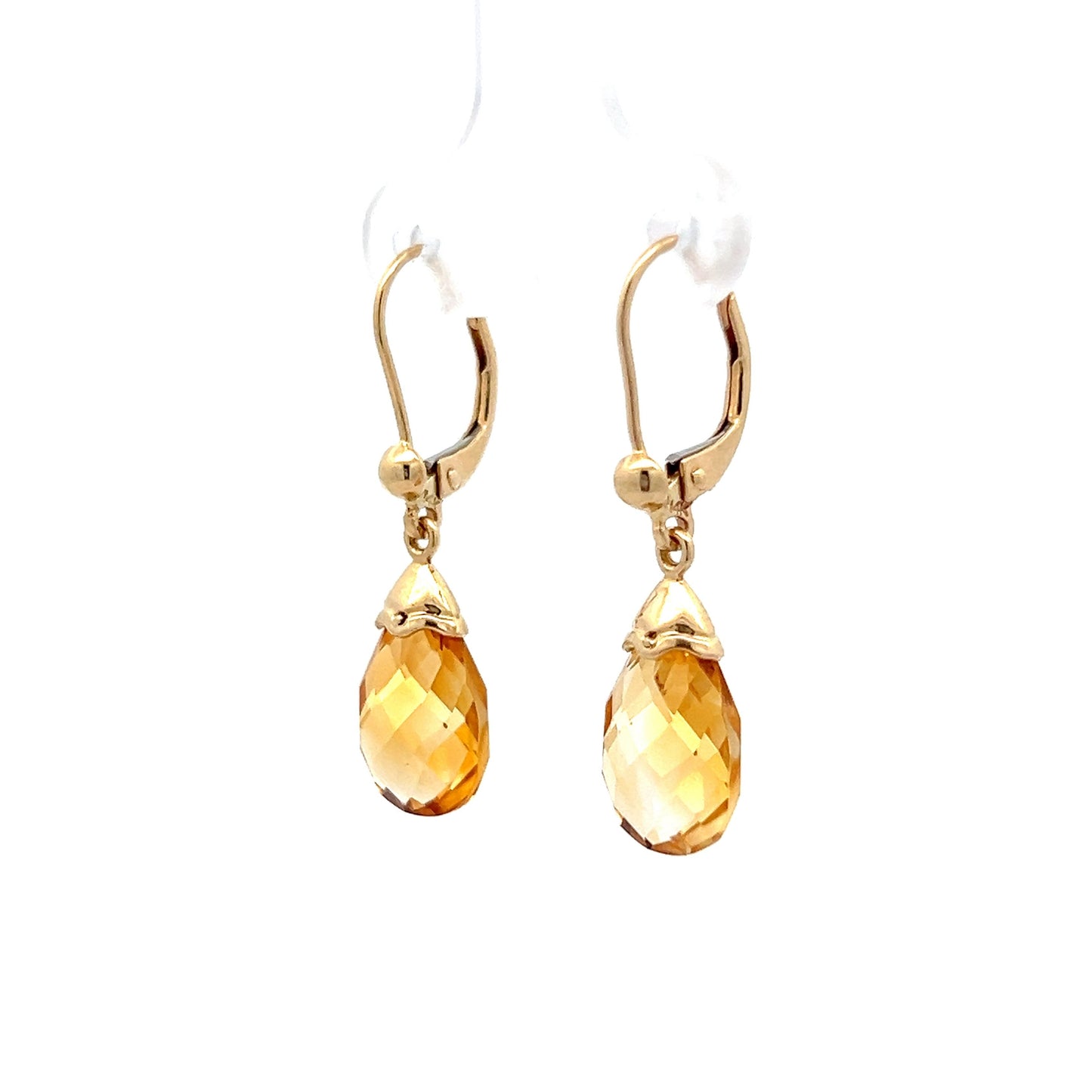 These drop earrings feature a 6.00-carat pear-shaped briolette cut citrine in each earring, offering a warm golden hue that pairs beautifully with the 14 karat yellow gold setting. The polished gold adds a sleek finish, while the drop design allows the earrings to move gracefully. Whether for a special event or everyday wear, these citrine drop earrings bring a vibrant pop of color and style to any look.