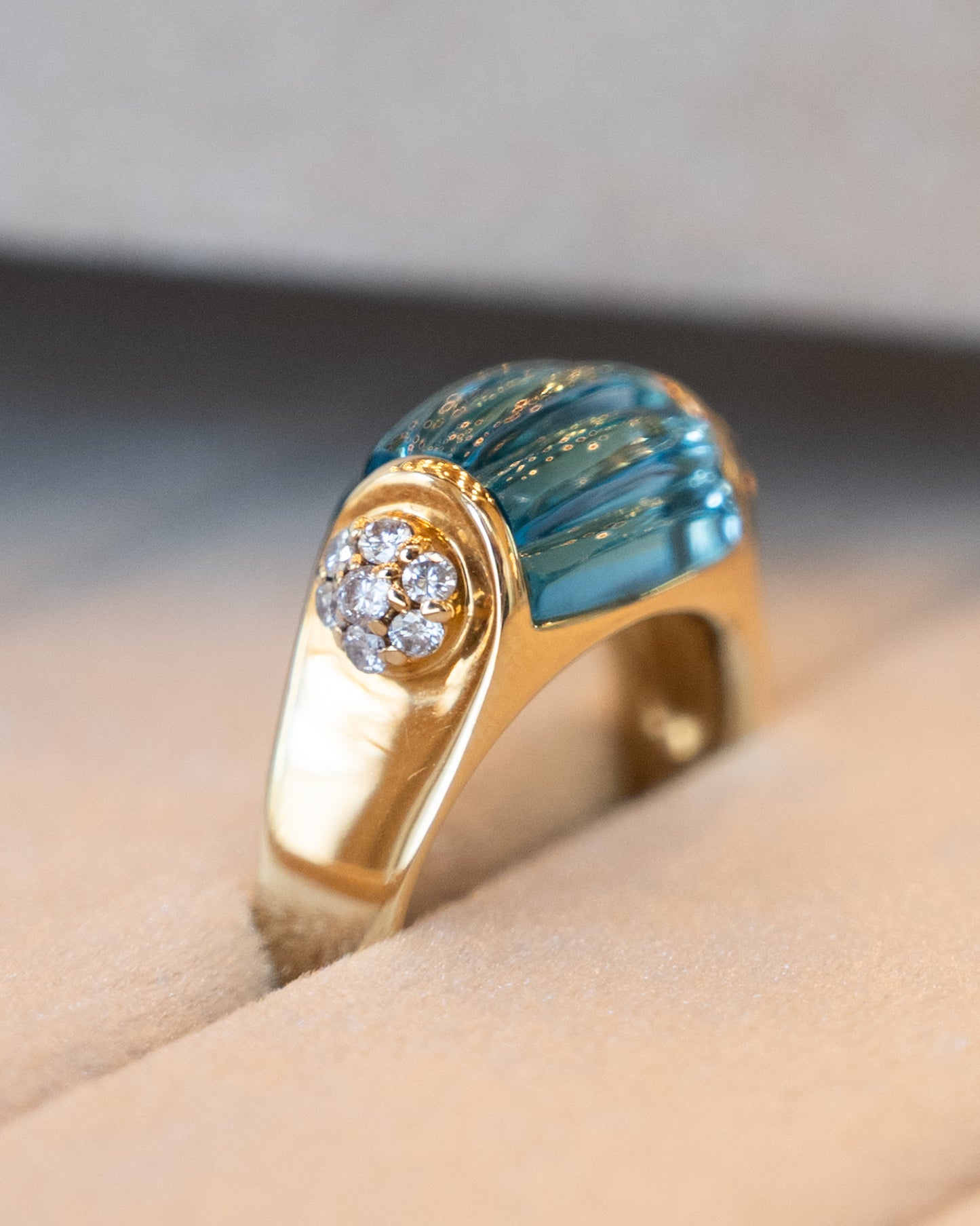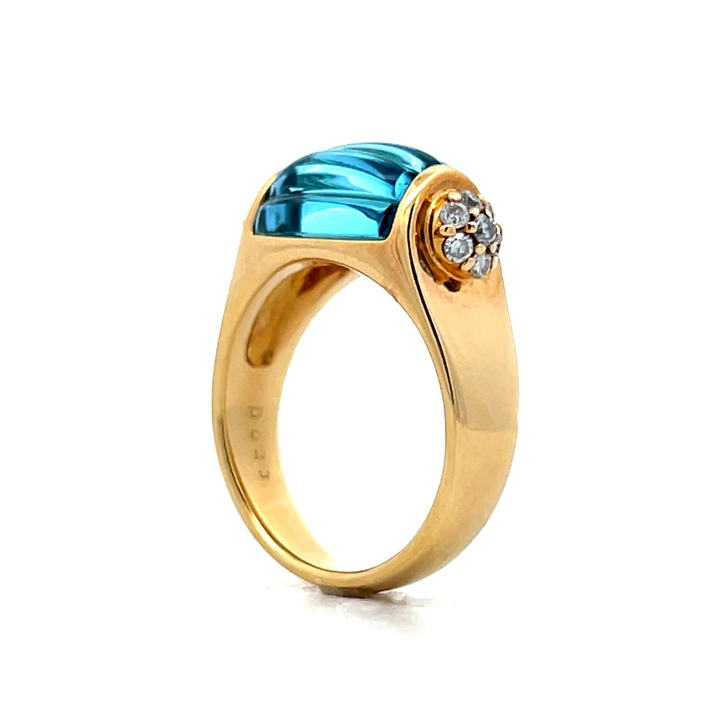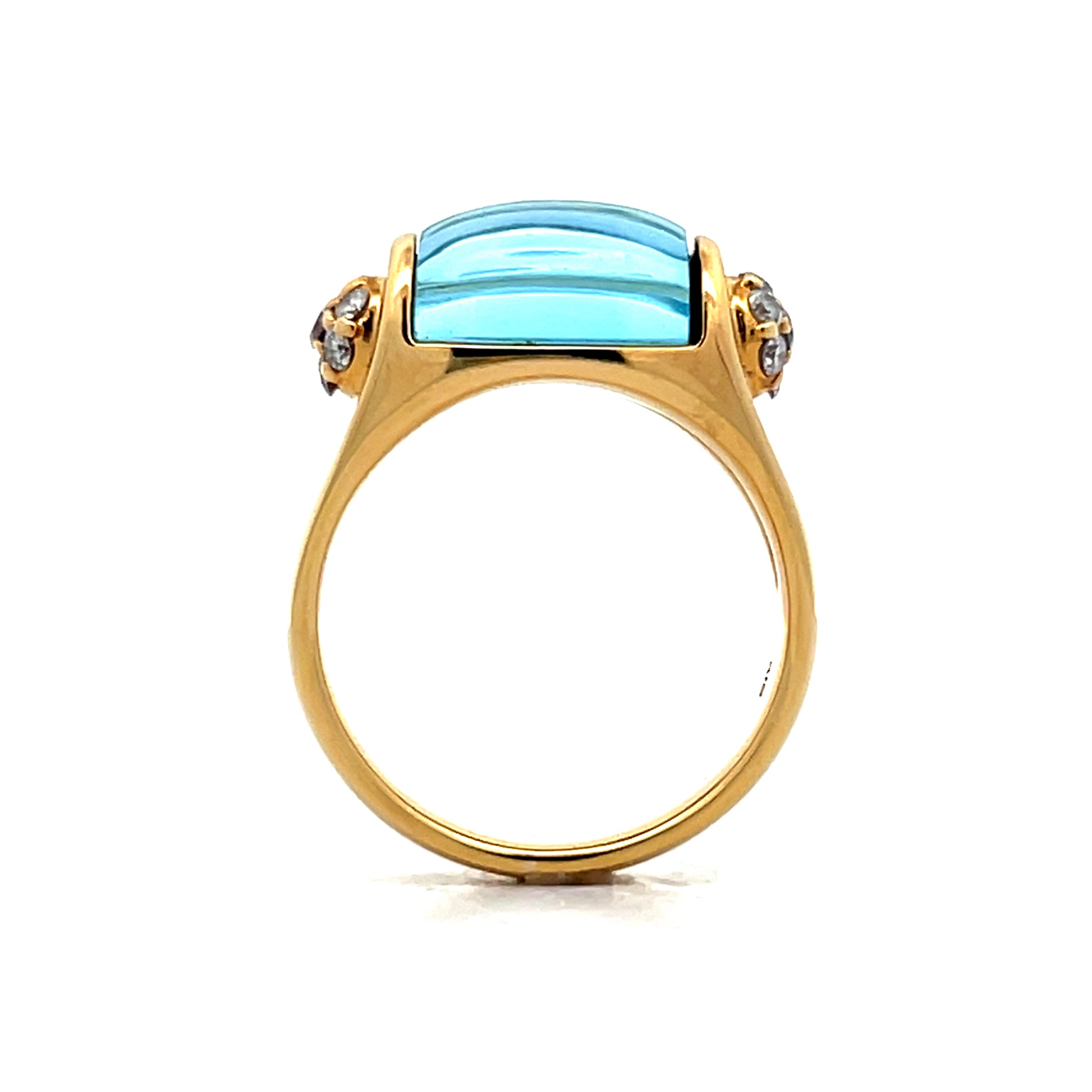 This cocktail ring centers a 6.01 carat blue topaz in cabochon cut, surrounded by fourteen round brilliant cut diamonds totaling .23 carats. The 18 karat yellow gold setting holds each 1.6mm diamond securely around the azure colored center stone. The blue topaz displays a deep sea-like color that shifts beautifully in different lighting.