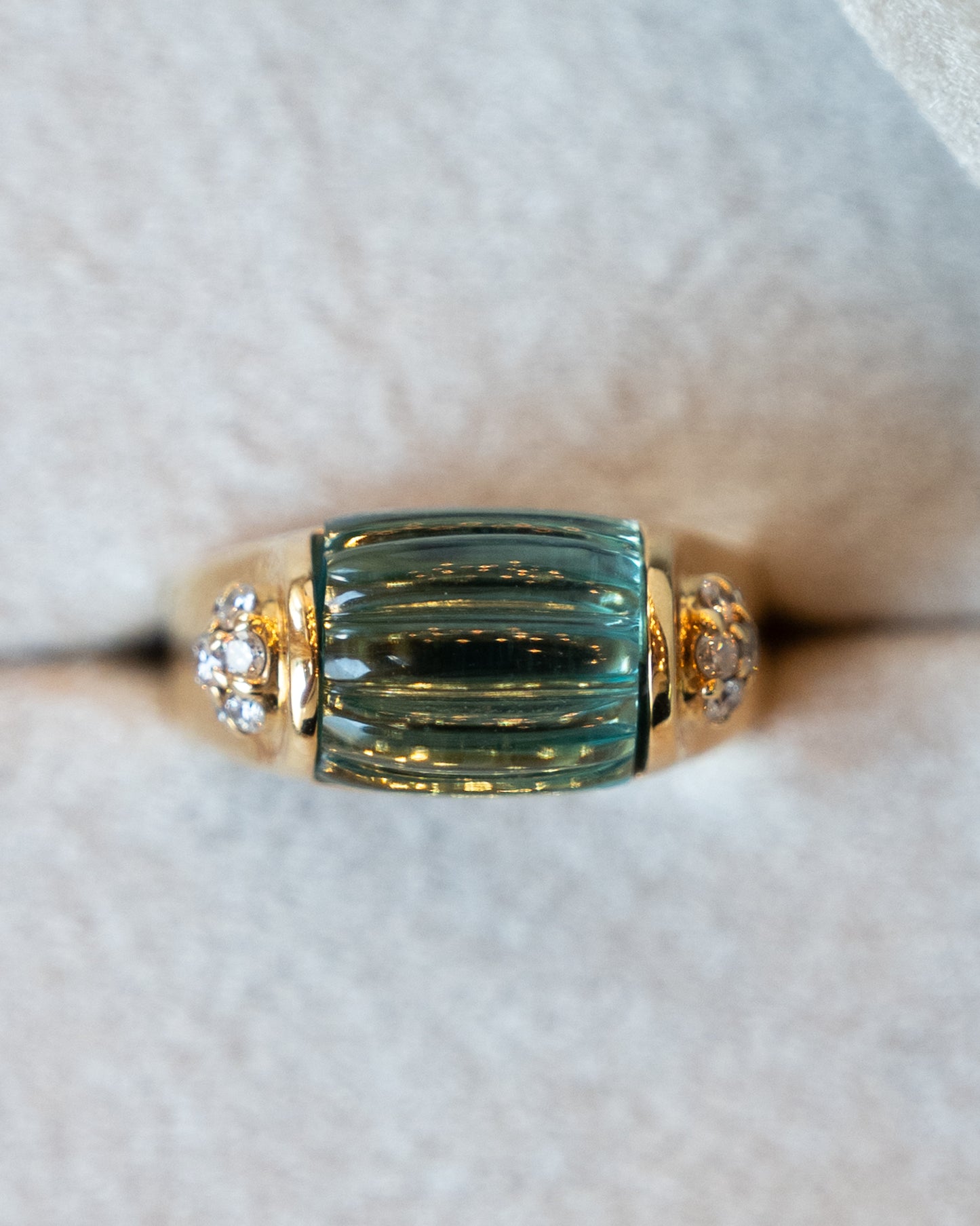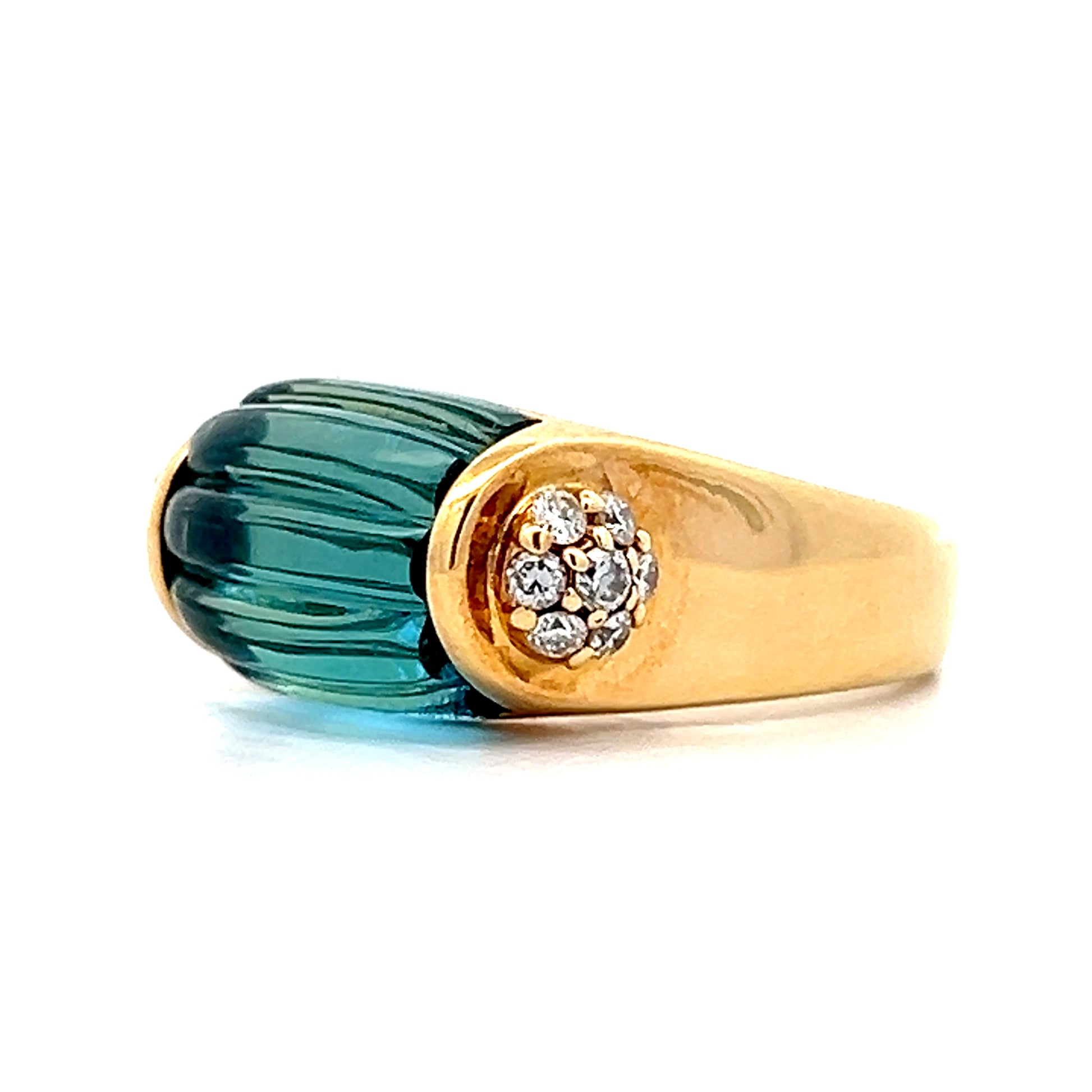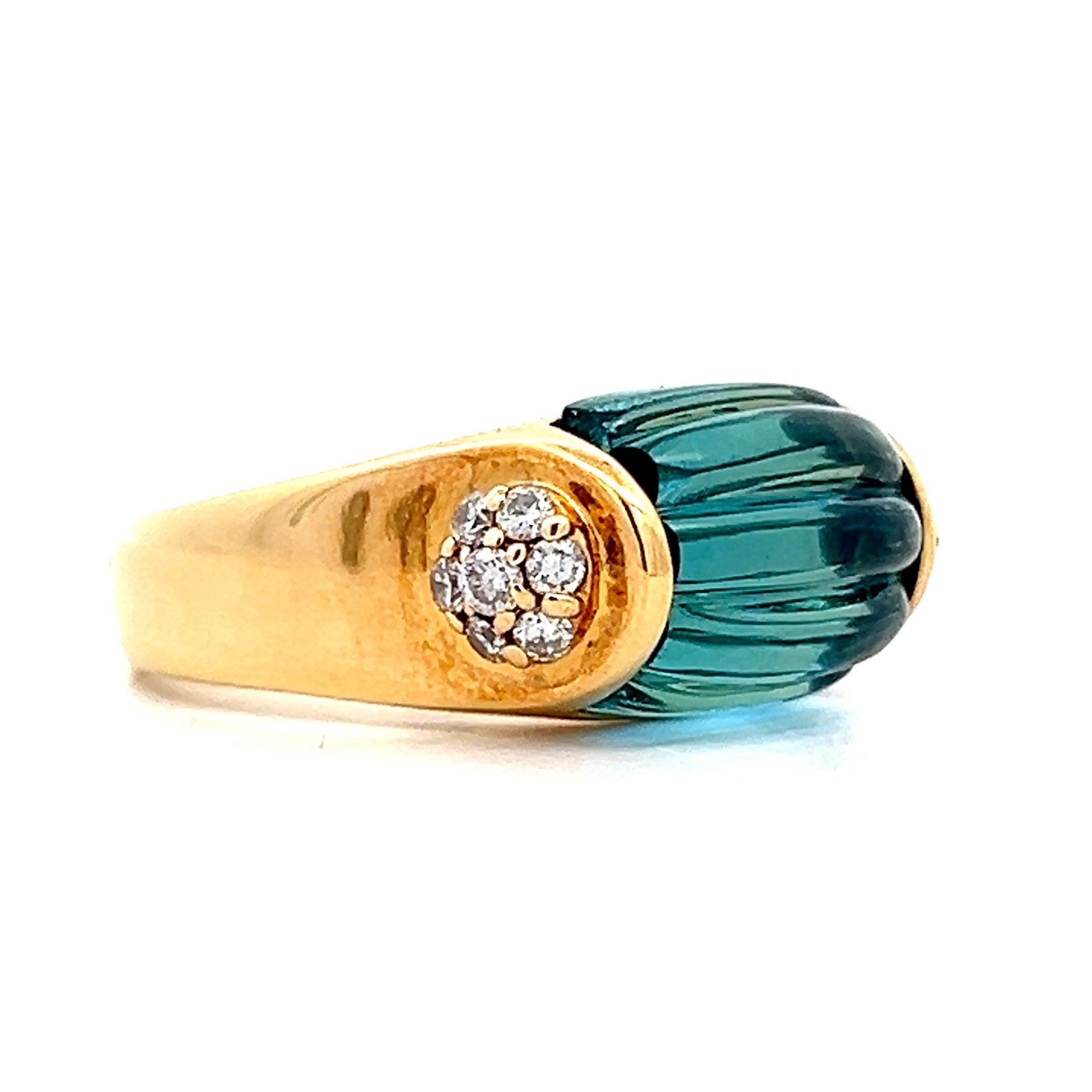 This cocktail ring centers a 6.01 carat blue topaz in cabochon cut, surrounded by fourteen round brilliant cut diamonds totaling .23 carats. The 18 karat yellow gold setting holds each 1.6mm diamond securely around the azure colored center stone. The blue topaz displays a deep sea-like color that shifts beautifully in different lighting.