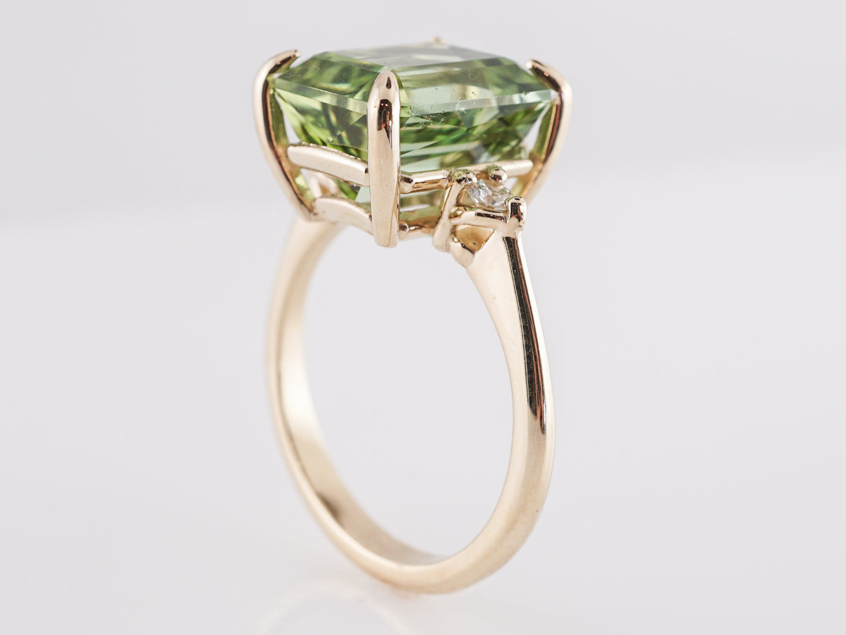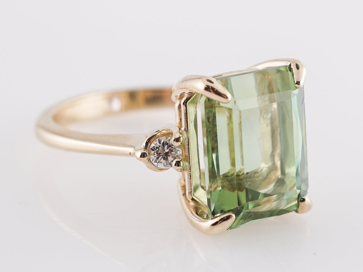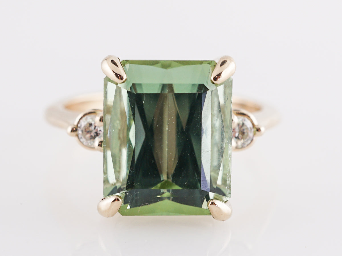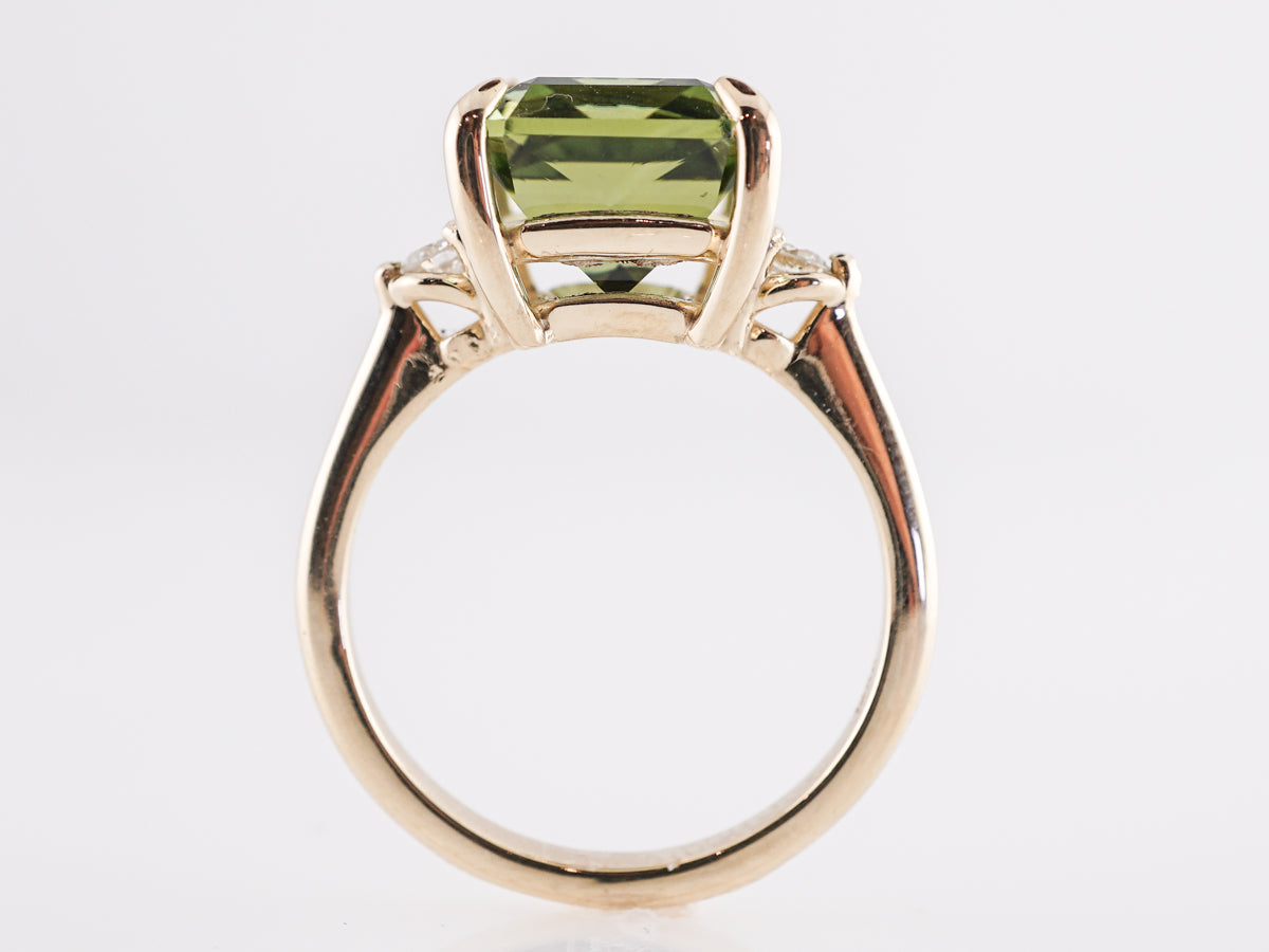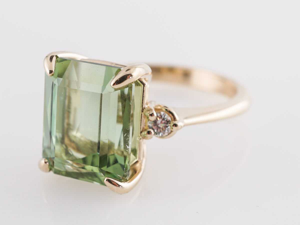 6.19 Tourmaline Cocktail Ring with Diamond Accents. This impressive cocktail ring features a 6.19 carat natural green tourmaline on a 14k yellow gold band. The primary stone is a medium-light matcha green with highlights of pale olive that glitter and glisten in the light. Two accent diamonds, each weighing .05 carats, rest on either side of the primary gemstone. This gorgeous green tourmaline ring would make a stunning gift or family heirloom that can be appreciated for generations!