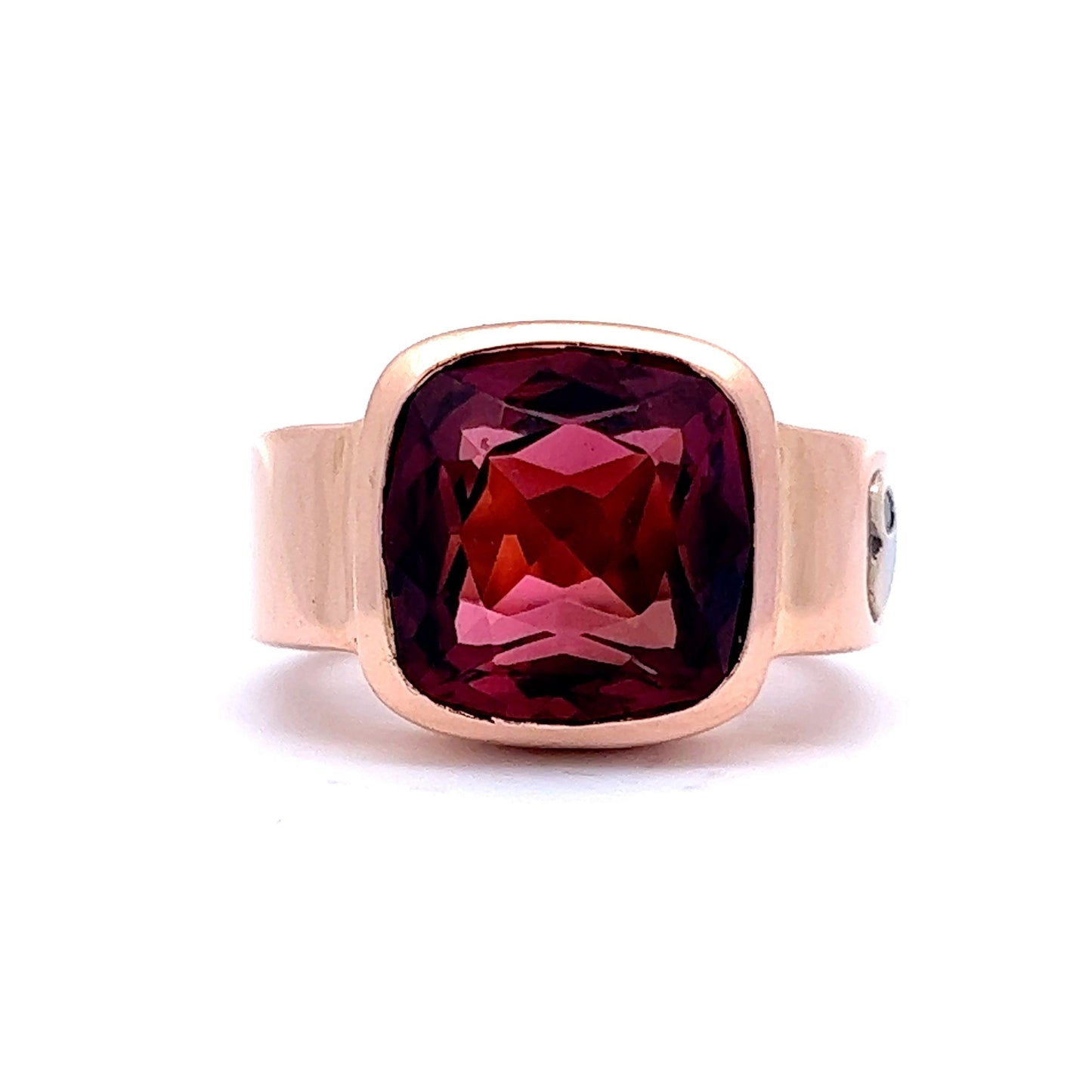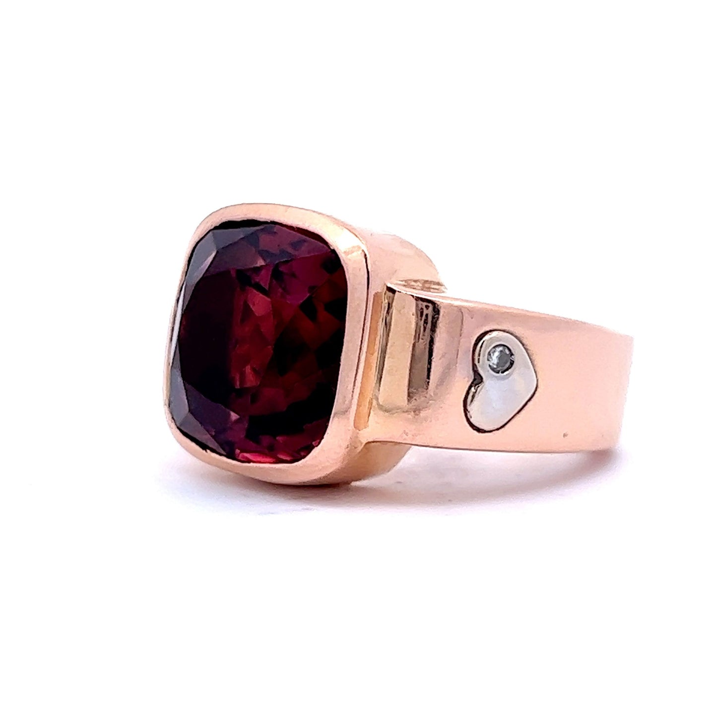 This stylish and modern cocktail ring is certain to cause a stir! Crafted from 18 karat rose gold, the ring features a 6.30 carat cushion cut tourmaline at its center. The stone reflects a subtle pink hue that is enhanced by the warm rose gold metalwork. An inlayed heart adorns one of the shoulders with a single diamond adding a touch of sparkle.