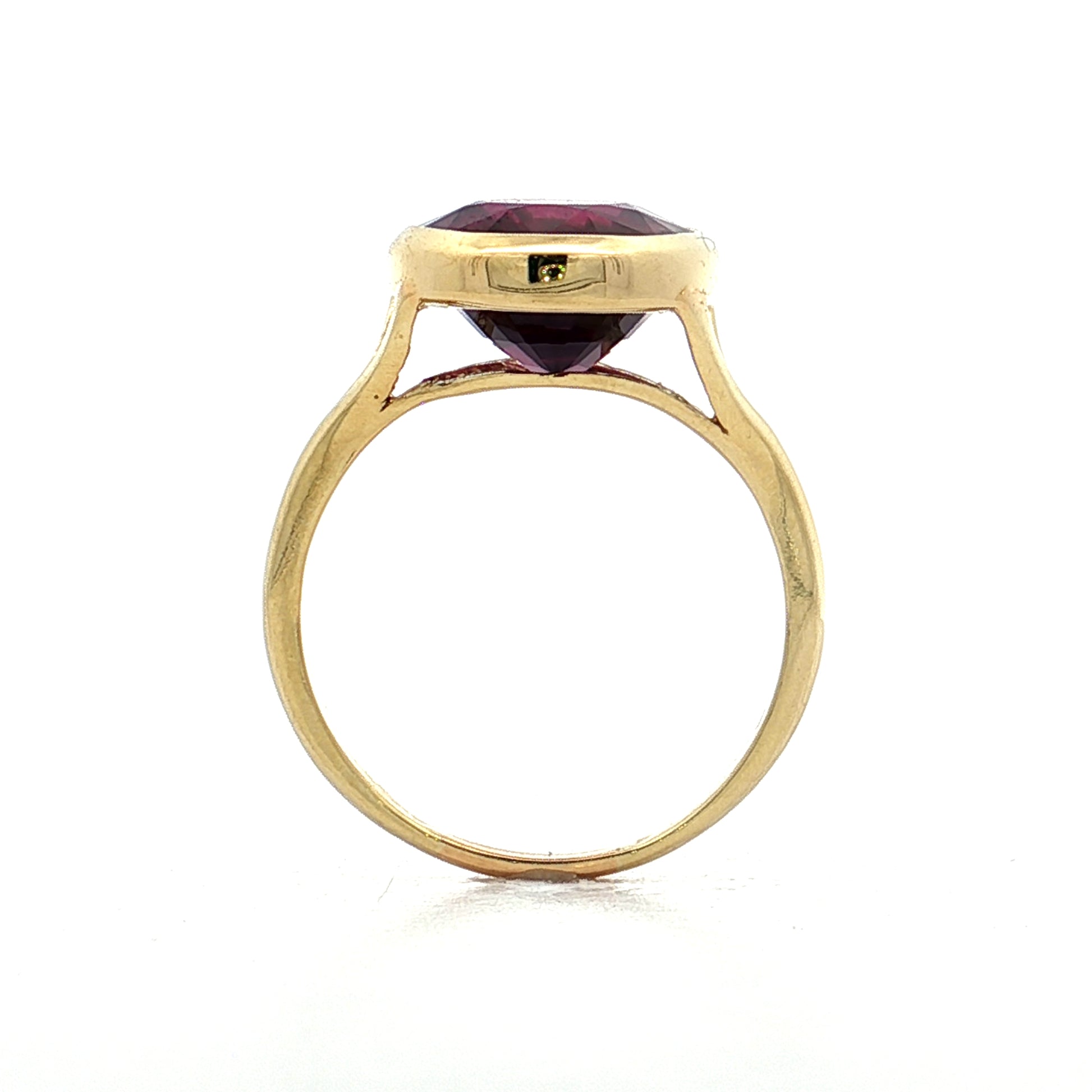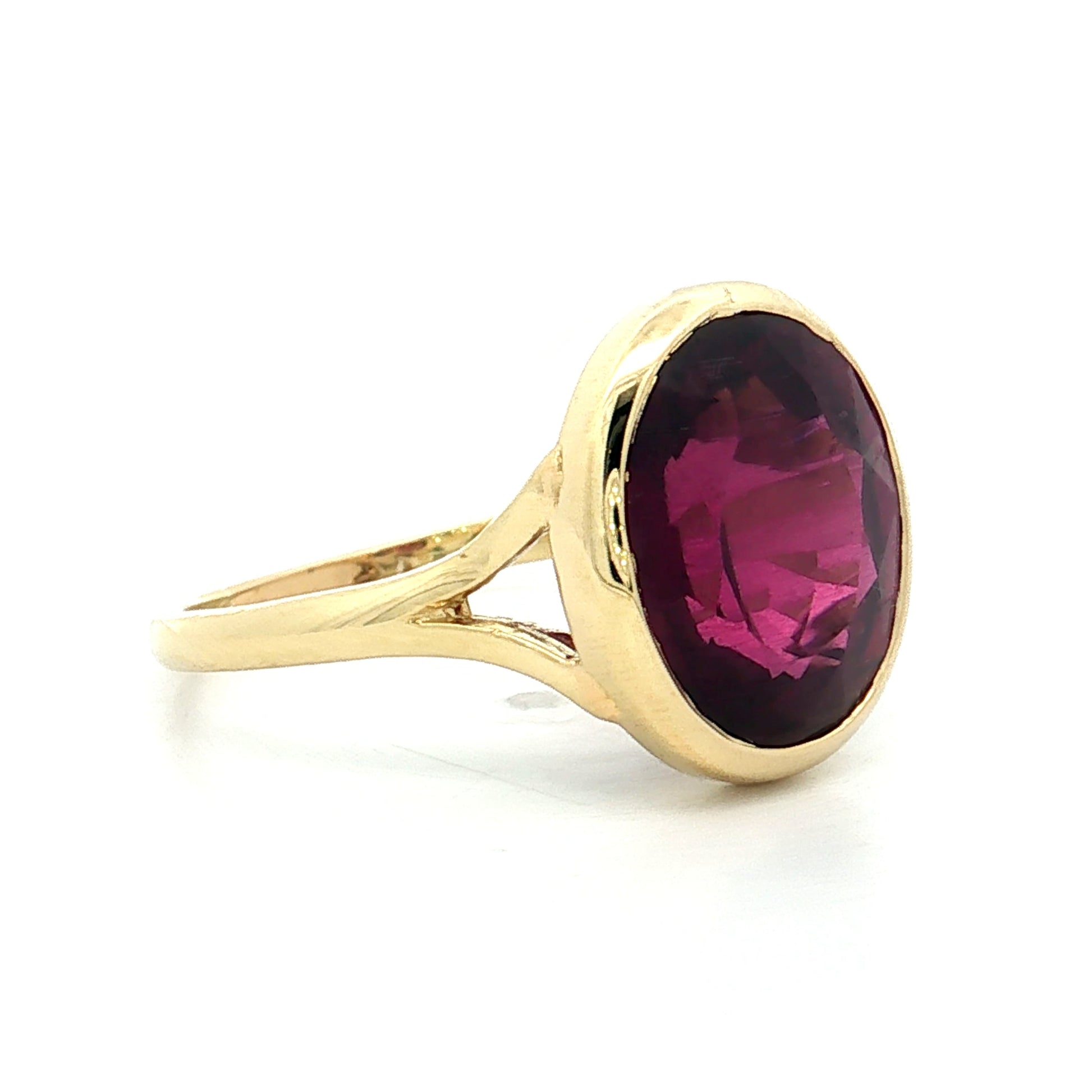 This 18 karat yellow gold cocktail ring features a 6.33 carat oval cut Rhodolite garnet in a bezel setting. Rhodolite garnets display a distinctive purplish-red to raspberry color that's lighter and brighter than standard red garnets.