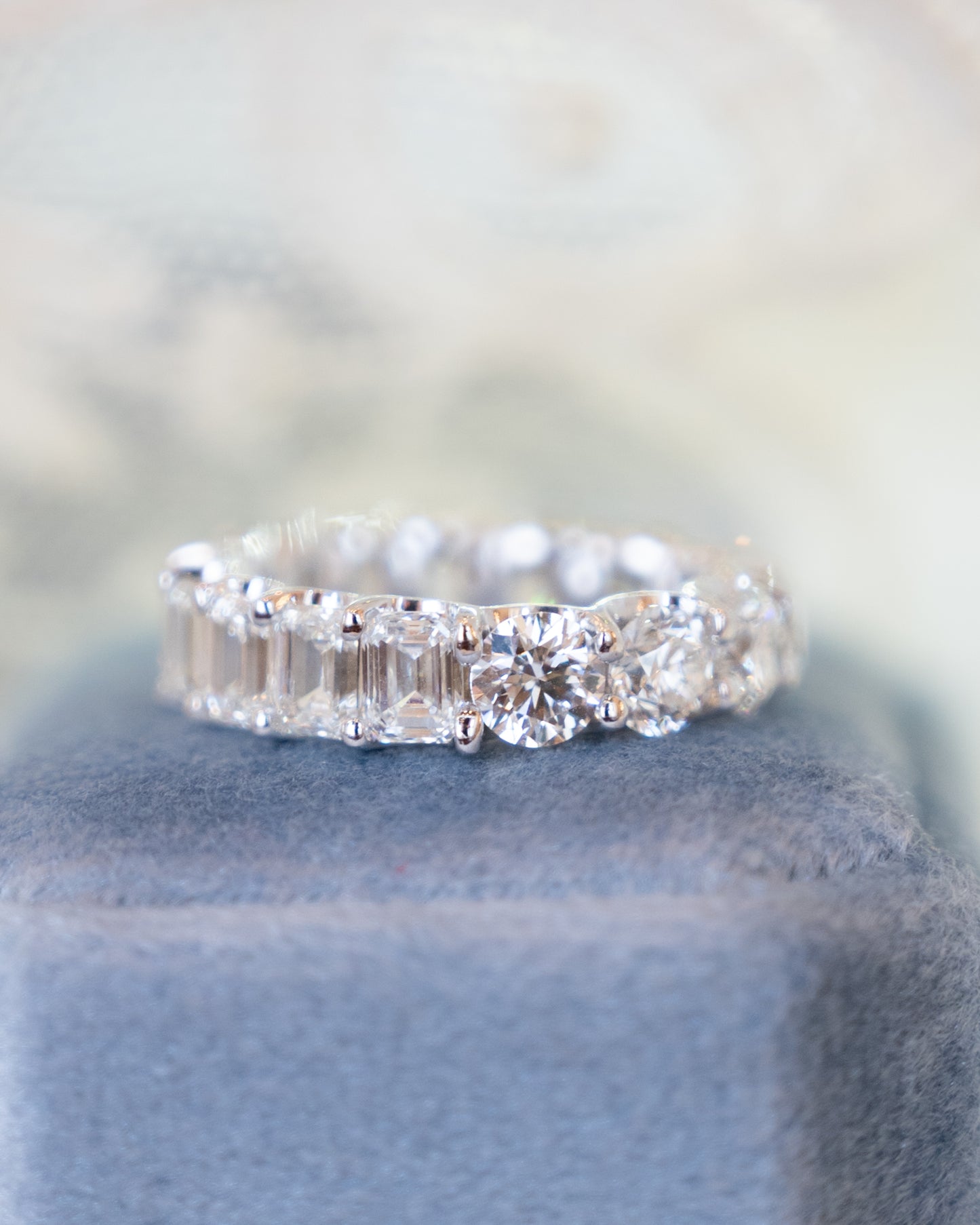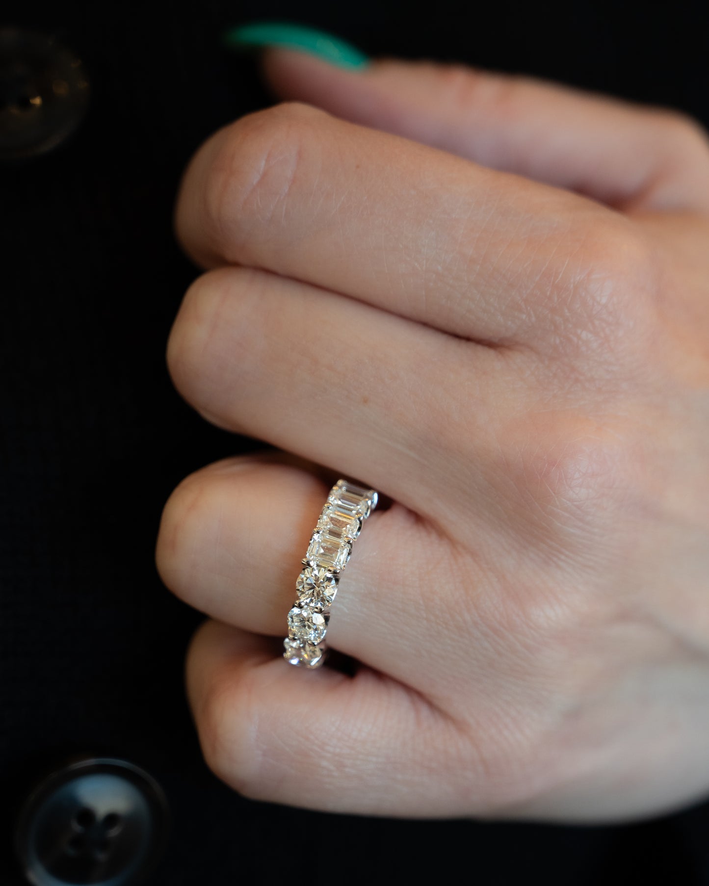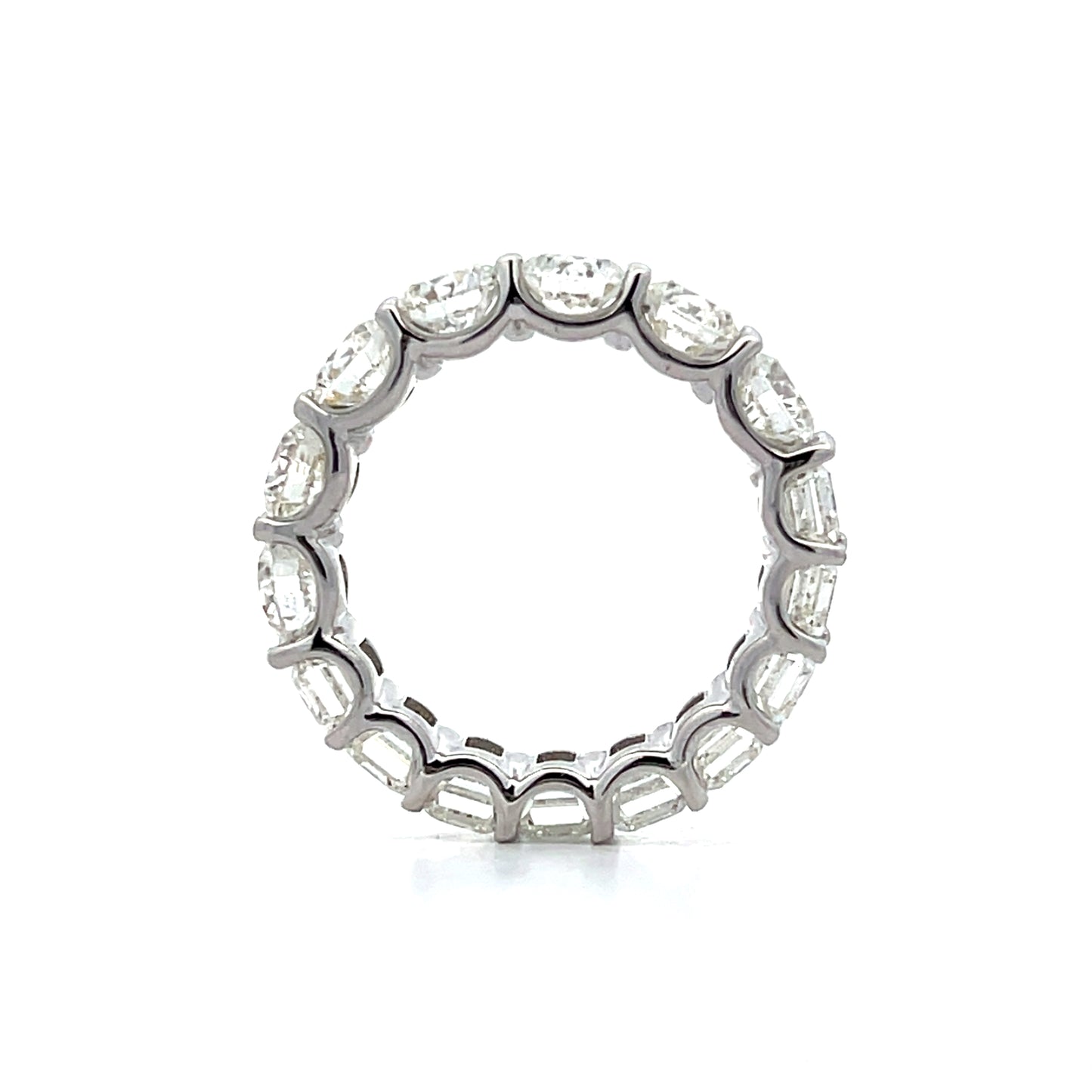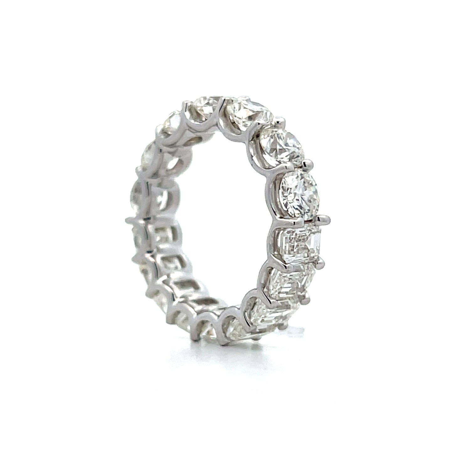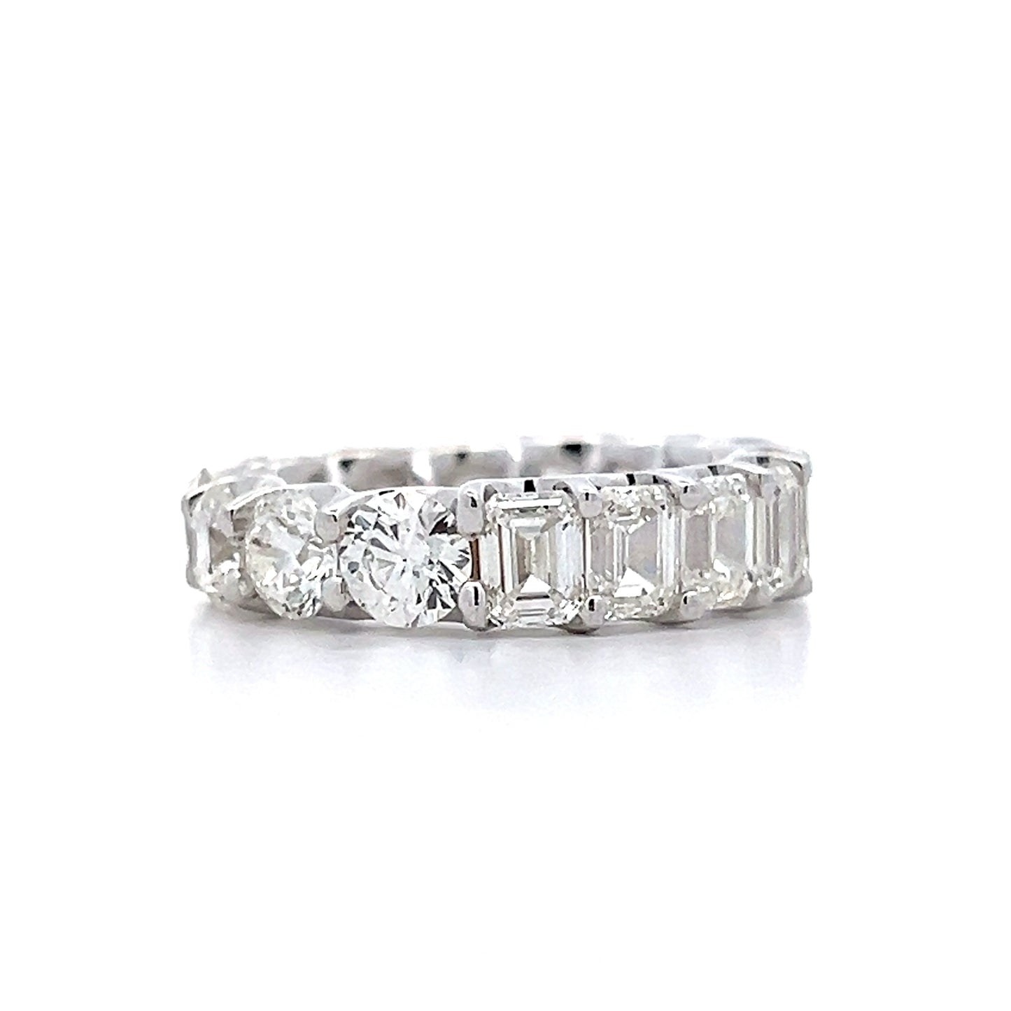 This Modern era diamond eternity band is made from 18 karat white gold with a unique reversible design featuring nine round brilliant cut diamonds on one side and nine emerald cut diamonds on the other.